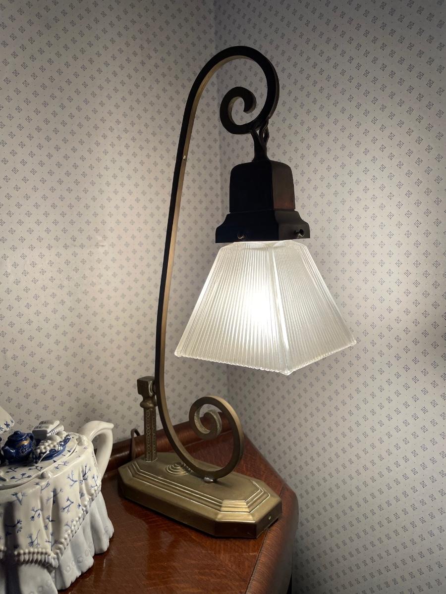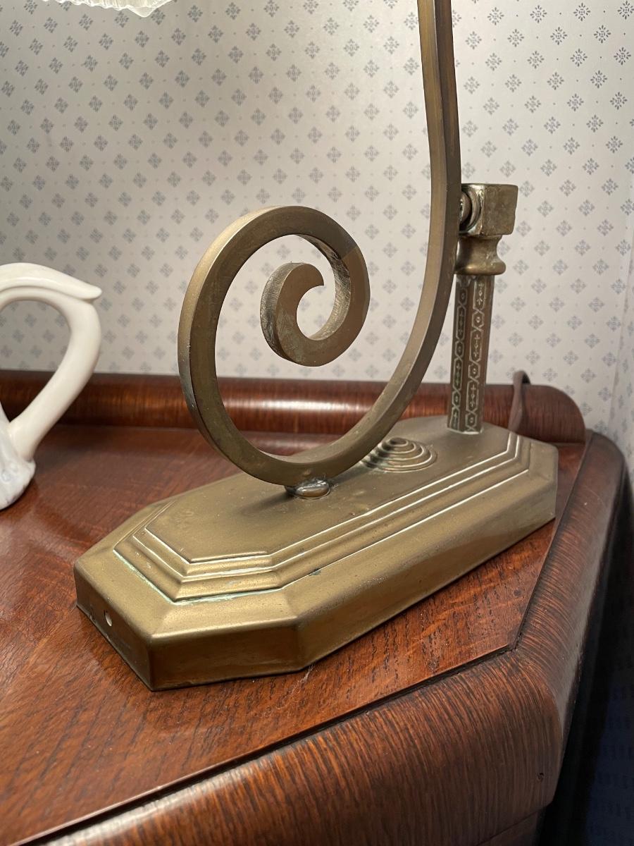 Beautiful old lamp with hanging shade. Take a three way bulb. Some wear to metal.