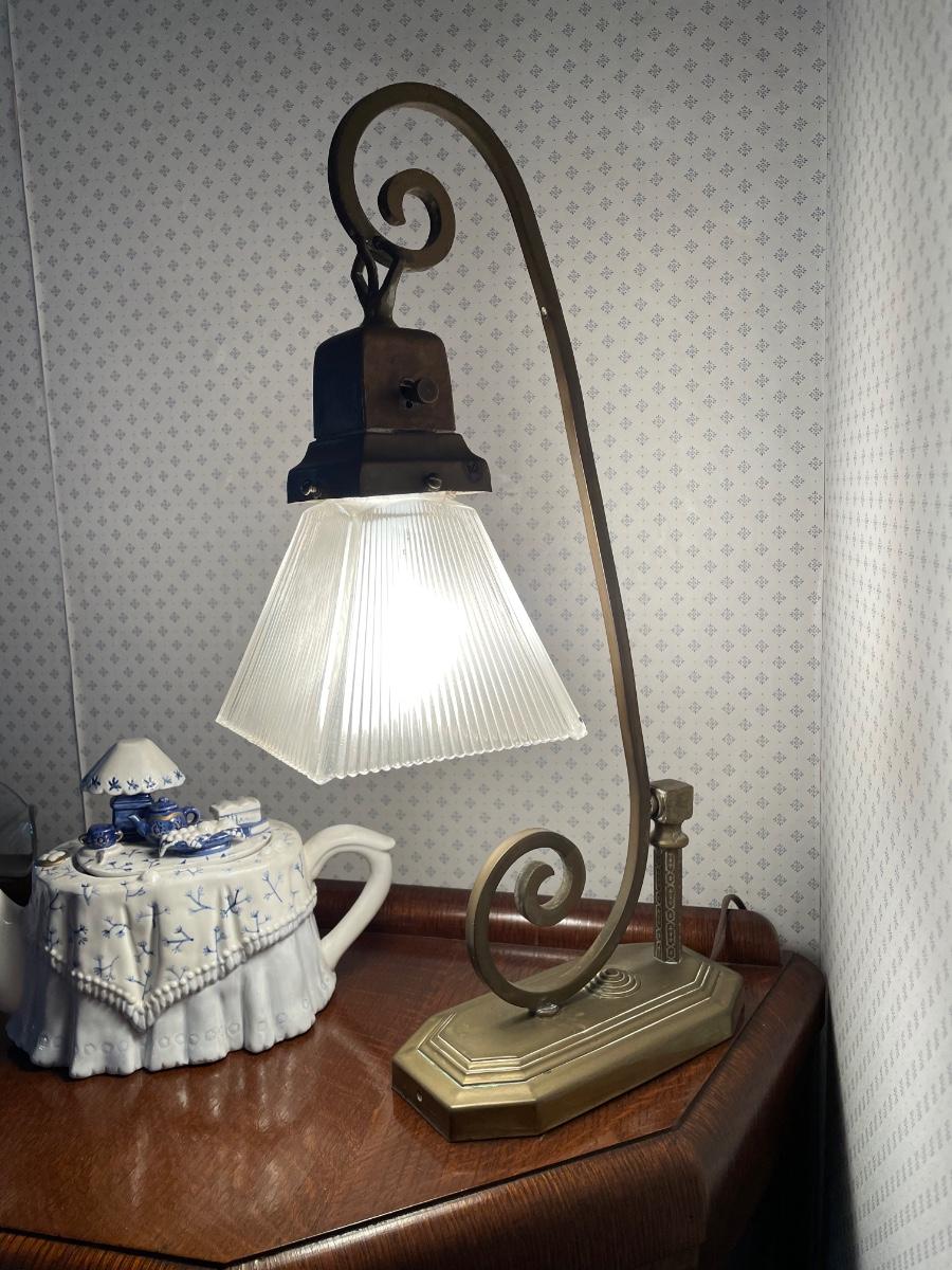 Beautiful old lamp with hanging shade. Take a three way bulb. Some wear to metal.