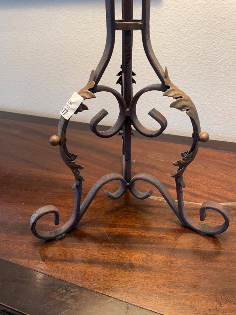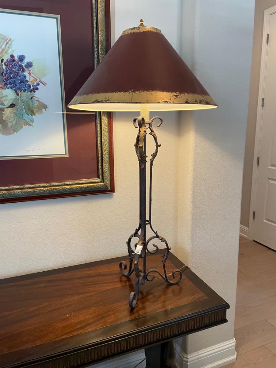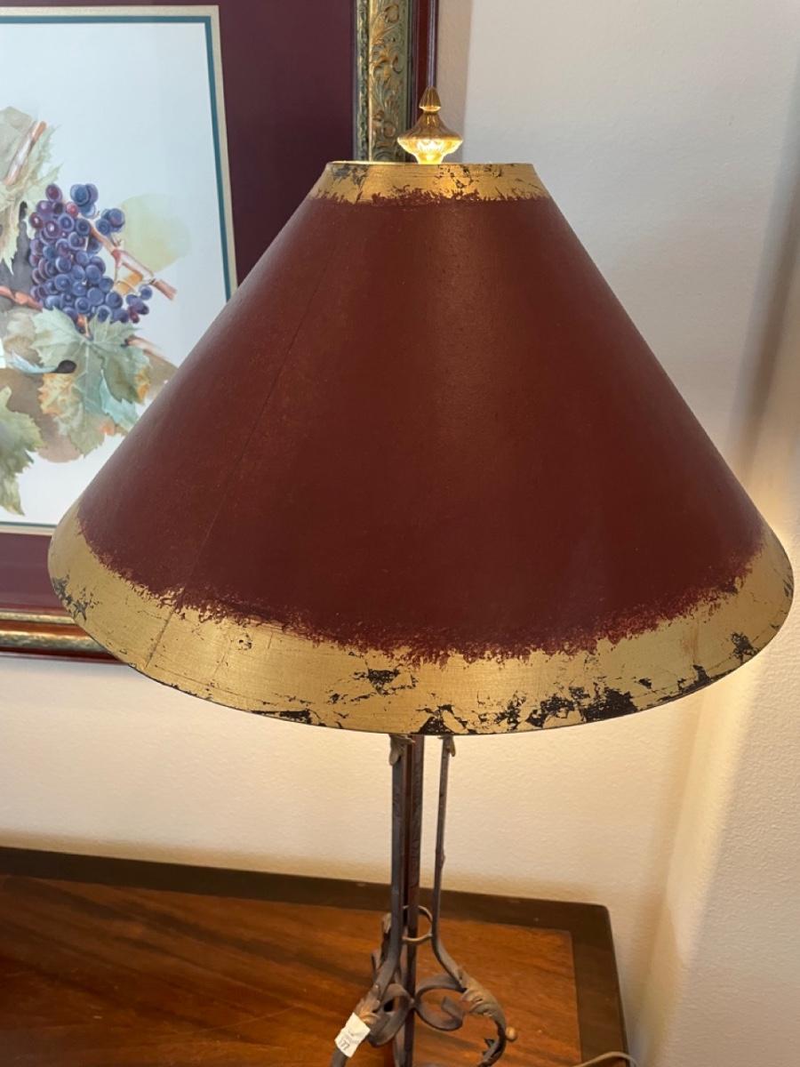 Iron table lamp with red and gold shade. In good condition
