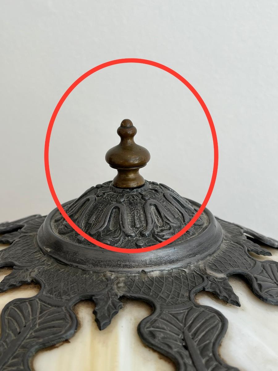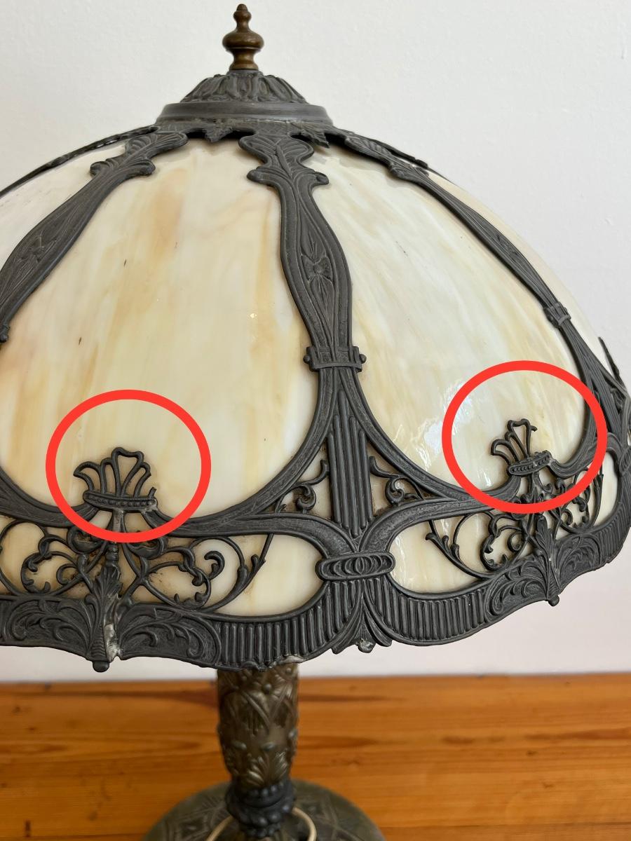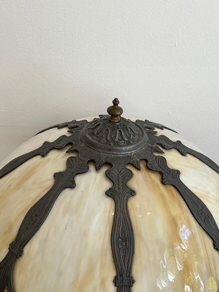 Base & decor around the glass is metal ~ lamp has 3 light settings, both bulbs can be lit at the same time & each bulb can be lit separately ~ It appears to not have the original finial ~ Glass shade does have minor damage on metal & glass due to age, see photos ~ 25” H x 18” Round