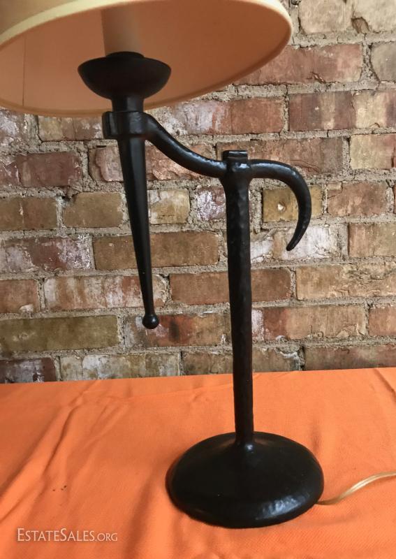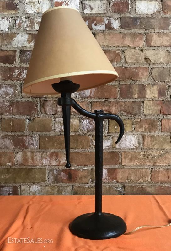 Rustic iron table lamp with shade, 20" tall, single bulb.