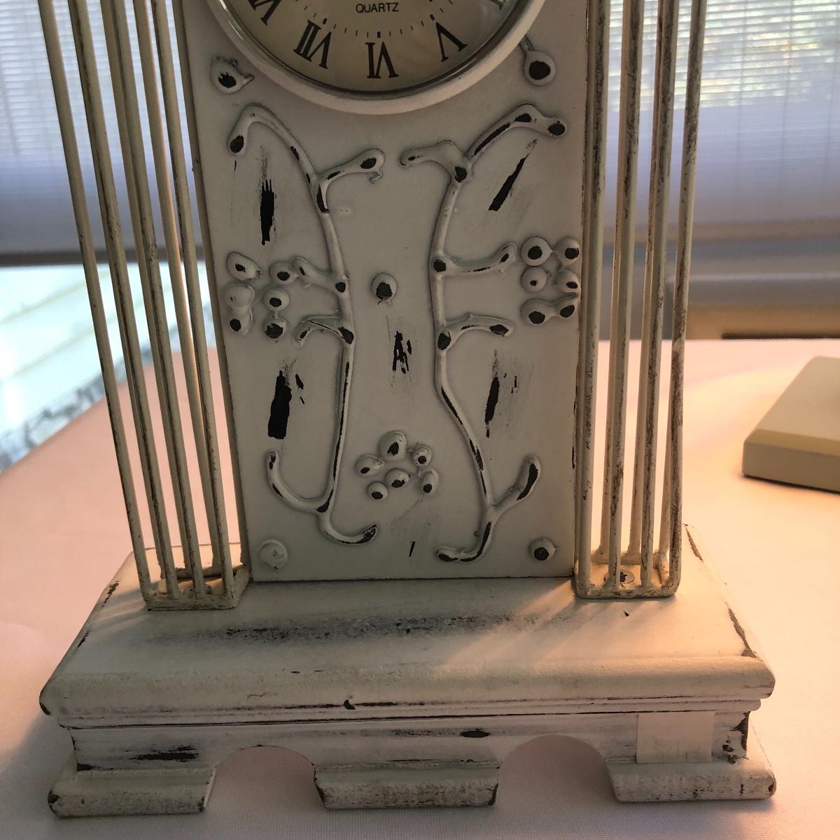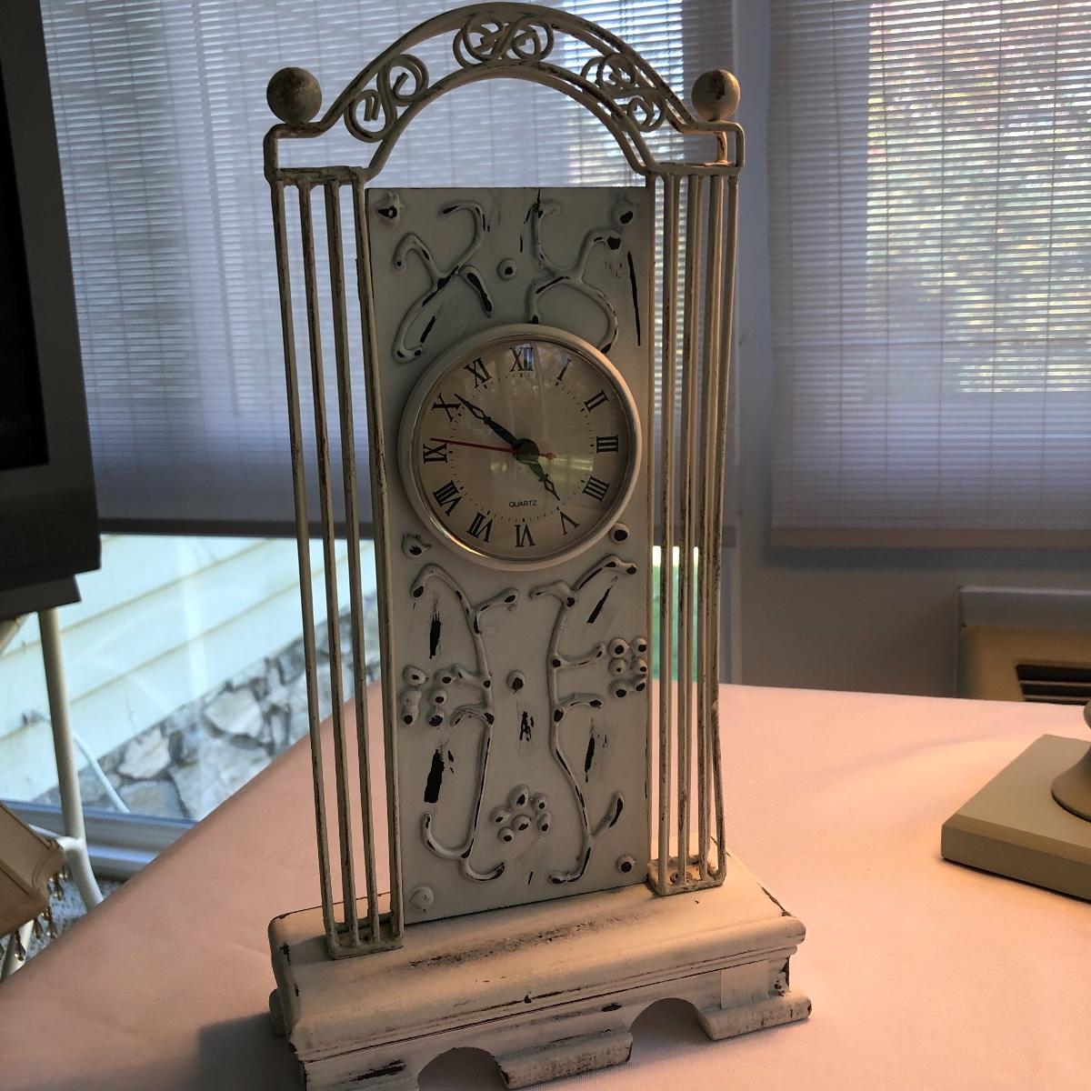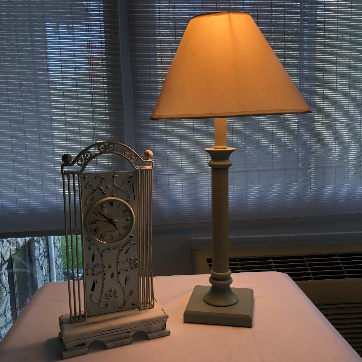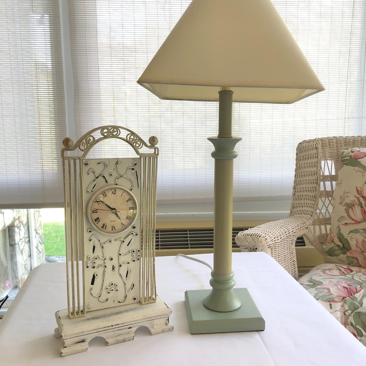 This lot includes a wooden table lamp and metal distressed looking table clock. Not able to test the clock as it needs a new battery. It is 13.5" tall. The lamp stands approximately 22” tall and operates when plugged in. Local pick up only.