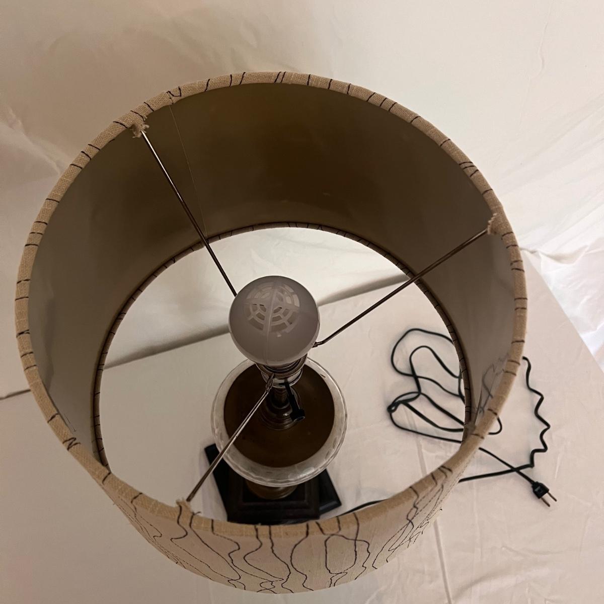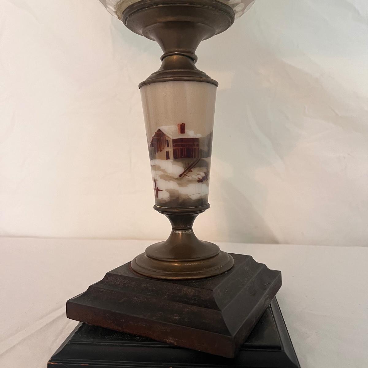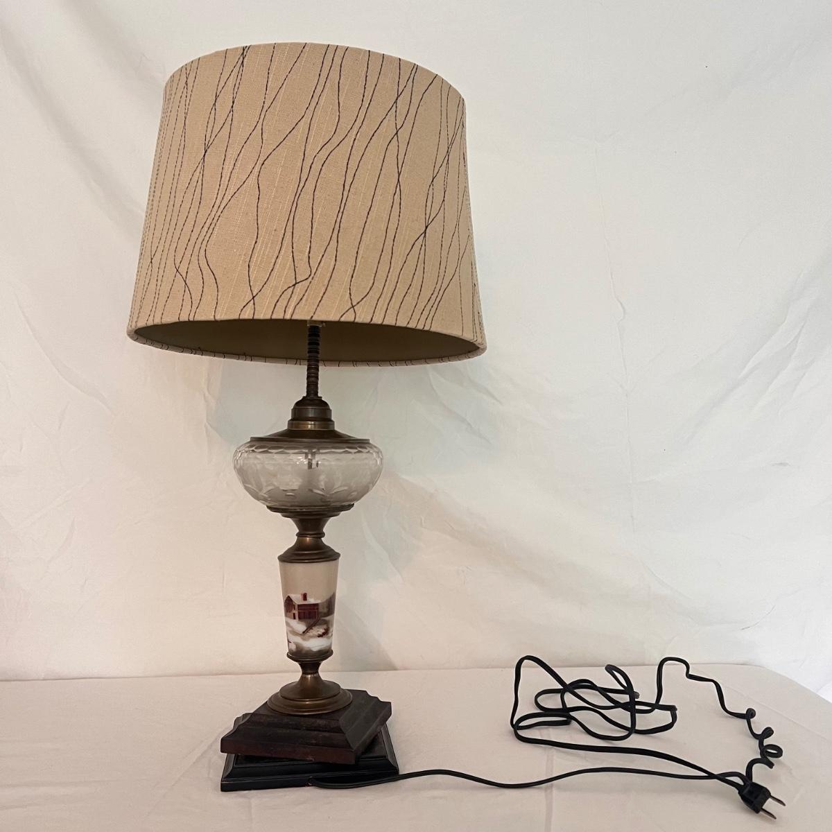 This table lamp has a Victorian style with glass and brass features. The winter scene appears to be hand-painted and the glass has floral etchings. The lamp has normal wear and tear for its age - see picture included. The lamp (lampshade included) measures 12" x 12" x 24"H. Lamp powered on when plugged in. Shipping available. Shipping can be costly. We suggest contacting our preferred local shipping provider, Postage Express, with dimensions and getting an estimate before bidding: (828) 255-9250 or shipping@postageexpressnc.com.