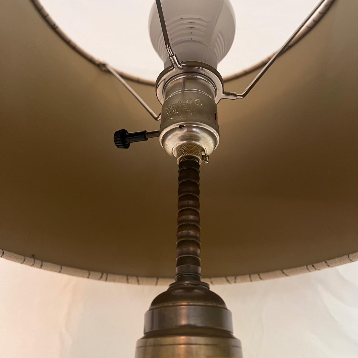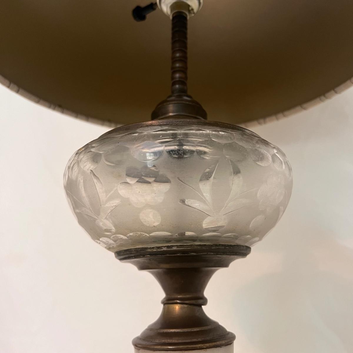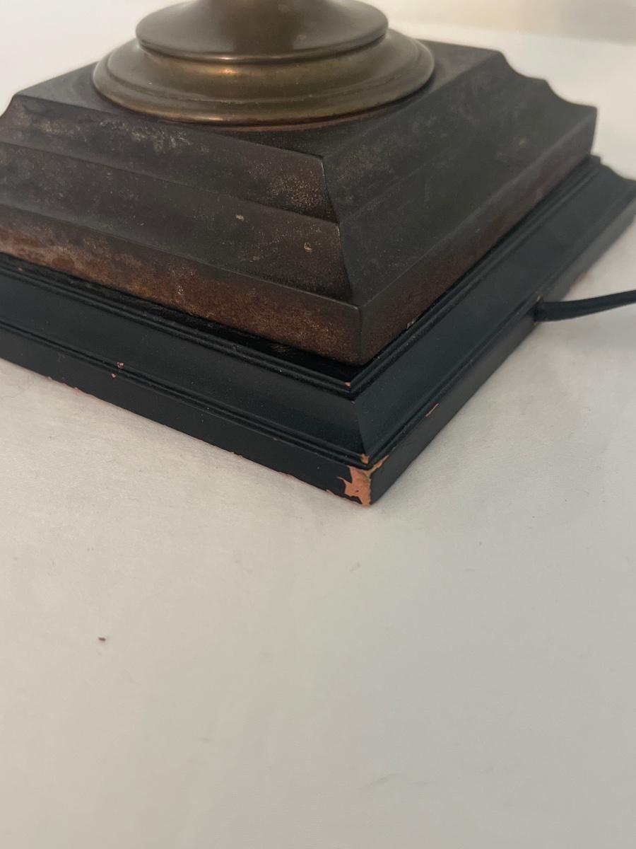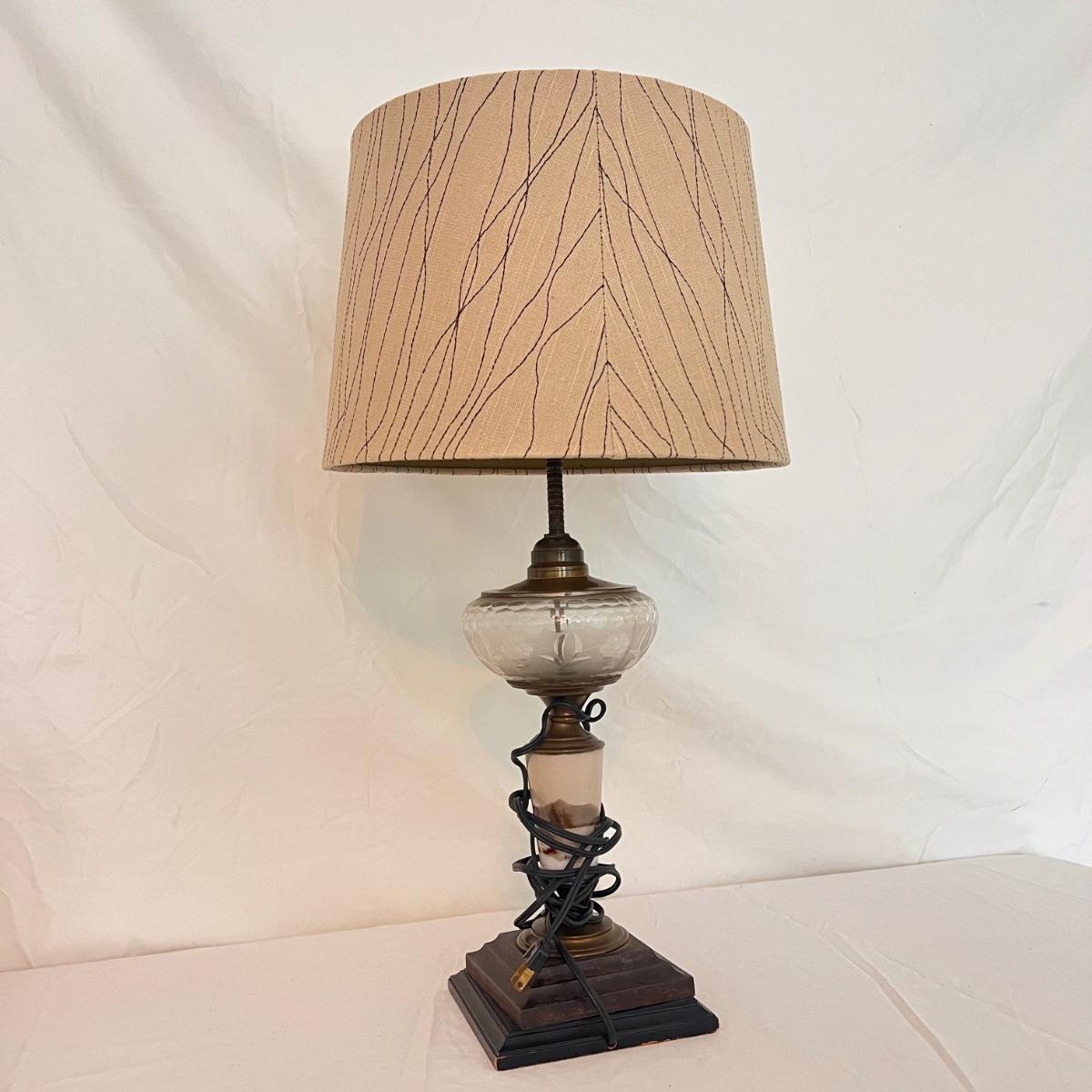 This table lamp has a Victorian style with glass and brass features. The winter scene appears to be hand-painted and the glass has floral etchings. The lamp has normal wear and tear for its age - see picture included. The lamp (lampshade included) measures 12" x 12" x 24"H. Lamp powered on when plugged in. Shipping available. Shipping can be costly. We suggest contacting our preferred local shipping provider, Postage Express, with dimensions and getting an estimate before bidding: (828) 255-9250 or shipping@postageexpressnc.com.