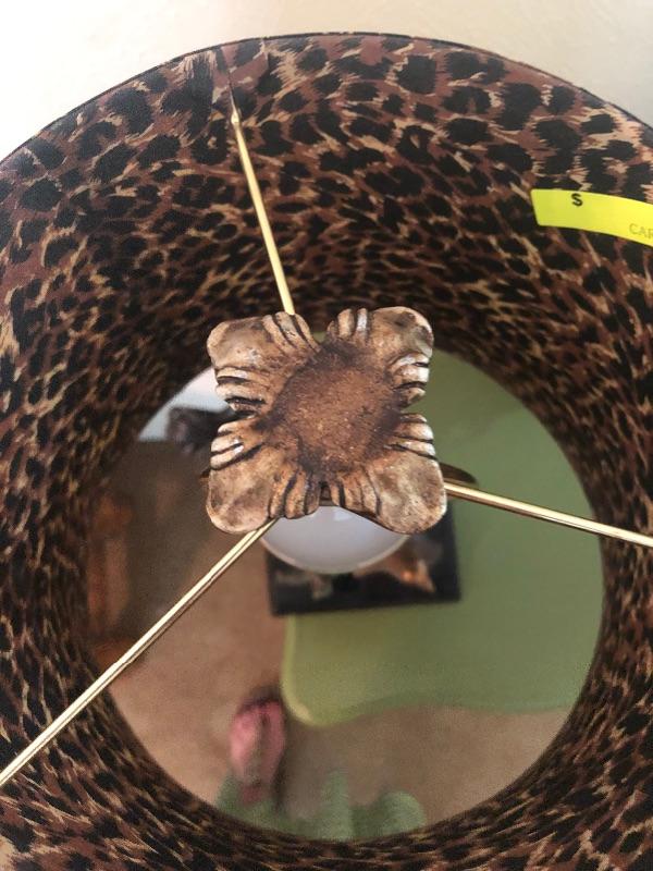 Table lamp with cream colored lampshade that has brown and black trim with bird figure on the base