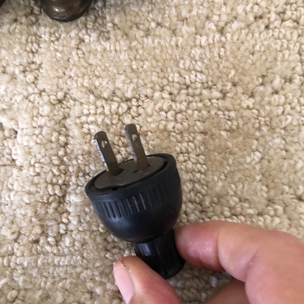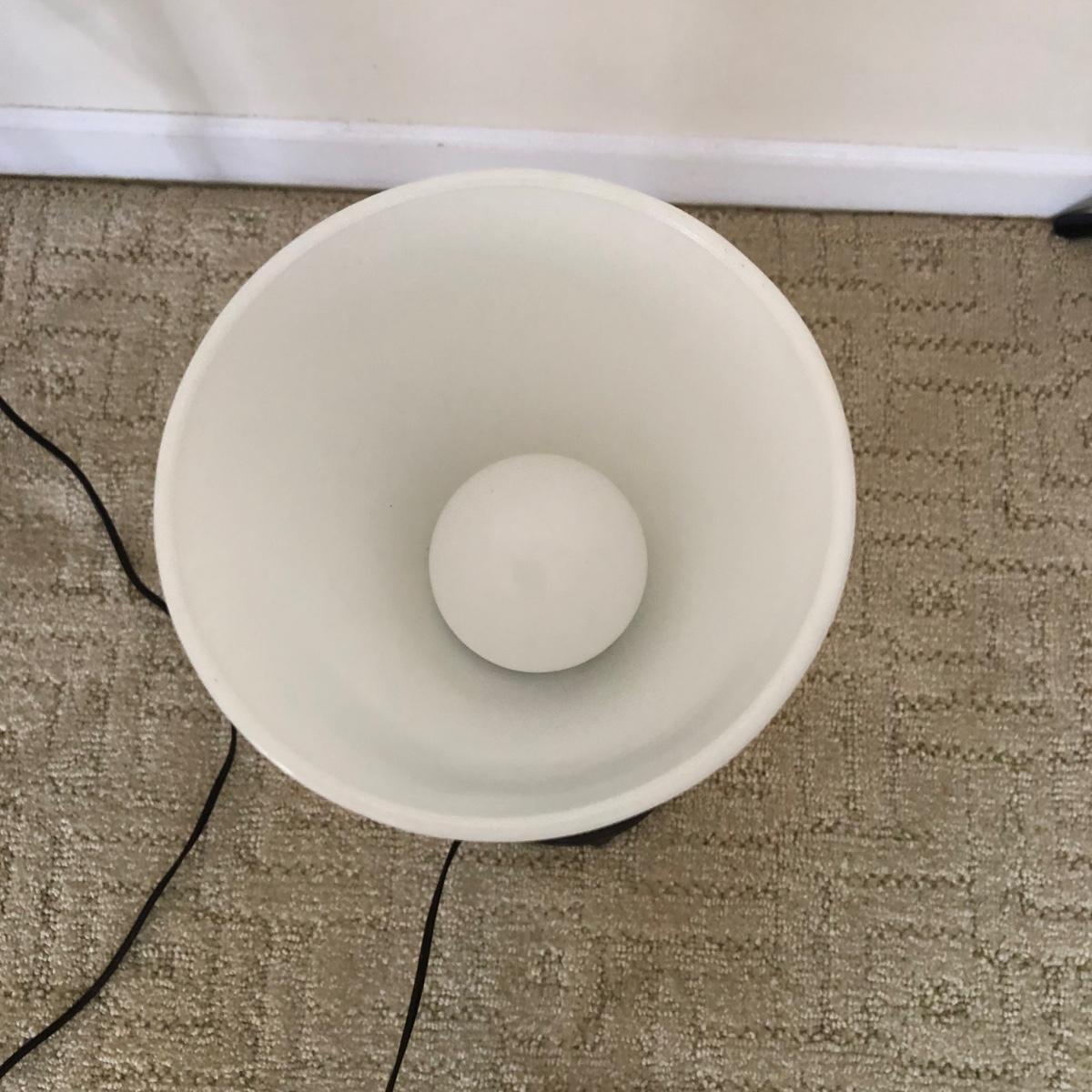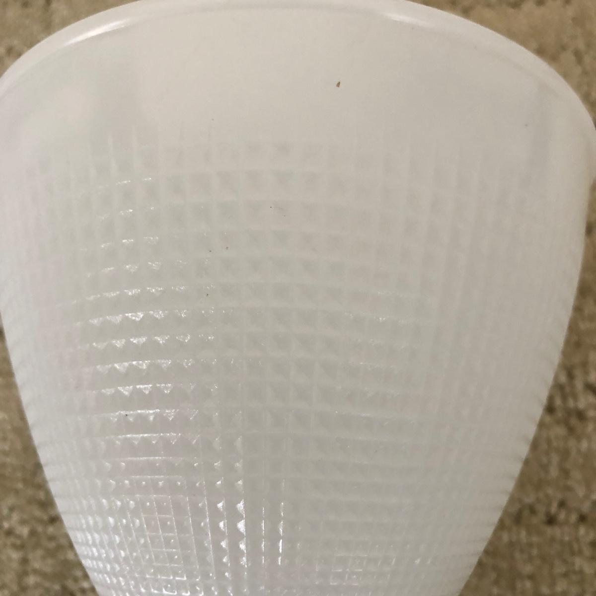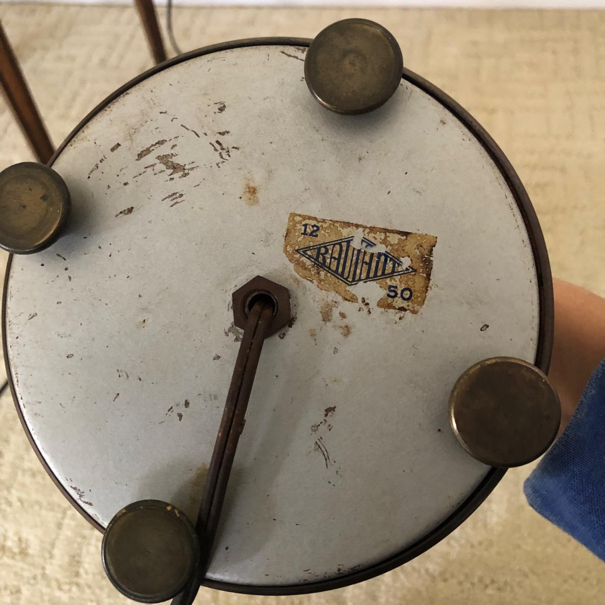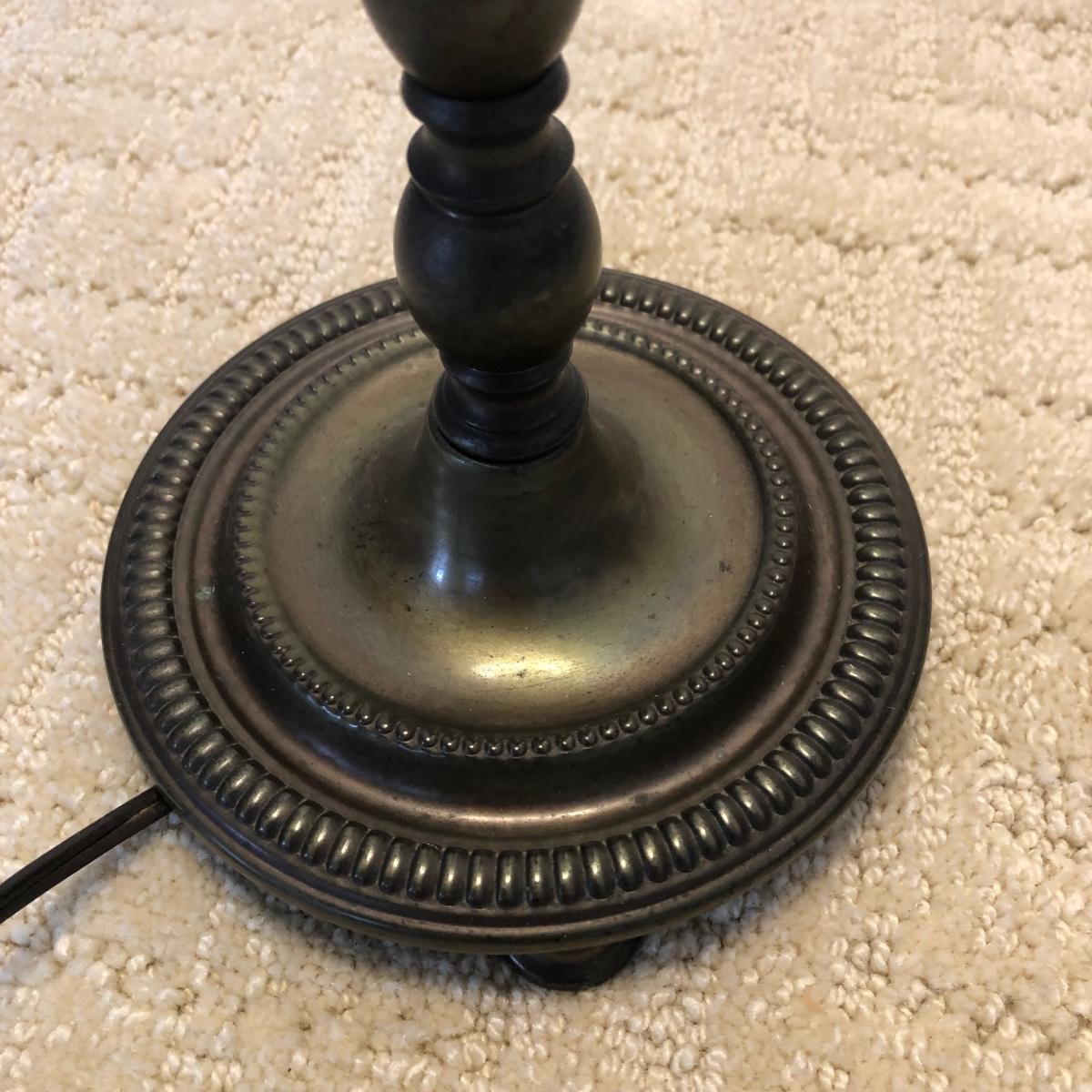 This vintage lamp turns on when tested. Its’ base measures 5.5” in diameter. And stands 19.5” tall. The lamp is heavy and made of metal. The shade has a cross-cross pattern on it. Note label on base. Shipping Available.