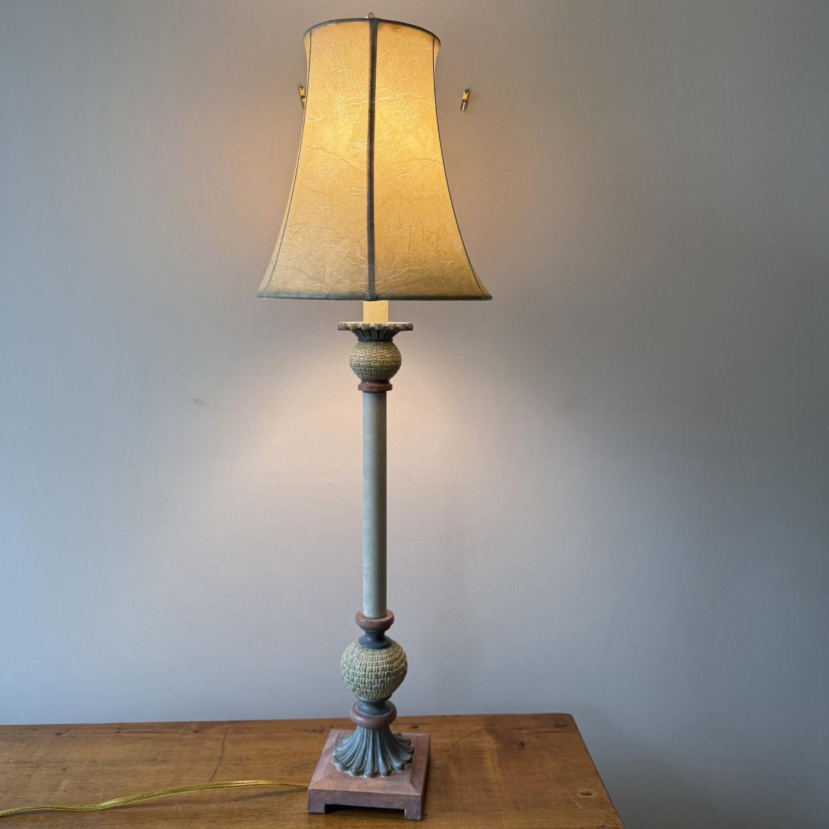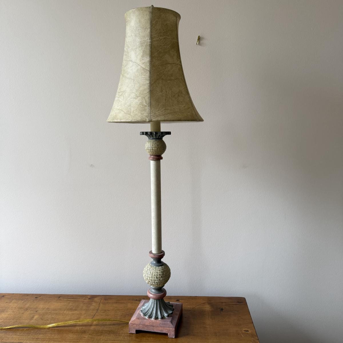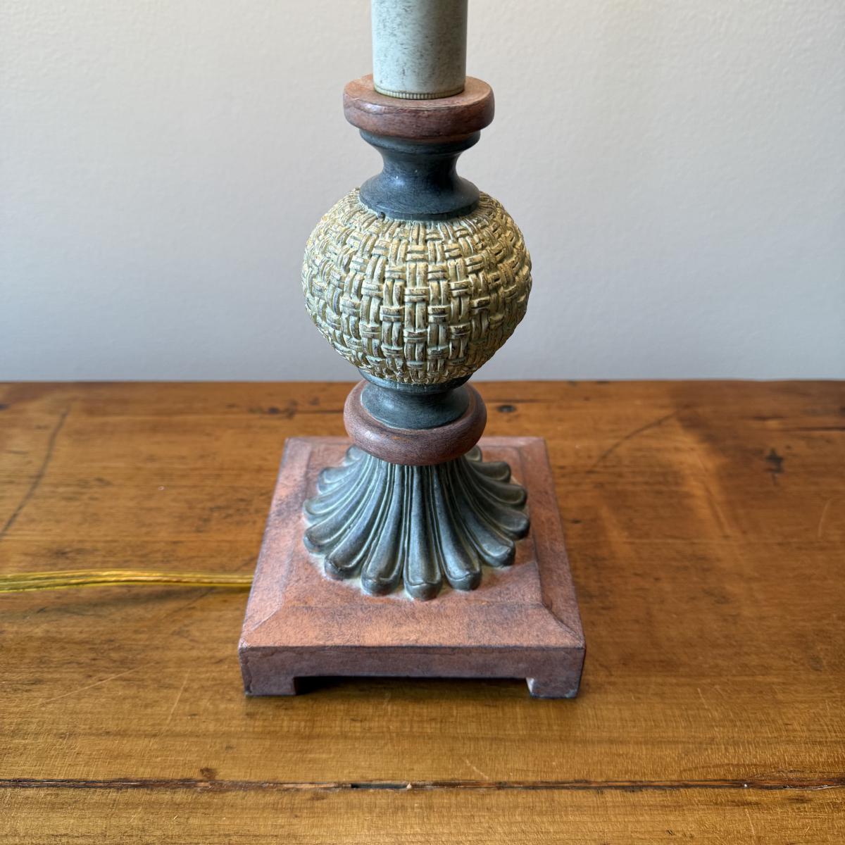 Tall table lamp with a "woven" style. This is a one-way switch and does power on. The base measures 4.75” x 4.75” with a 31”H. The lamp appears to be ceramic on the base and top, the middle rod appears to be metal and the shade appears to be made out of a faux leather. Shipping available.