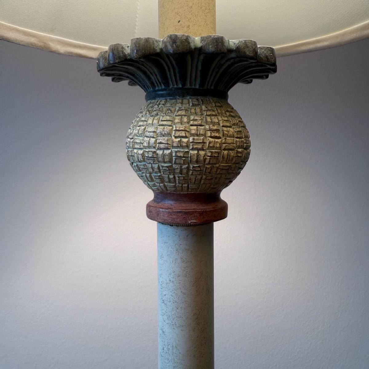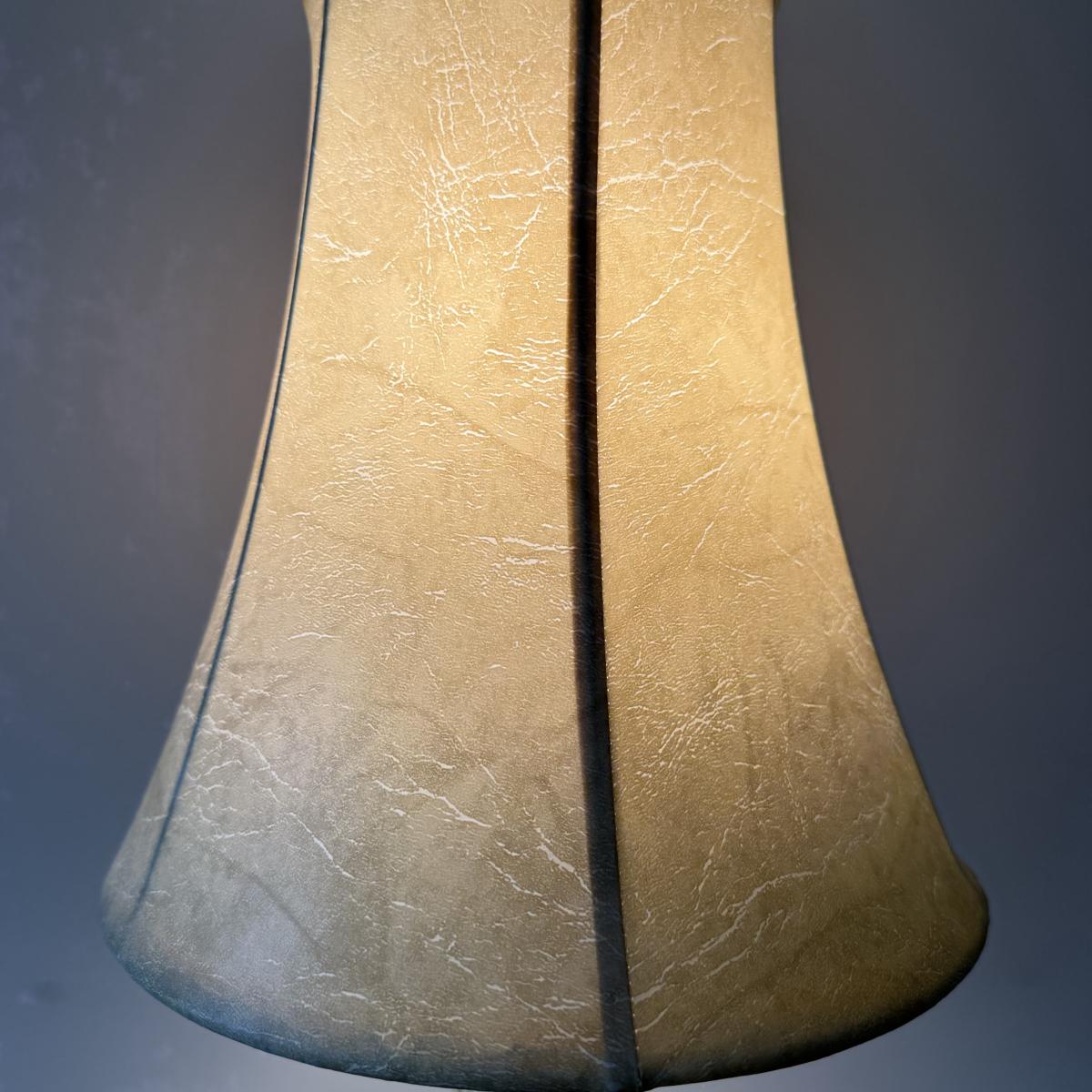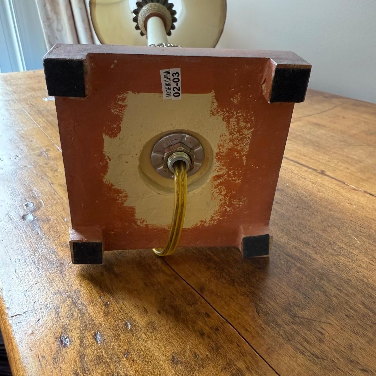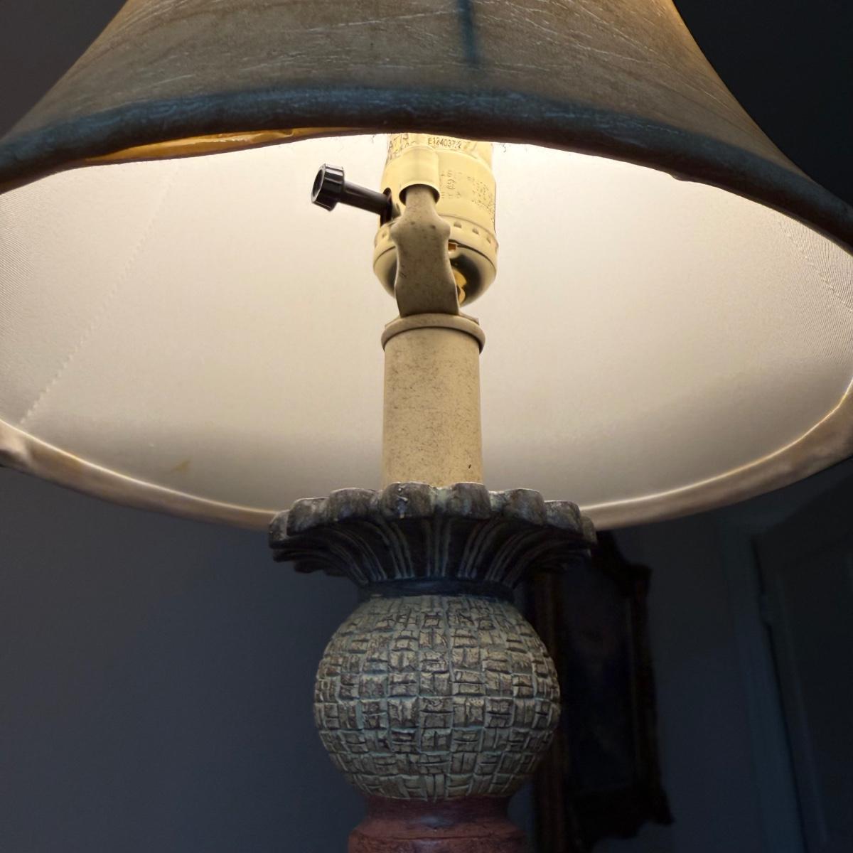 Tall table lamp with a "woven" style. This is a one-way switch and does power on. The base measures 4.75” x 4.75” with a 31”H. The lamp appears to be ceramic on the base and top, the middle rod appears to be metal and the shade appears to be made out of a faux leather. Shipping available.