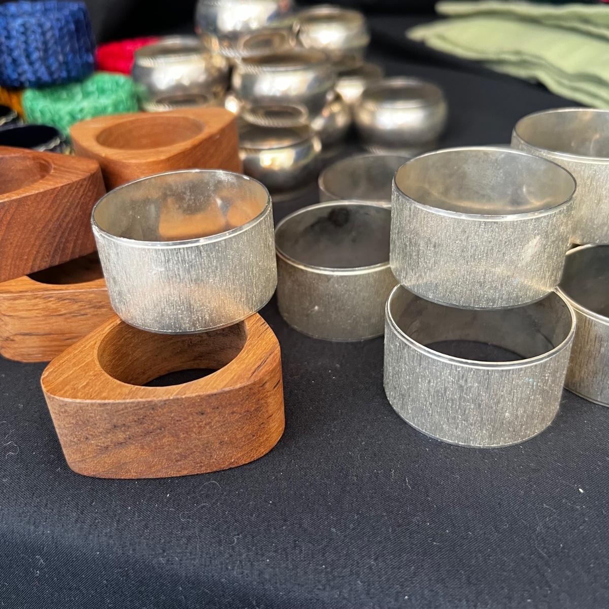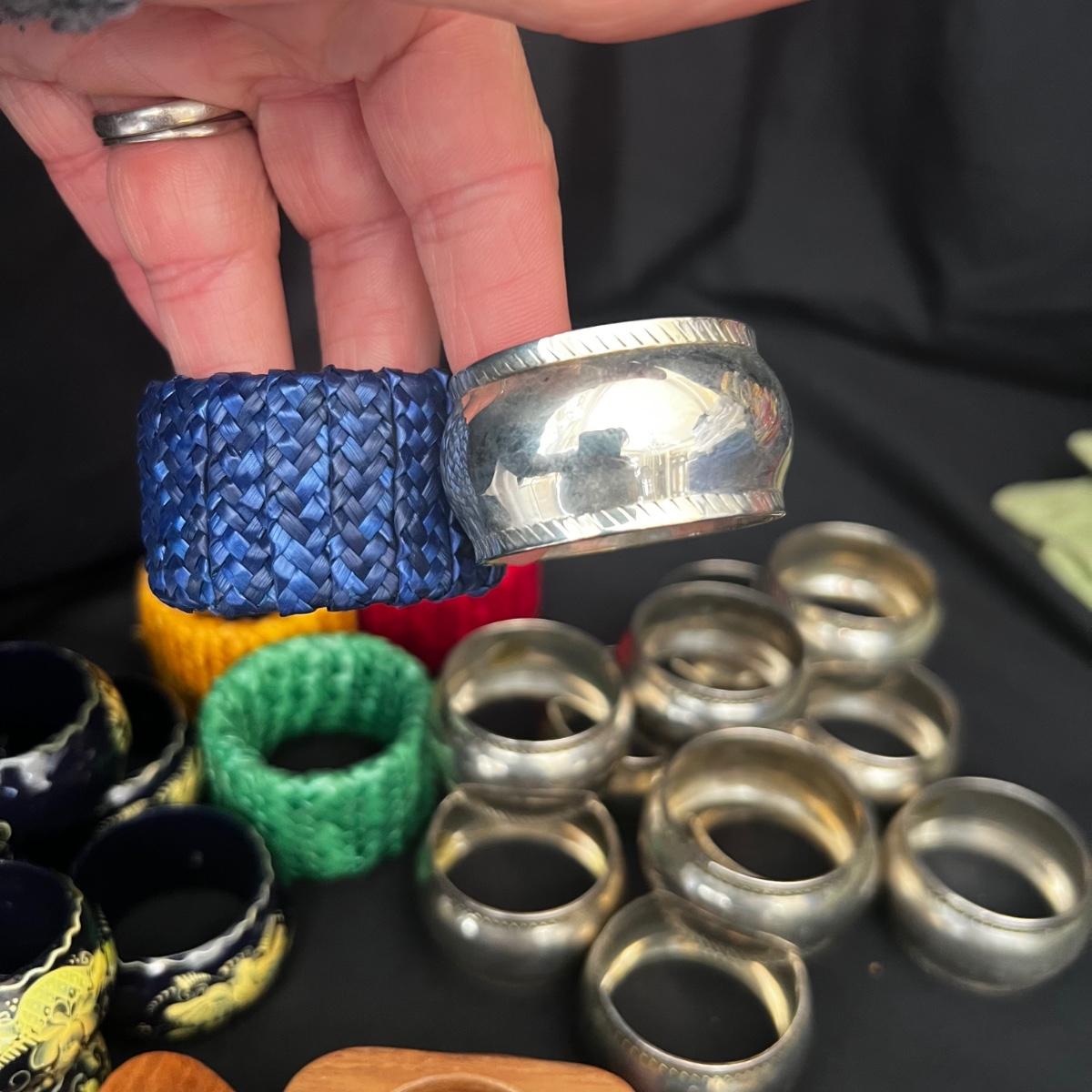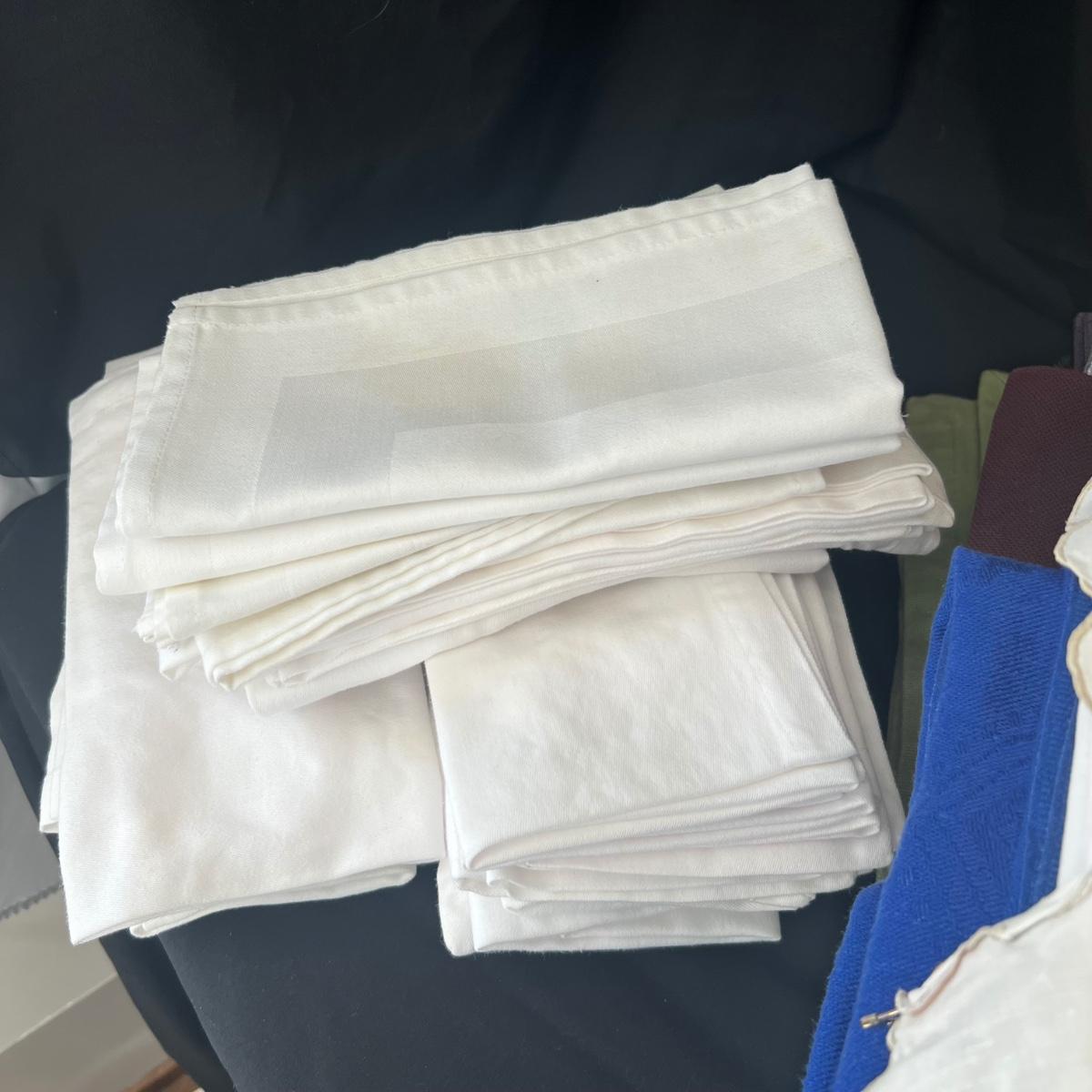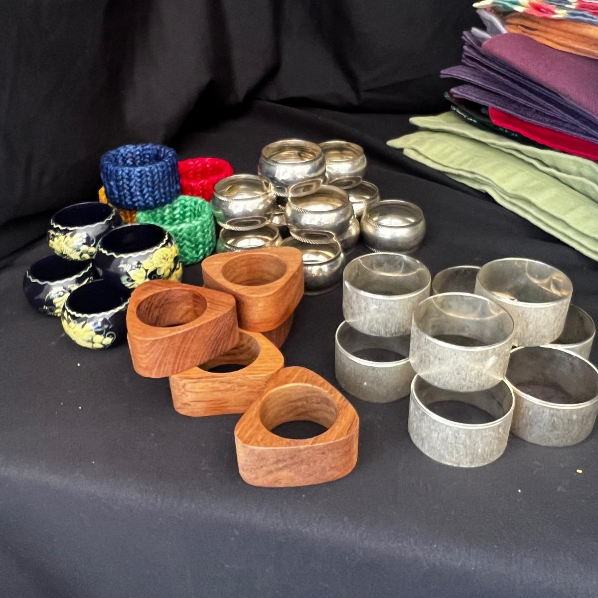 Large assortment of napkins and napkins holders plus three tablecloths. The blue tablecloth is very long, possibly more of a runner, it measures 58” x 132” long. The two smaller tablecloths were photographed on a 32” x 60” table. Note the stain on the white one. See photos for full inventory. Napkin rings materials include wood, silverplate and more. The fabric pieces with buttons are also napkin holders. Napkins are mostly sets of four but with larger sets included. White napkins show some stains.