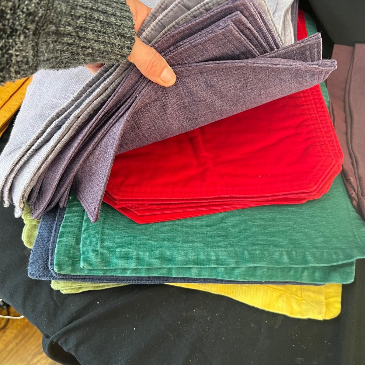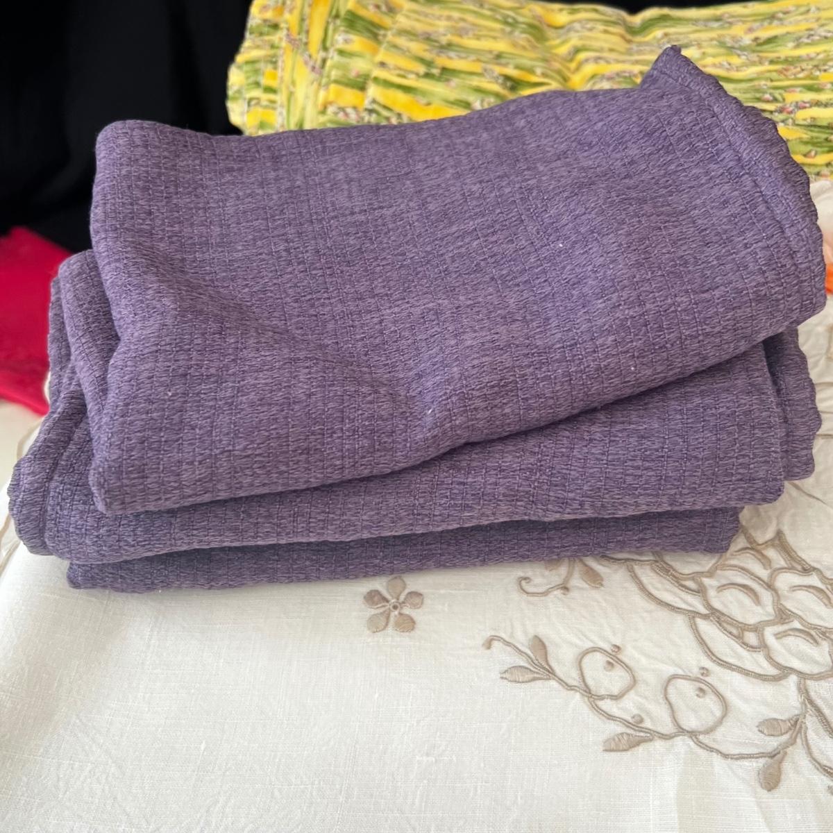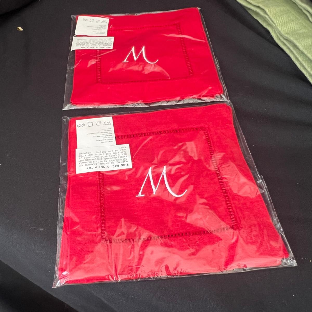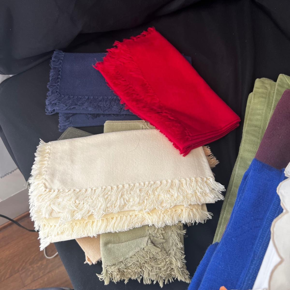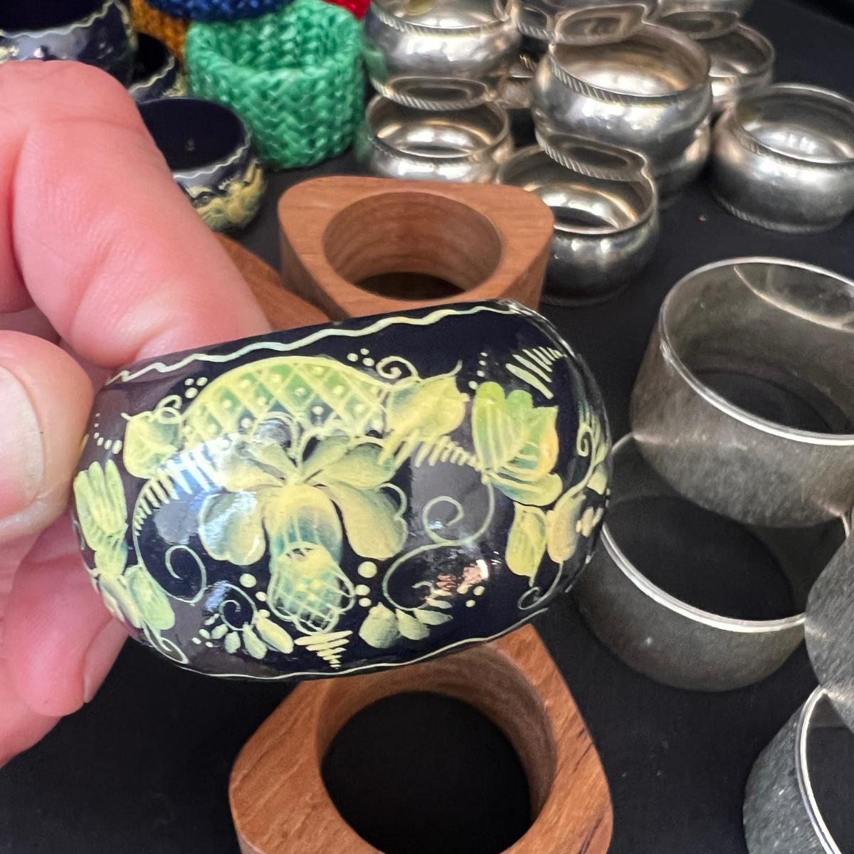 Large assortment of napkins and napkins holders plus three tablecloths. The blue tablecloth is very long, possibly more of a runner, it measures 58” x 132” long. The two smaller tablecloths were photographed on a 32” x 60” table. Note the stain on the white one. See photos for full inventory. Napkin rings materials include wood, silverplate and more. The fabric pieces with buttons are also napkin holders. Napkins are mostly sets of four but with larger sets included. White napkins show some stains.