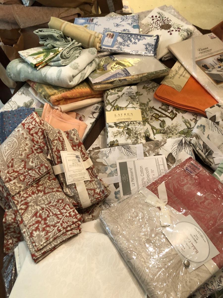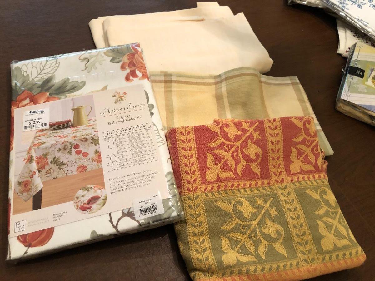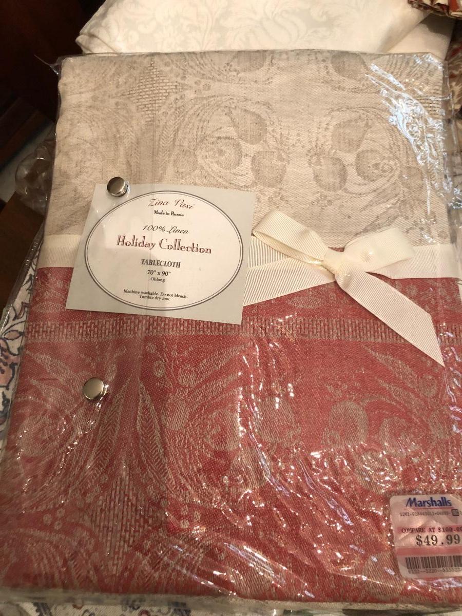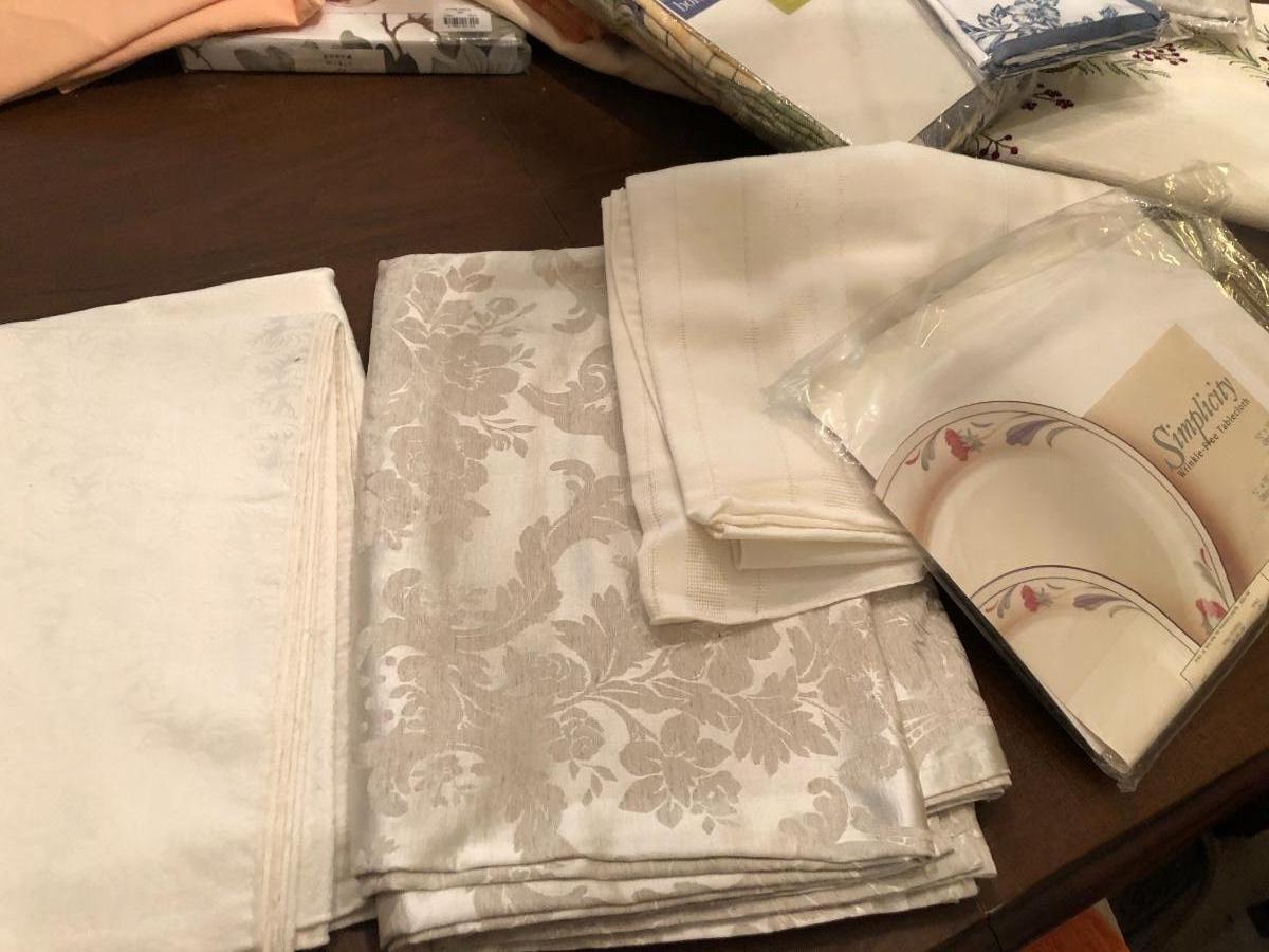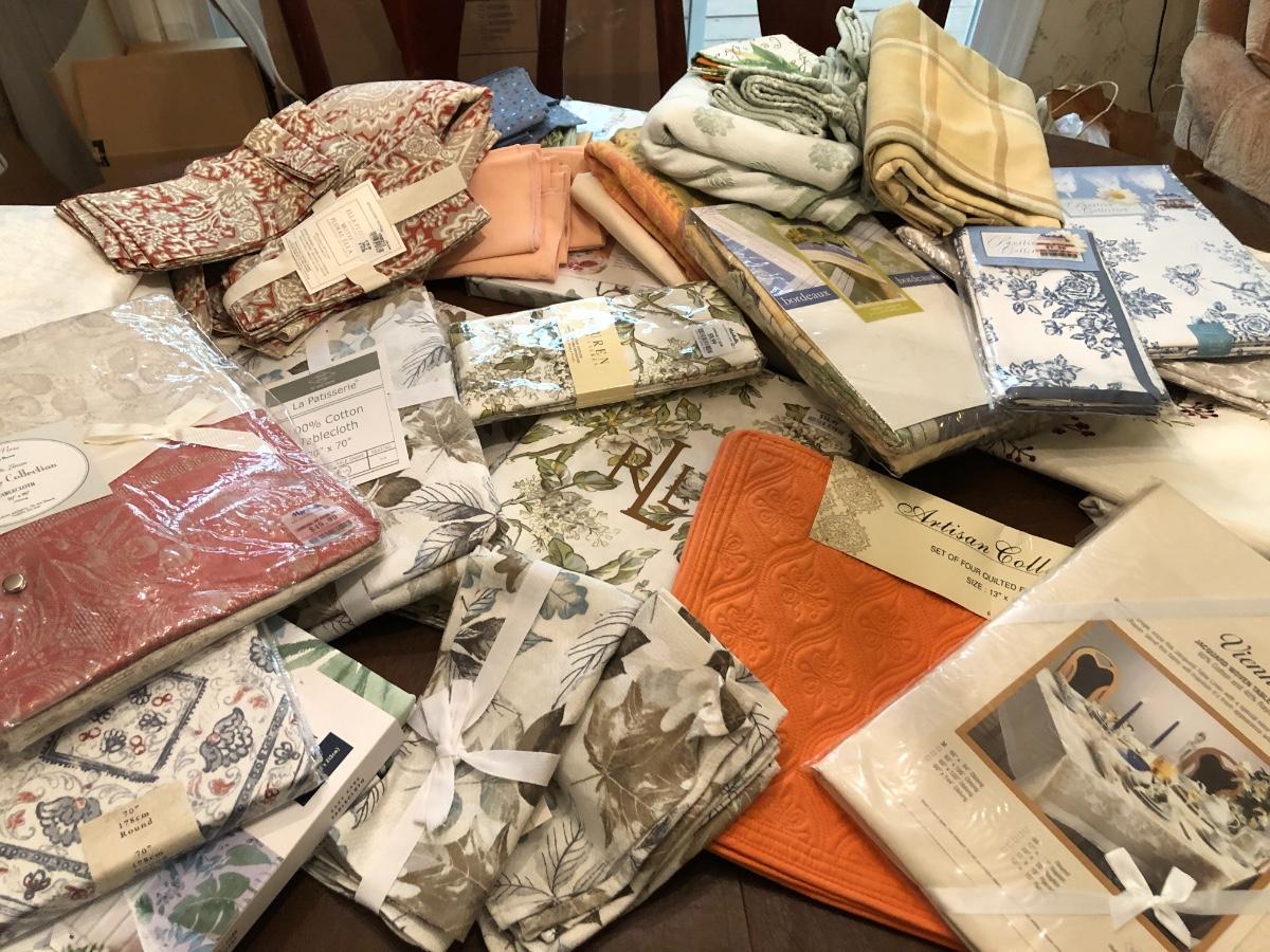 We have added many quality photos for each lot showing content, condition, & dimensions. Feel free to e-mail or text any questions. All items are sold as is, as found in the estate. Please see all photos for content, measurements and condition. Loads of quality new table cloths and more!