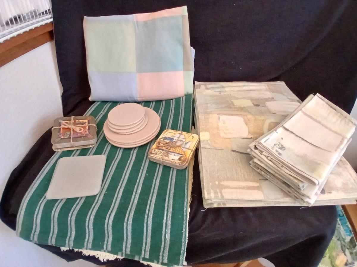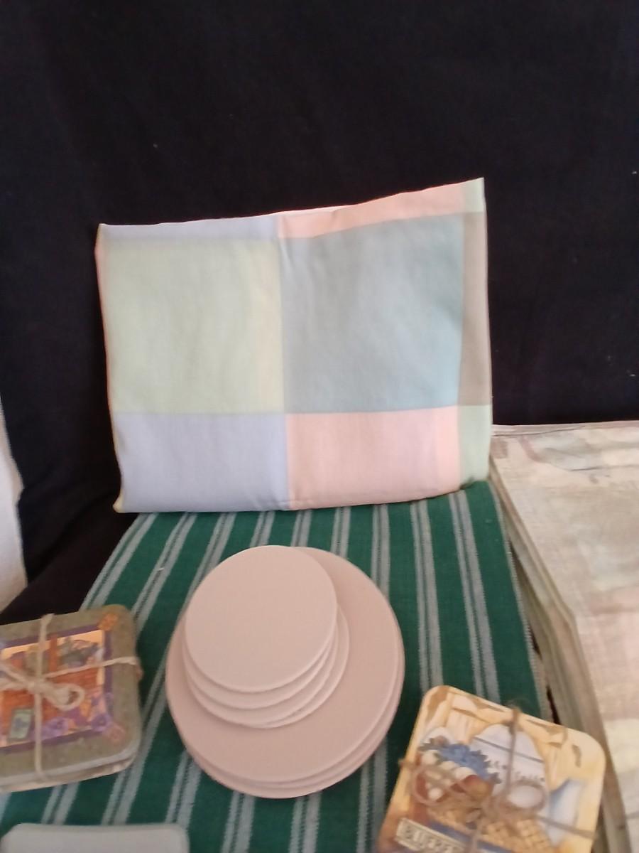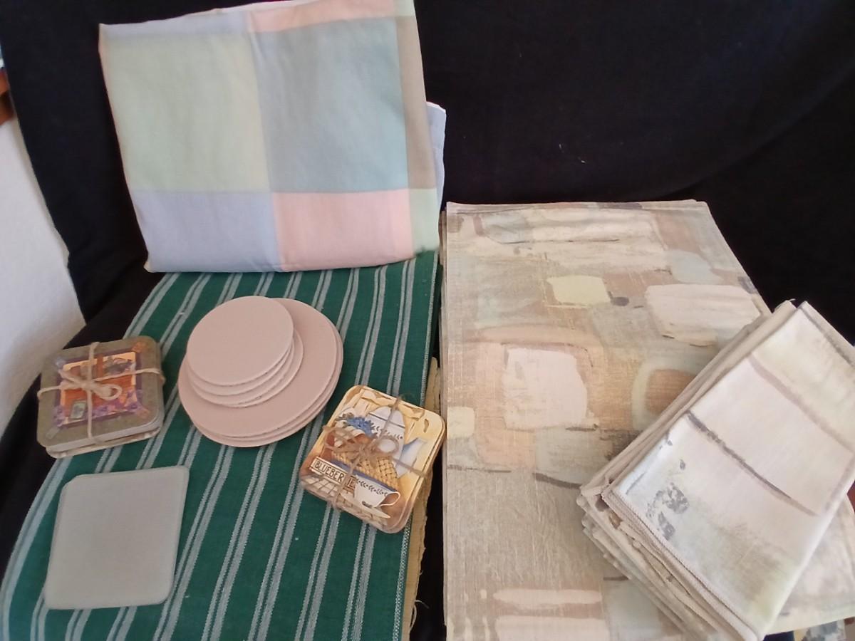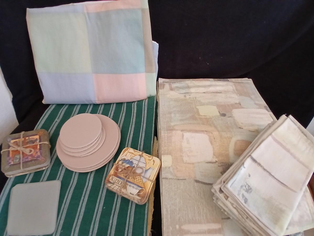 Table linens, placemats, kitchen towels, and corked back hot plate pads