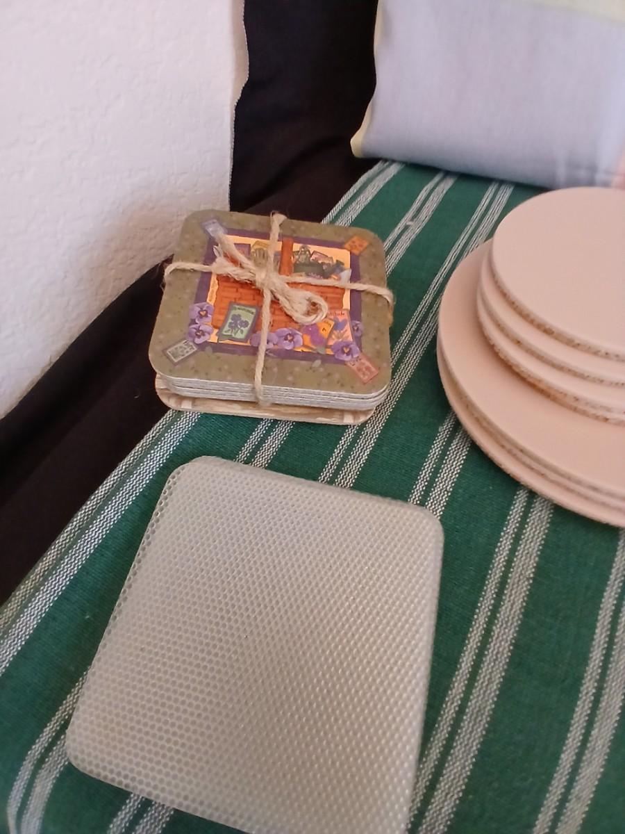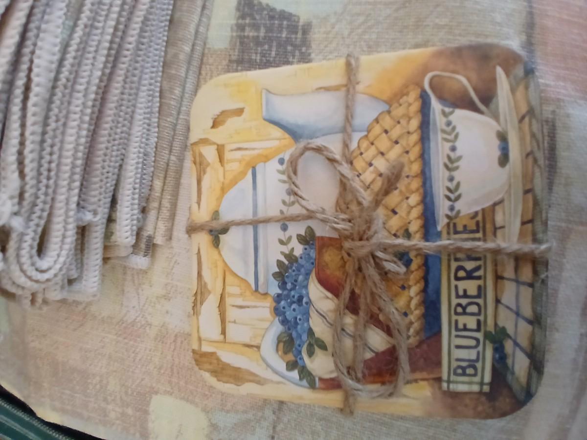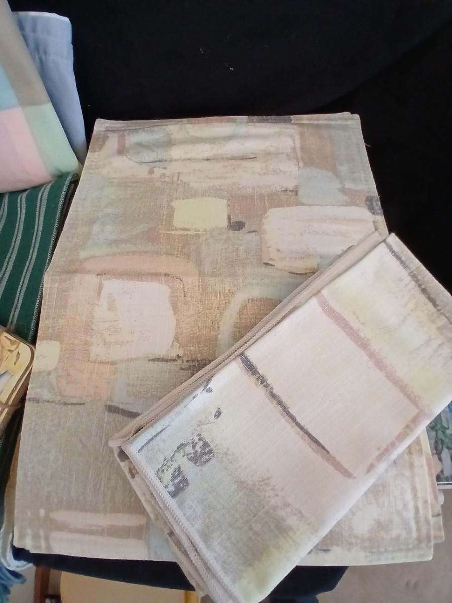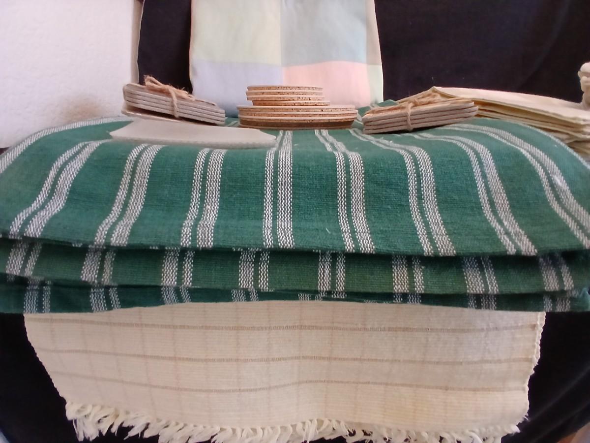 Table linens, placemats, kitchen towels, and corked back hot plate pads