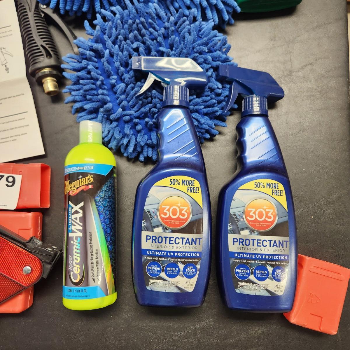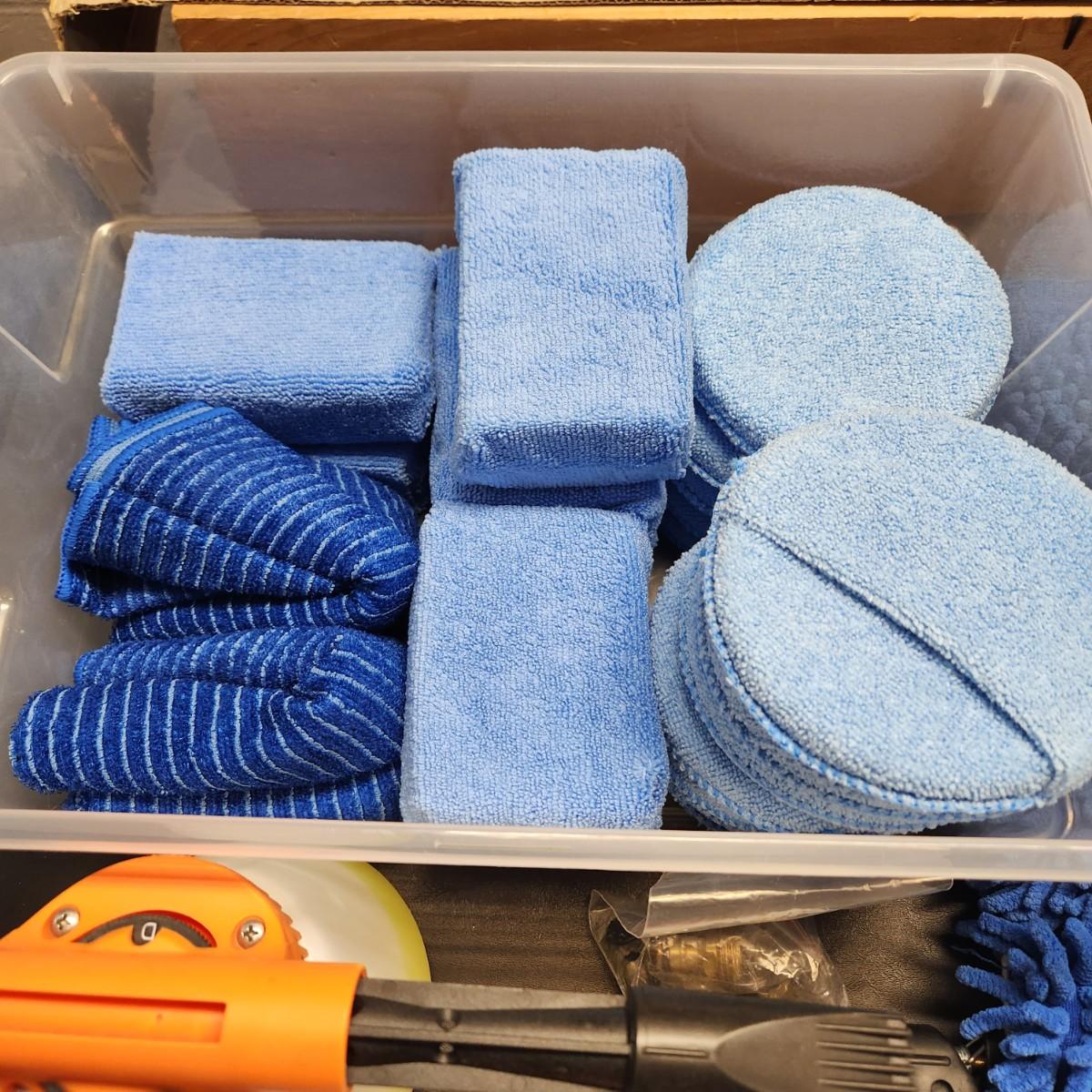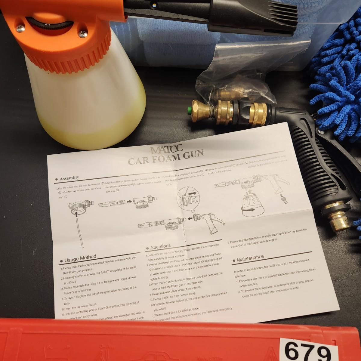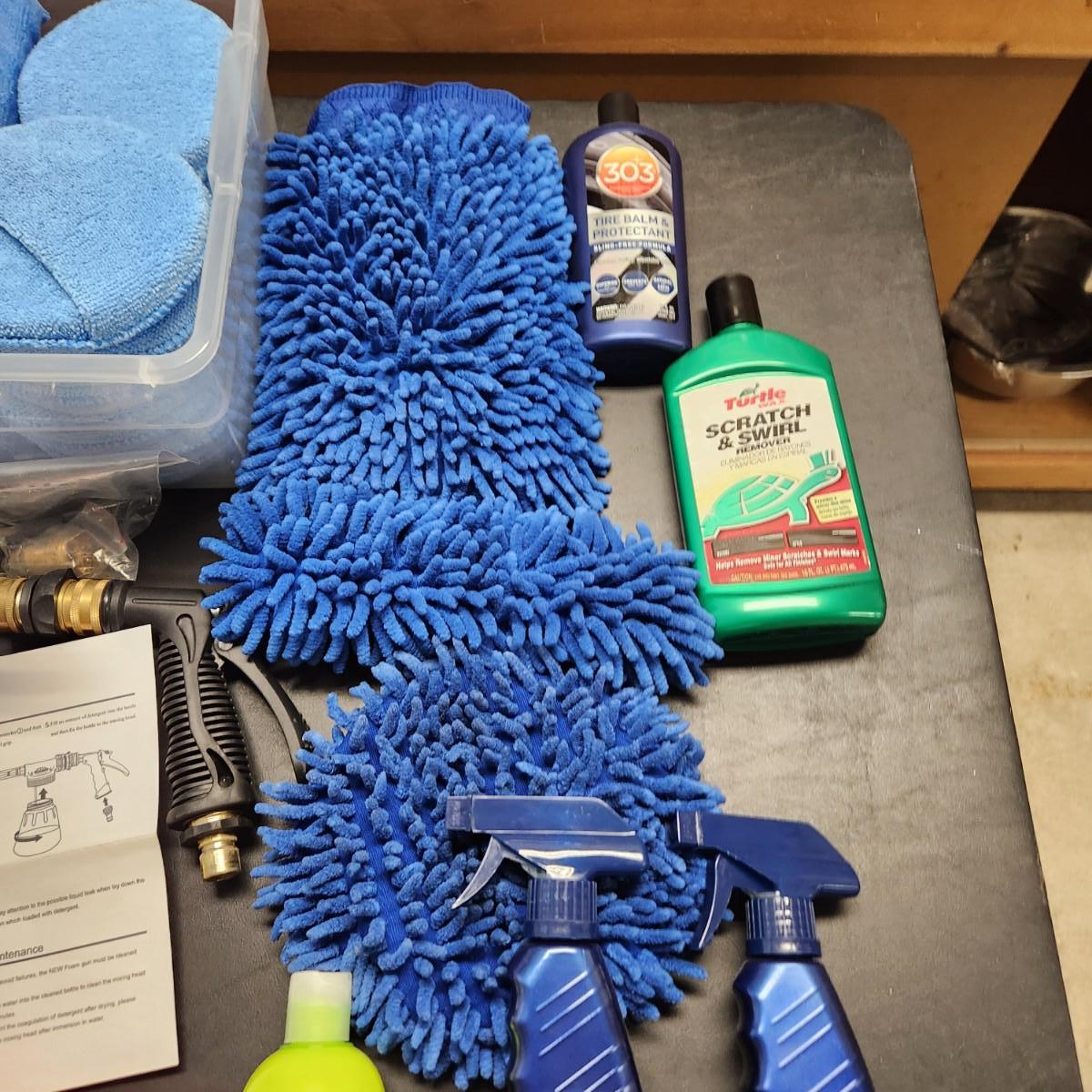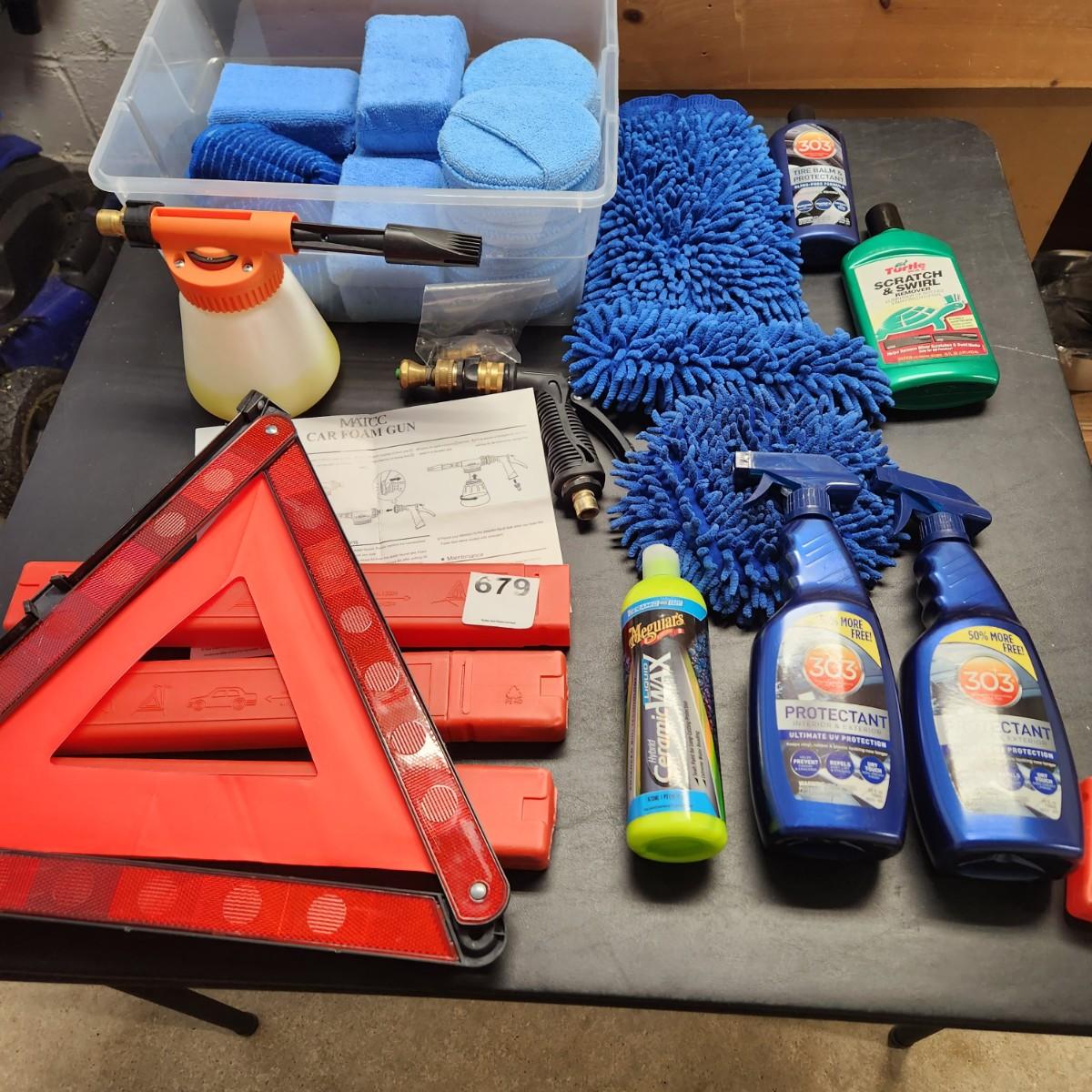 Table Lot of Car Care Safety items Matcc Car Foam Gun, Buffers, Dusters