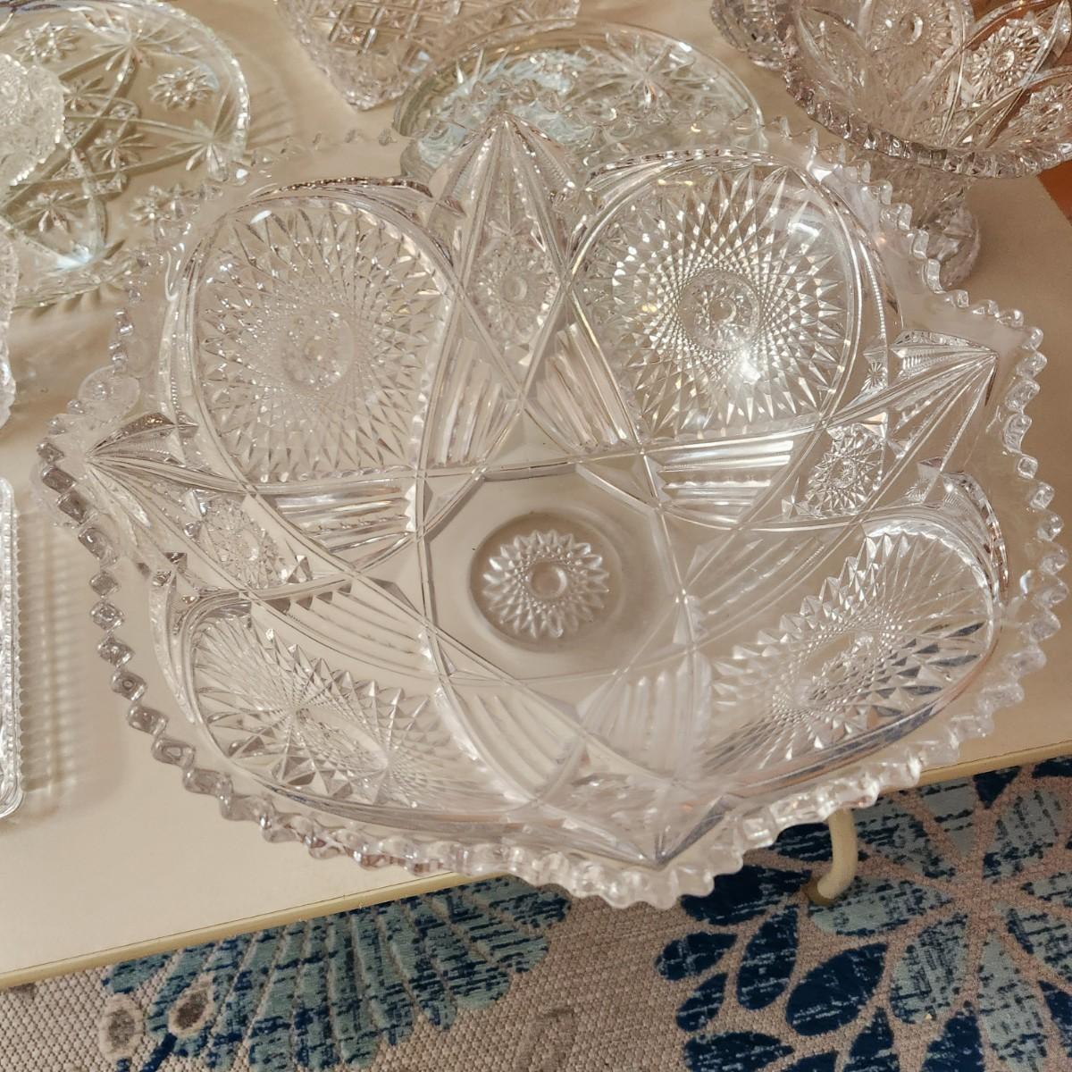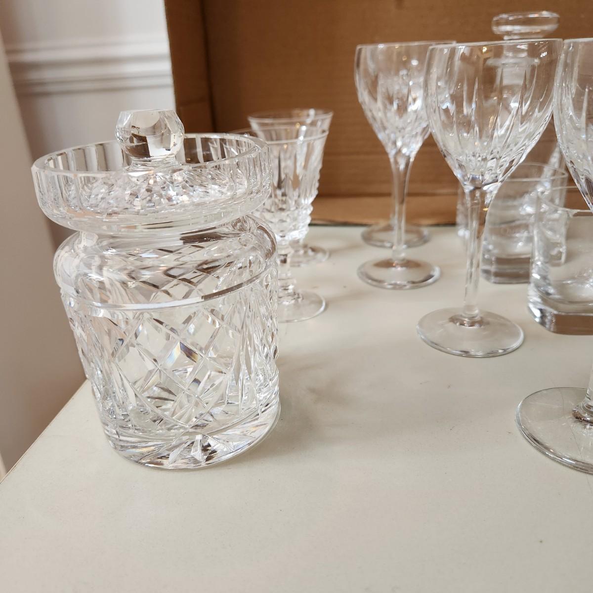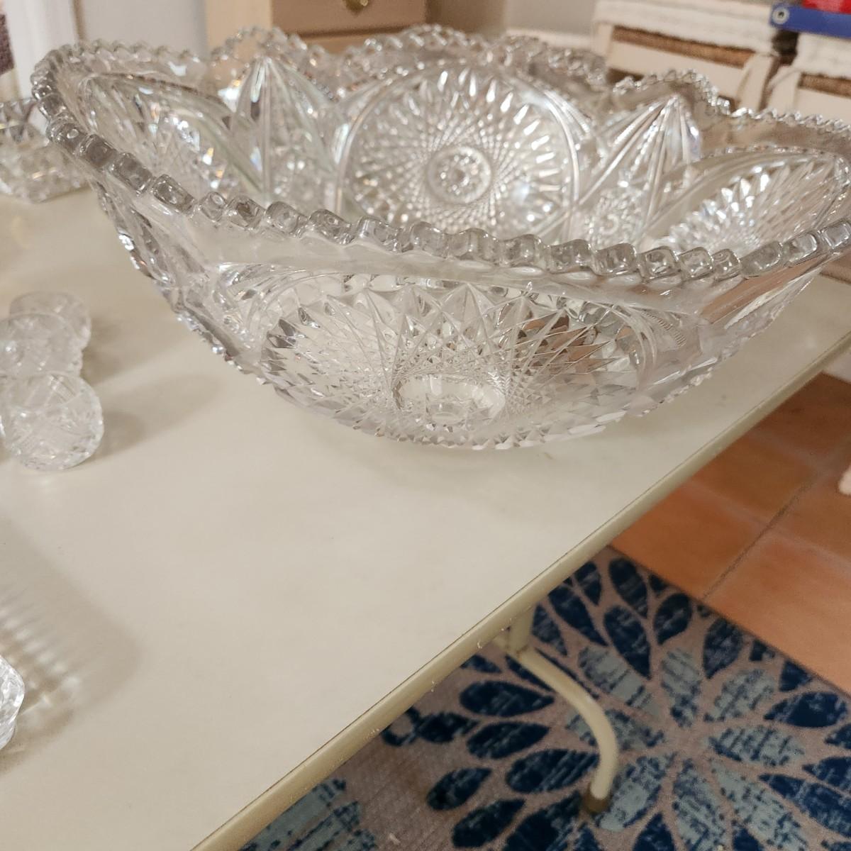 Table lot of Clear Glass Crystal Bowls Candle Holders ,Glasses, Waterford , Reed & Barton Drinking Glasses ,Queen Mary 2 , and others