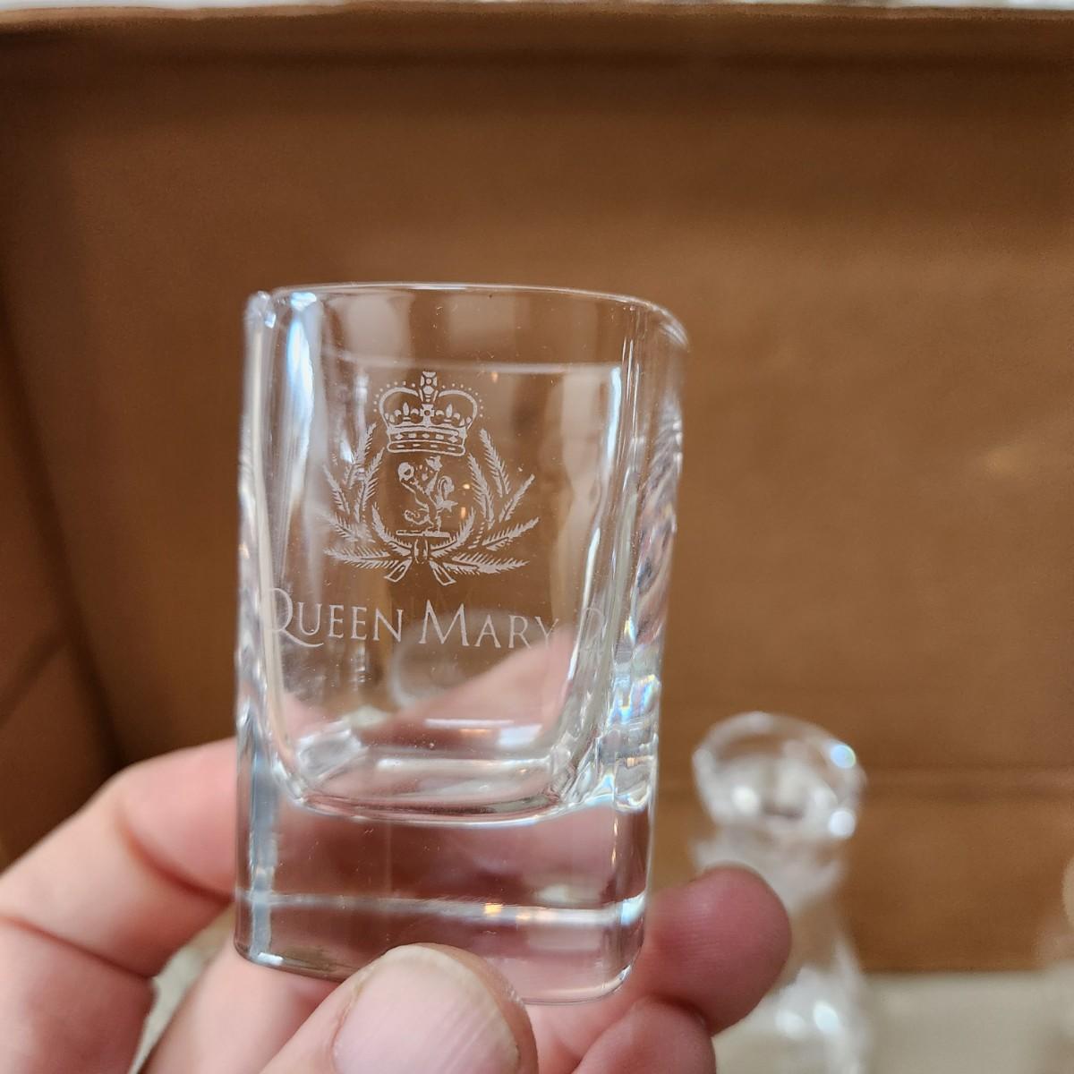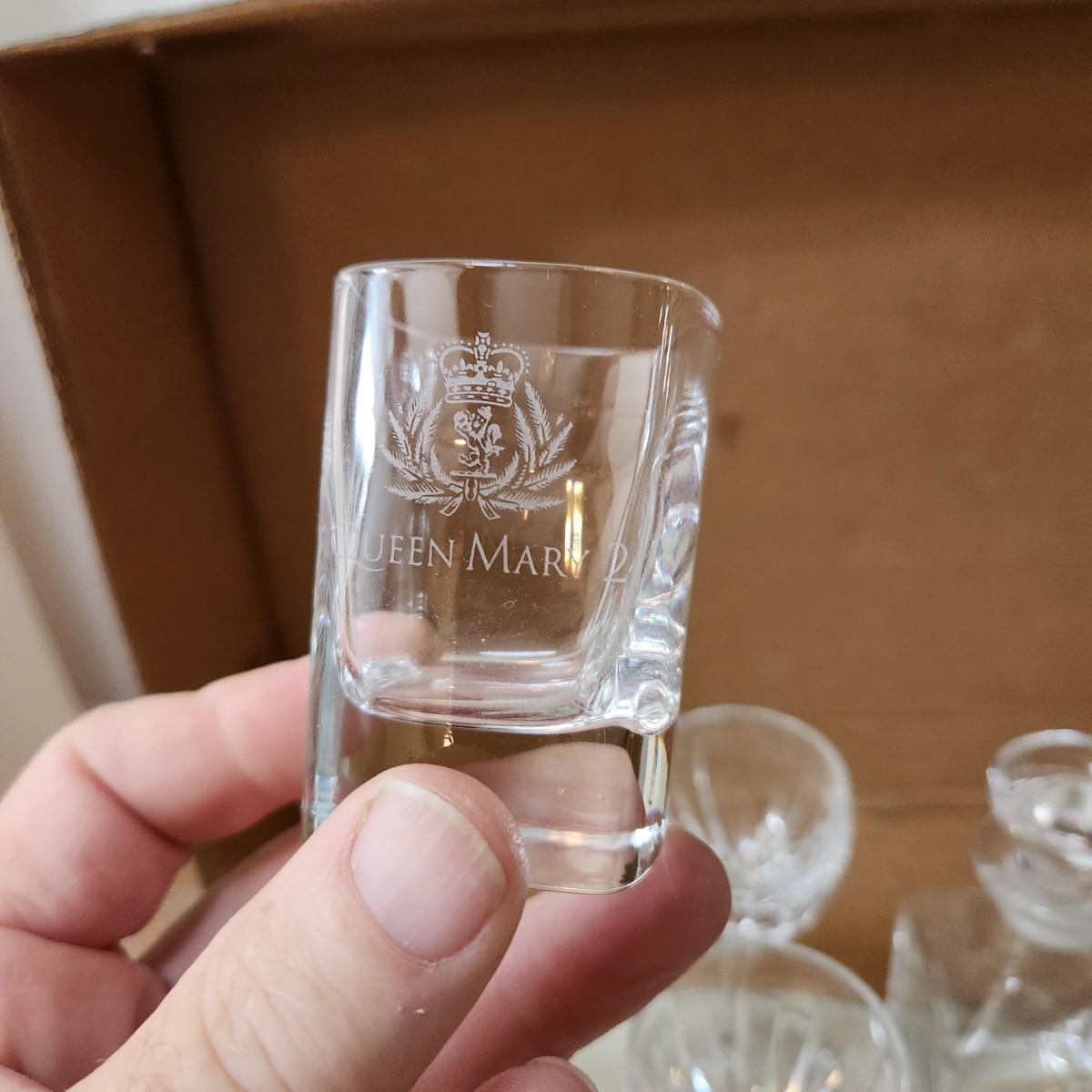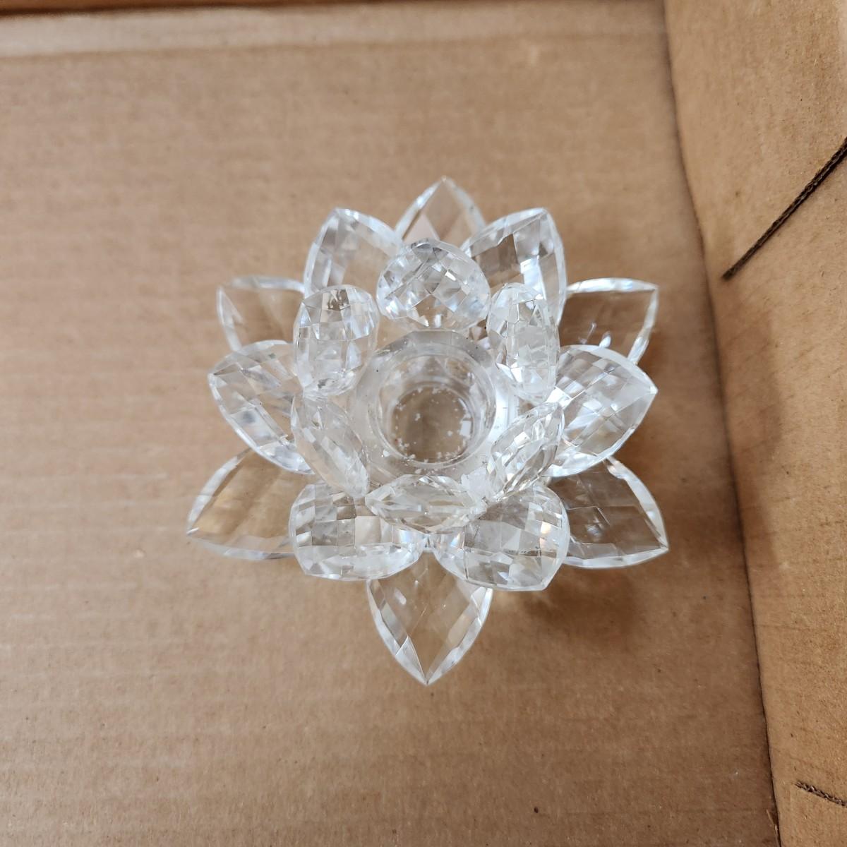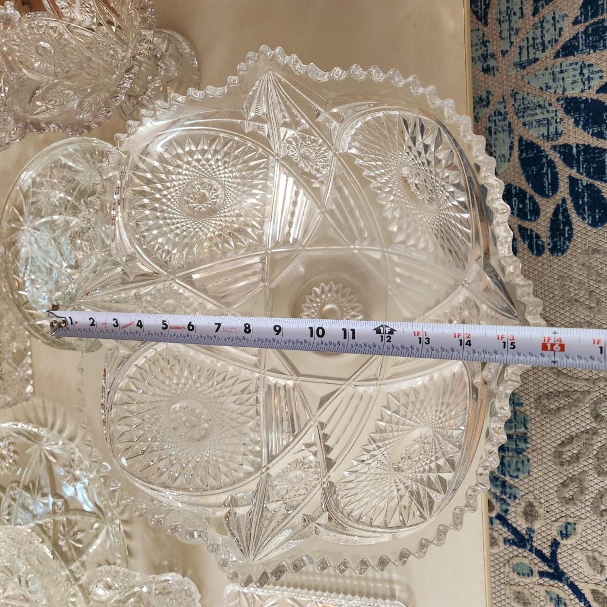 Table lot of Clear Glass Crystal Bowls Candle Holders ,Glasses, Waterford , Reed & Barton Drinking Glasses ,Queen Mary 2 , and others