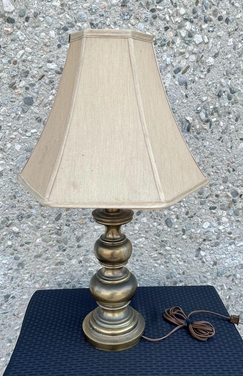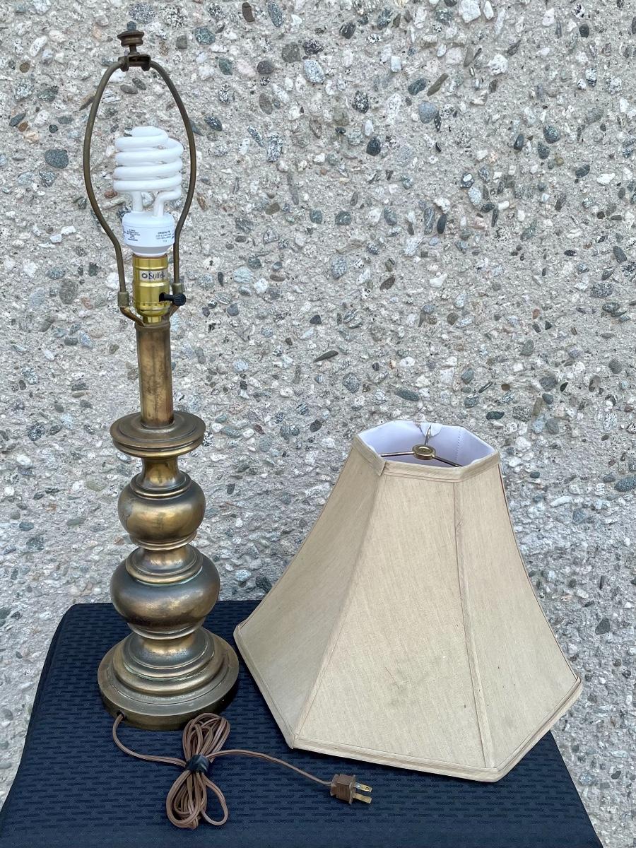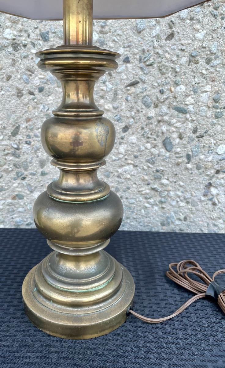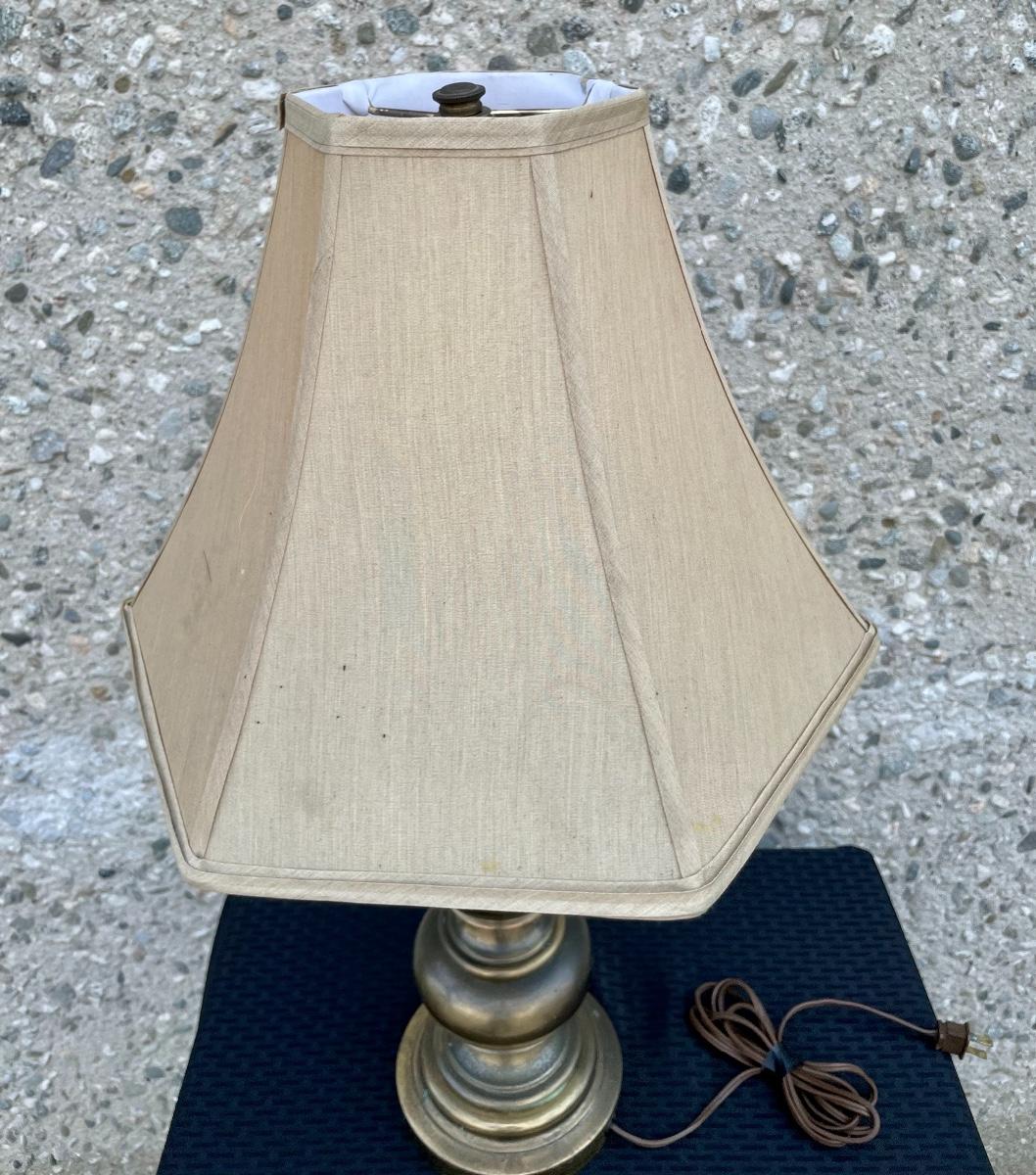 Lamp with a antique brass base and a 6-sided flared shade. Approx 27” tall.