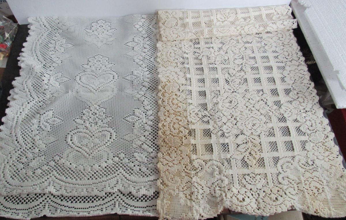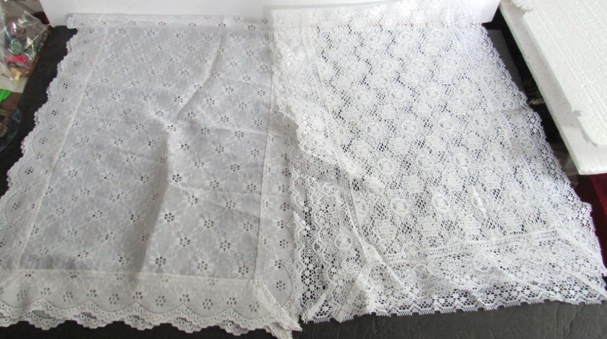 One is stained as seen in photos, and has a tear at the top, but can be stitched. The one with the hearts is very pretty. Shipping is available at actual shipping cost plus $5.00 handling fee per box for supplies/labor. See our terms for details. All sales are final. Condition notes may not be all inclusive, we may miss some issues as most vintage items are not in mint condition and have some degree of wear, paint loss, etc, but we always try to note obvious damage.