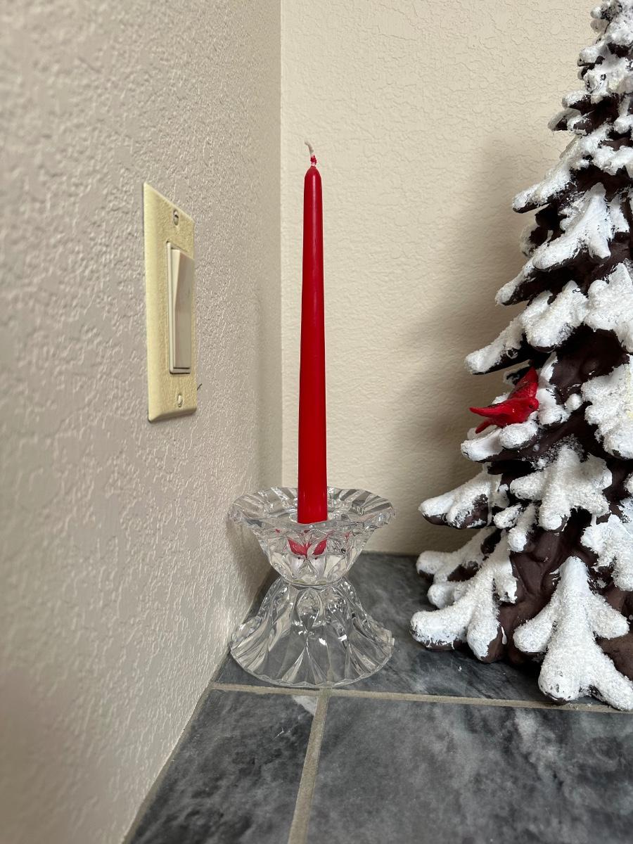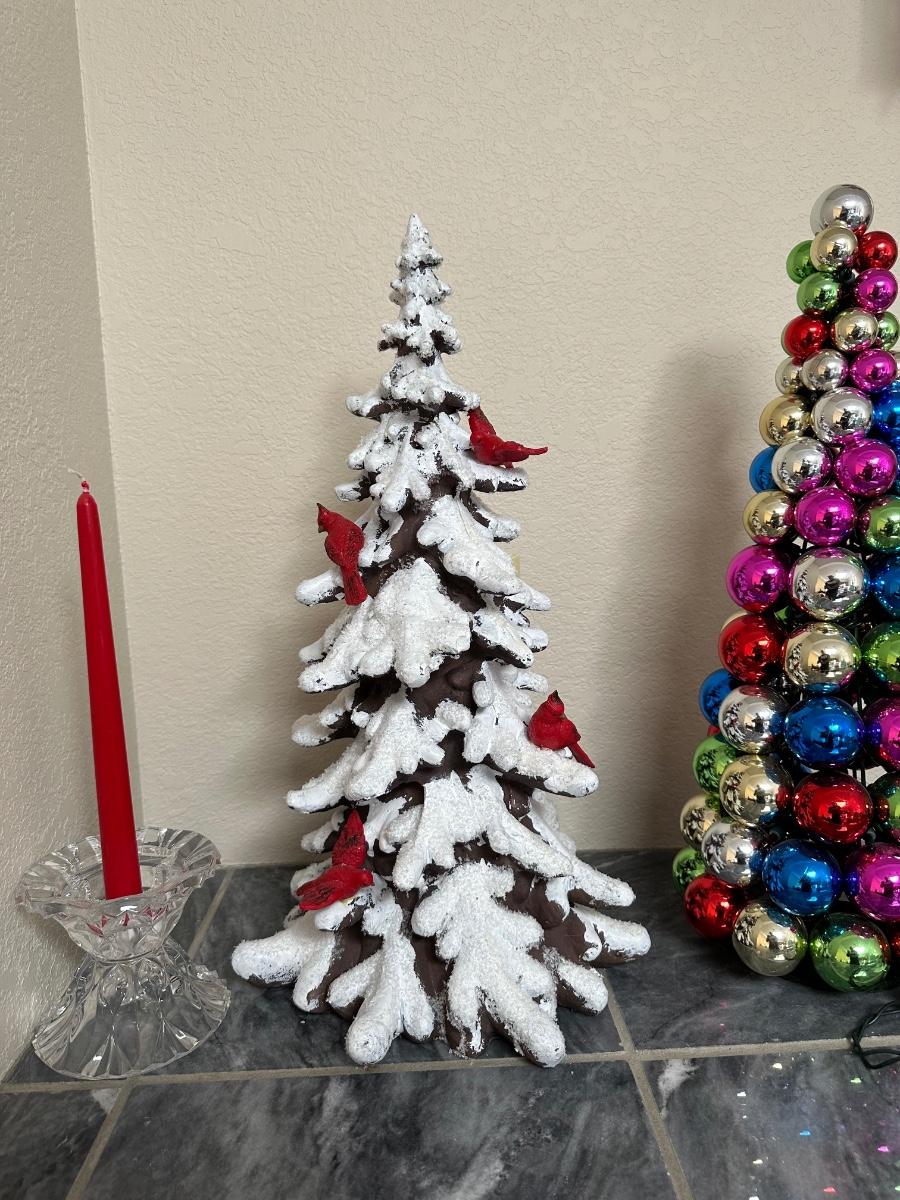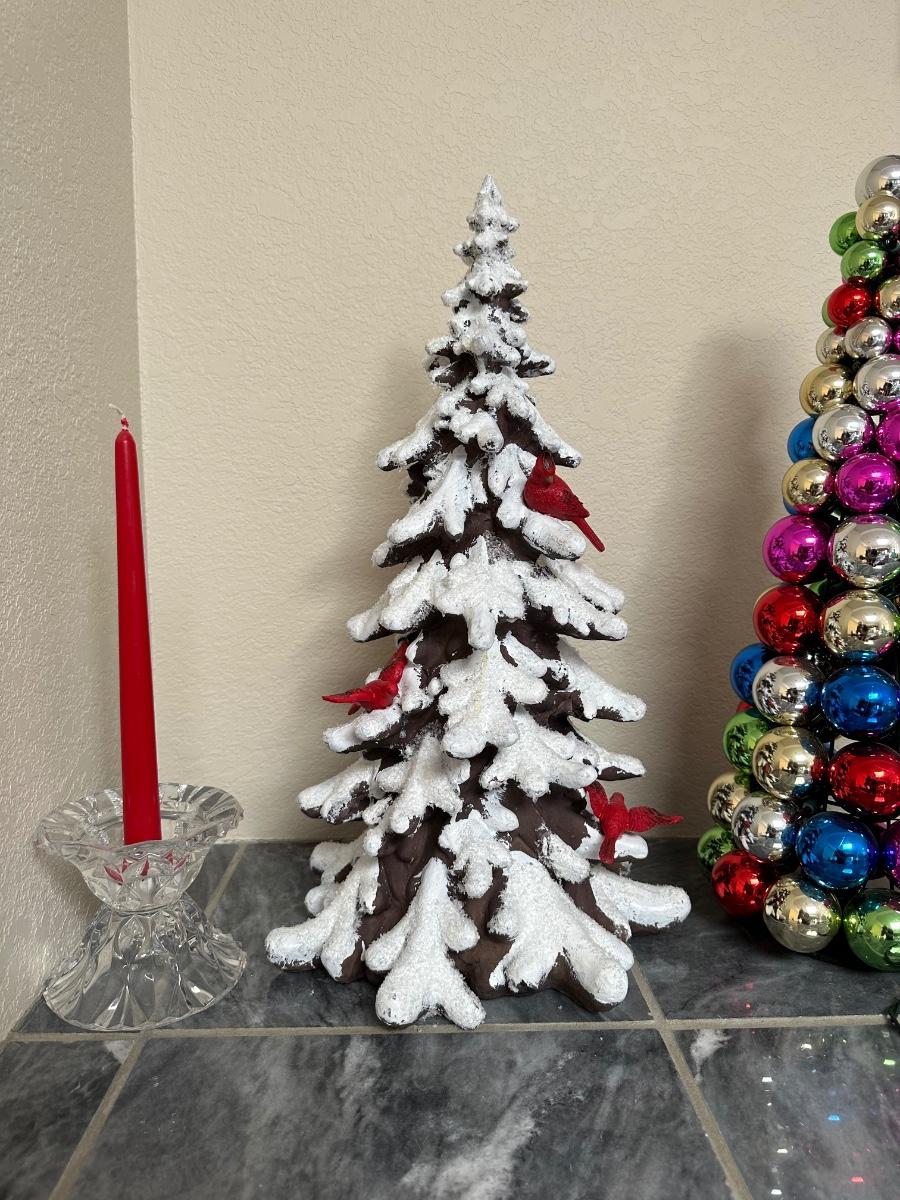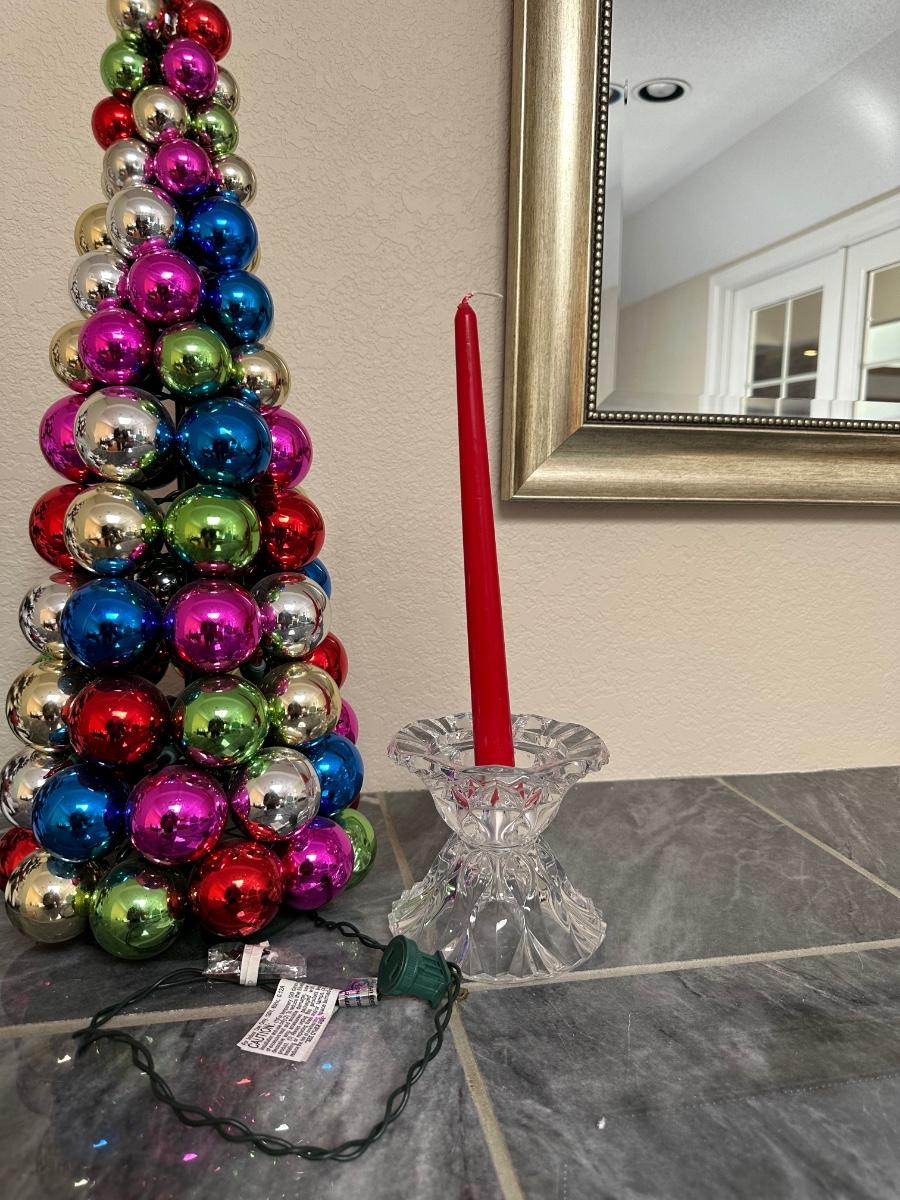TABLE TOP CANDLE HOLDERS WITH CANDLES, LIGHTED MULTICOLORED BALL ORNAMENT TREE AND TABLE TOP CHRISTMAS TREE WITH CARDINALS