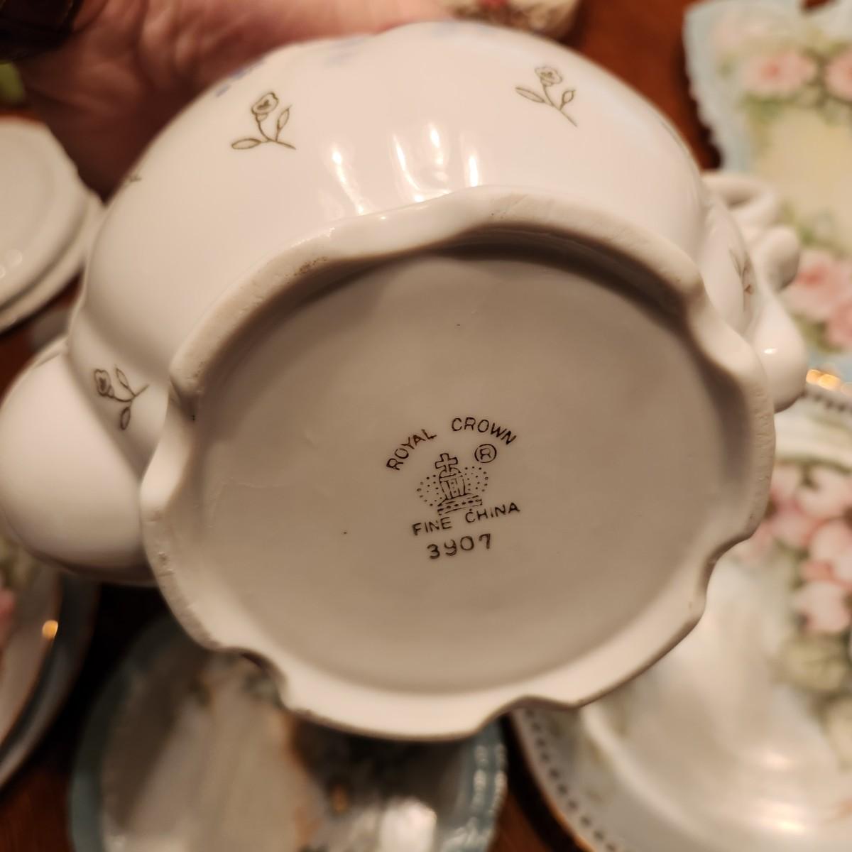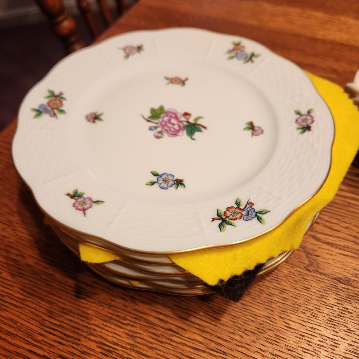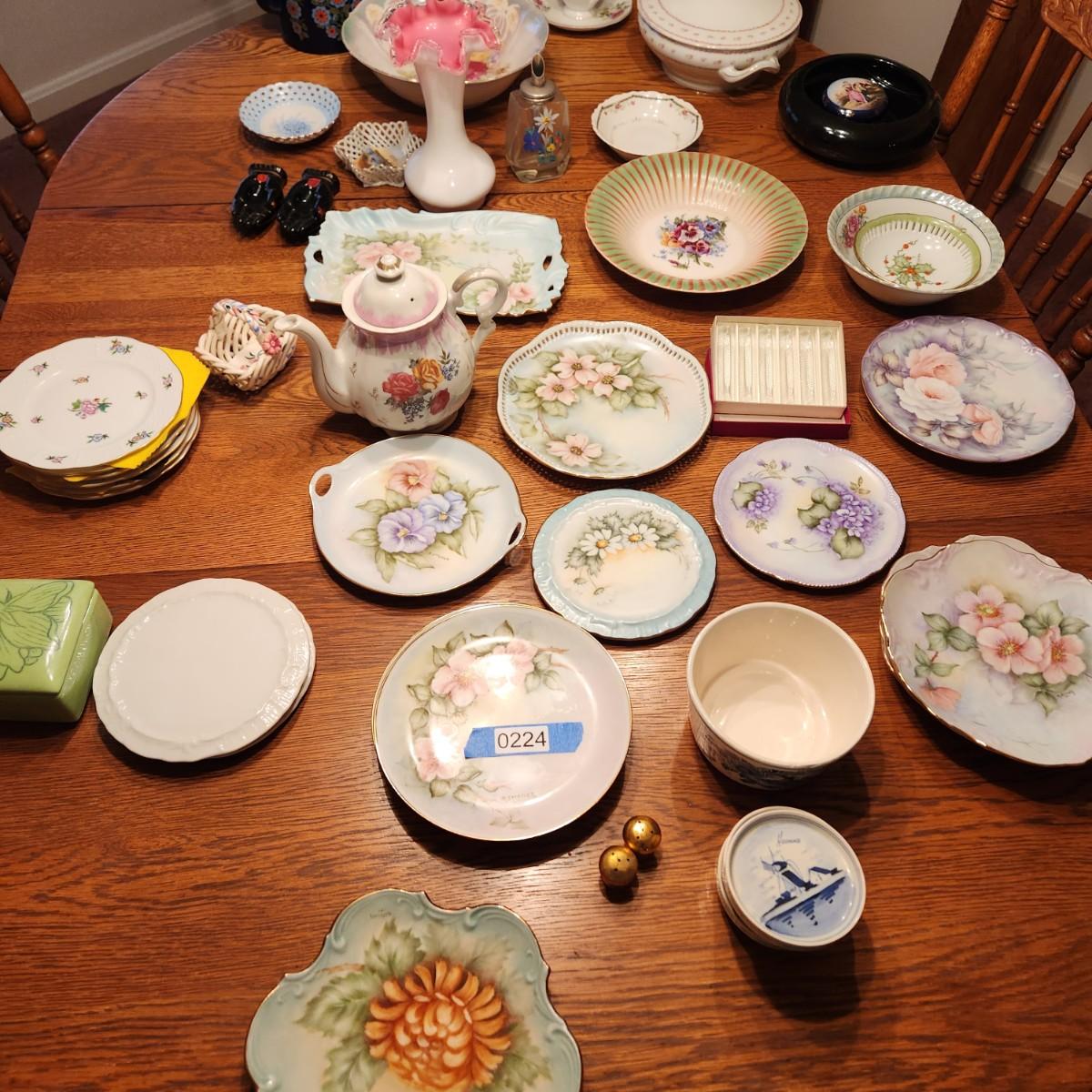 Table Top Full of China Plates , Fenton Vase, Tea pot, Bowls, Delft Holland, Herend, Bareuther, Royal Crown
