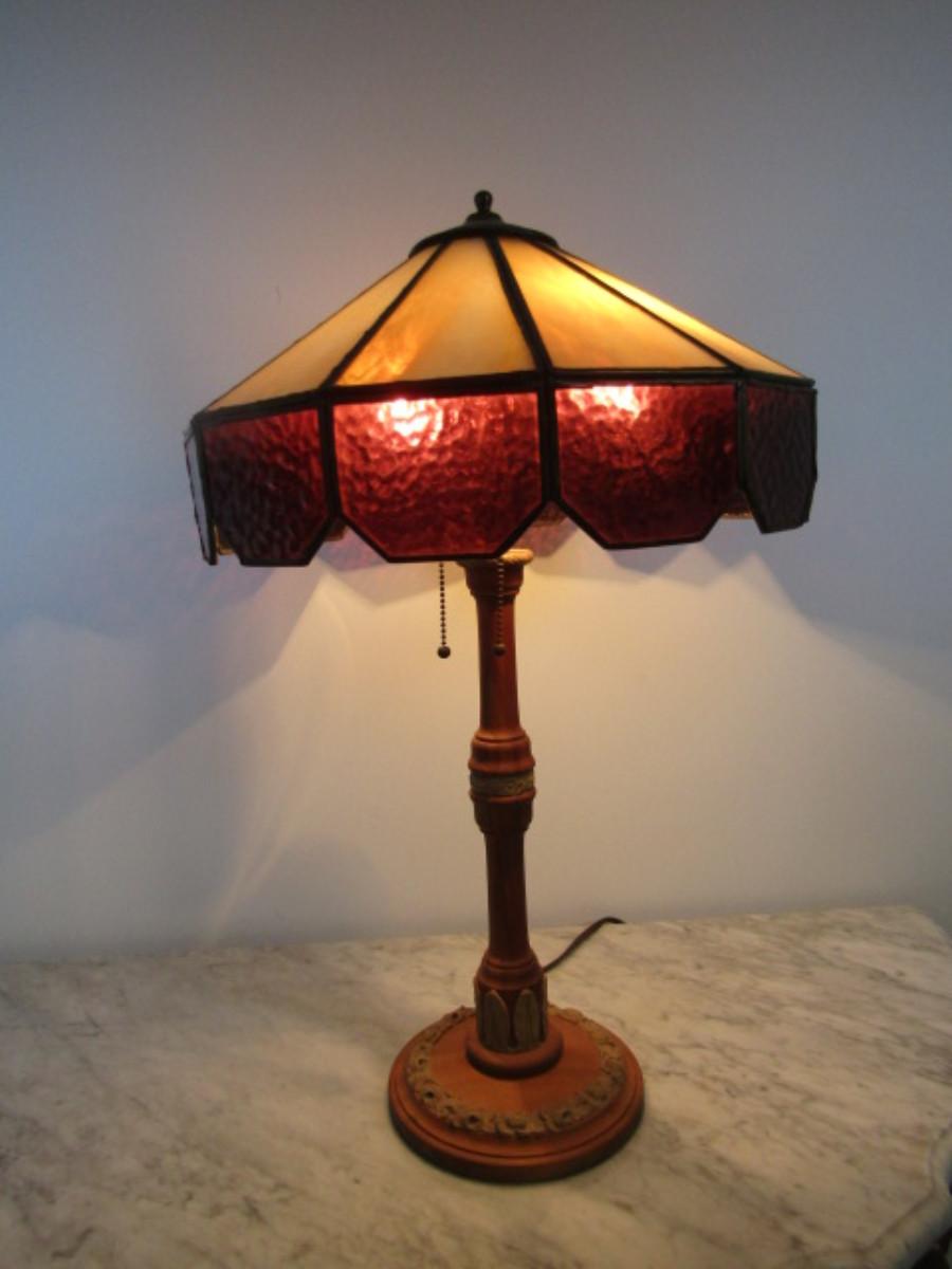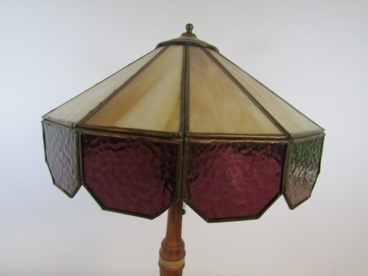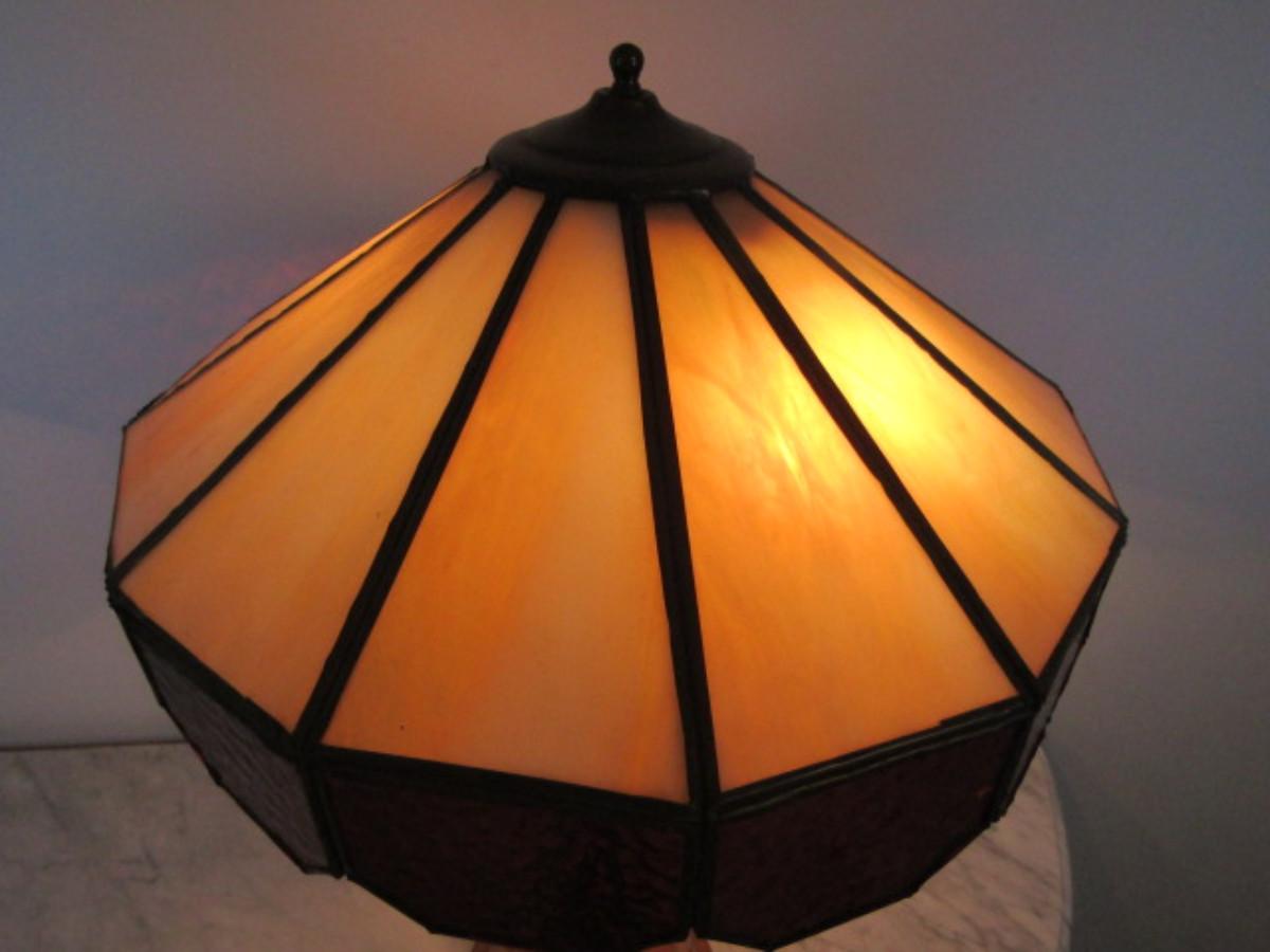 Table Top Lamp with Stained Glass Shade and Carved Wooden Post