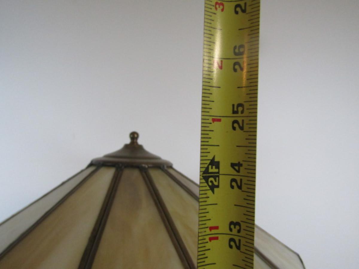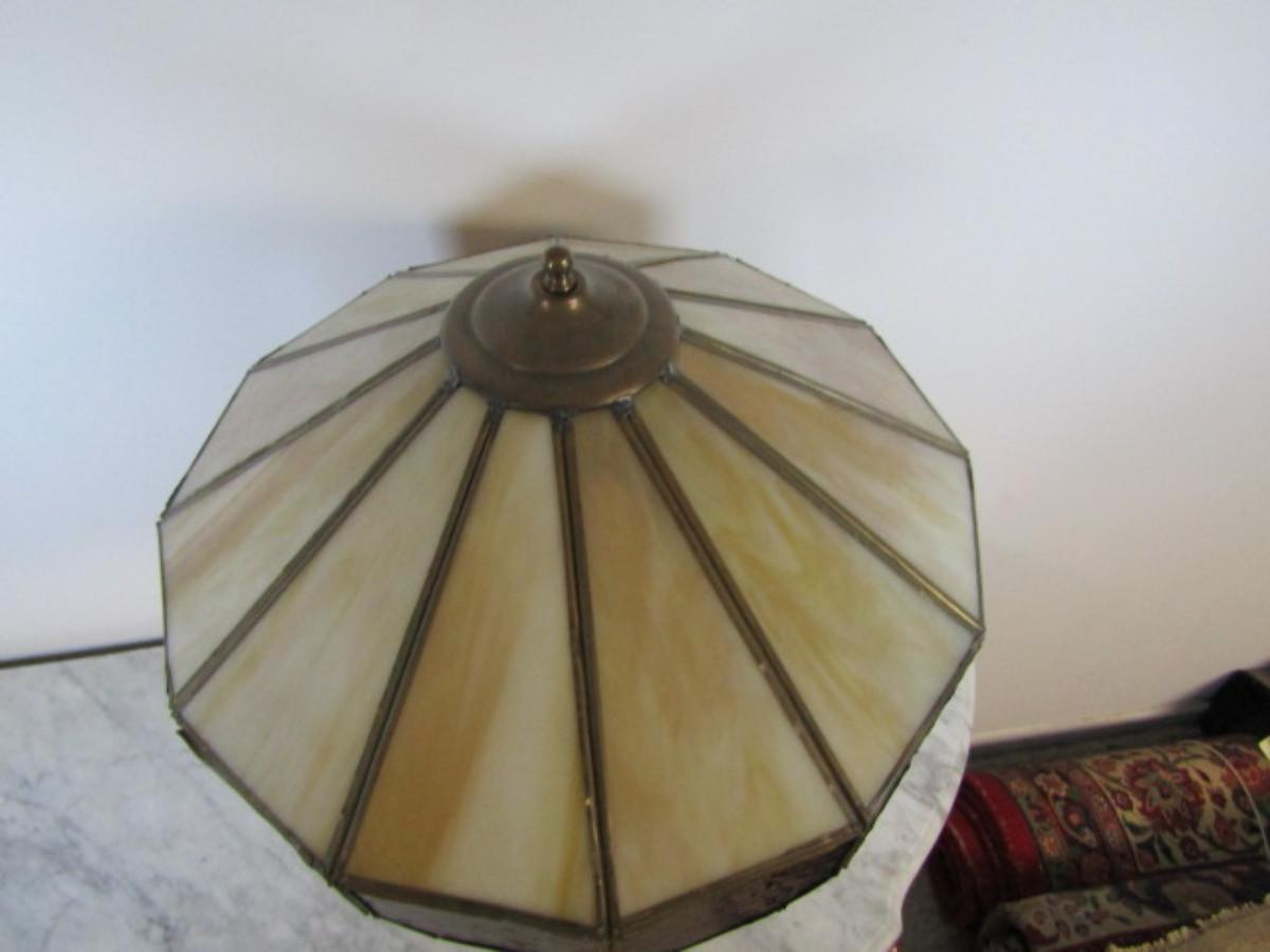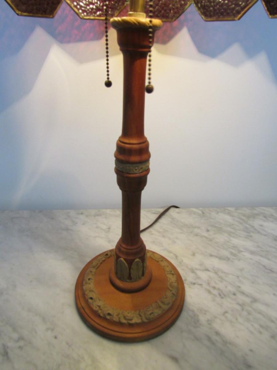 Table Top Lamp with Stained Glass Shade and Carved Wooden Post