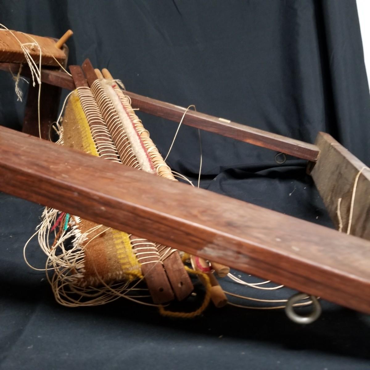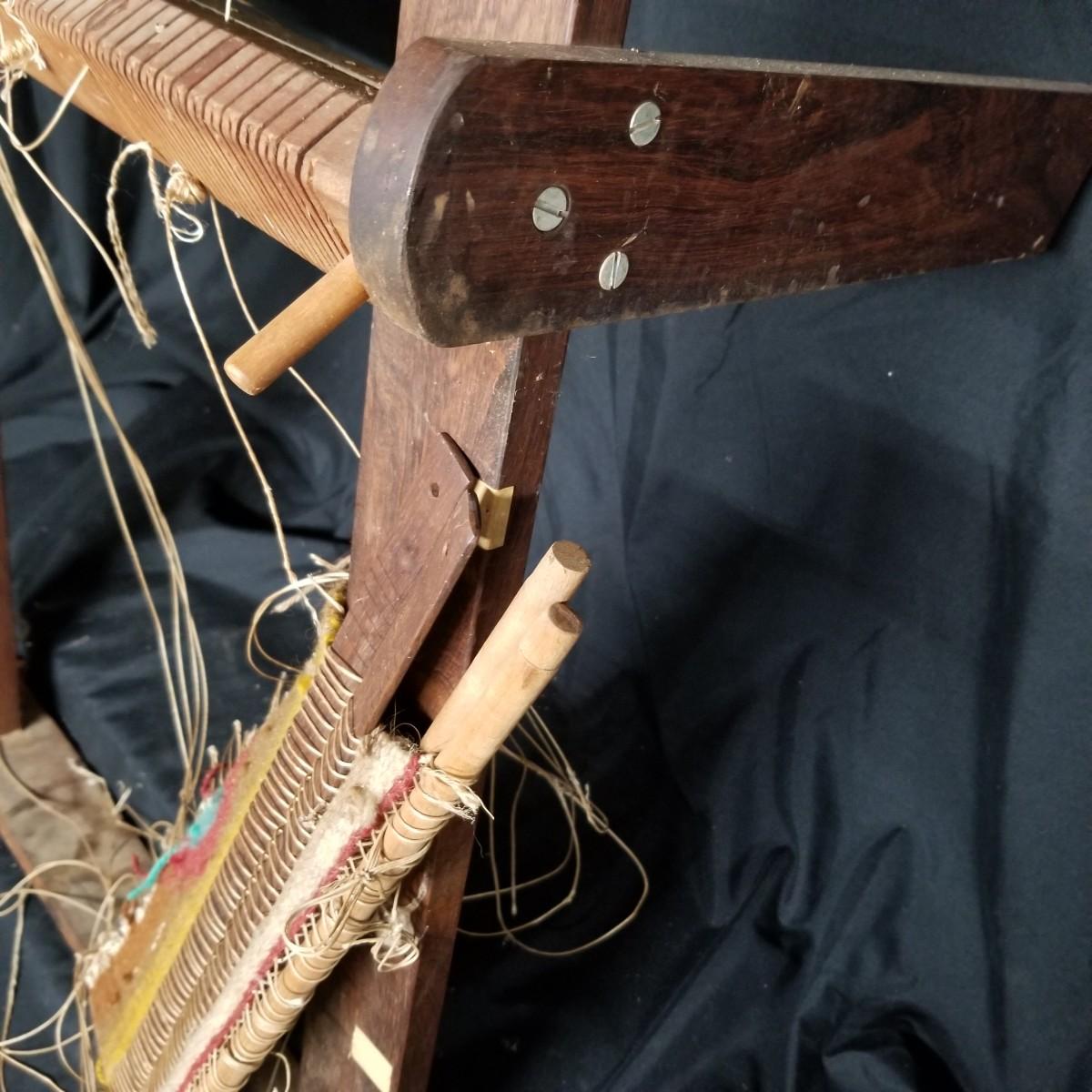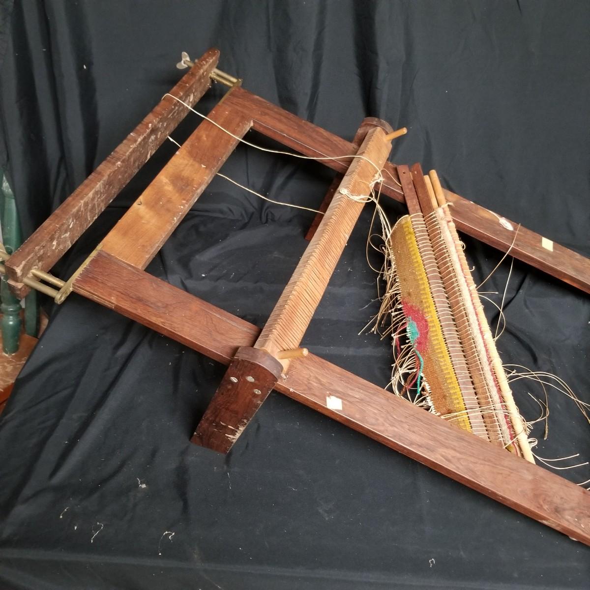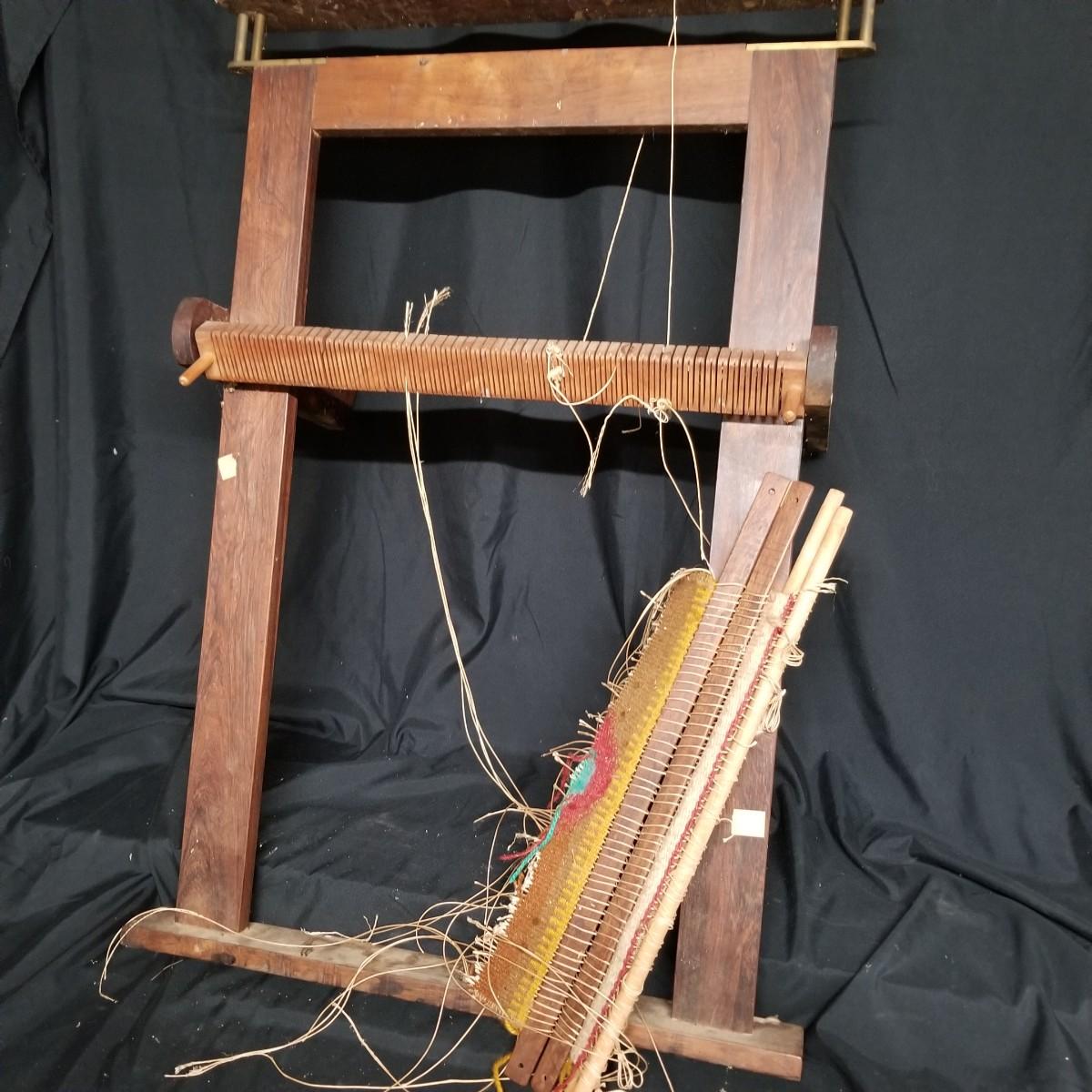 Table top weaving loom. Loom is made of dark wood, piece appears vintage. Item measures 35" x 23" x 13". Loom sits on flat surface, has angled legs for ease of use. Partial project and leash sticks included. Tension adjustment with brass hardware for warp.Local pickup only