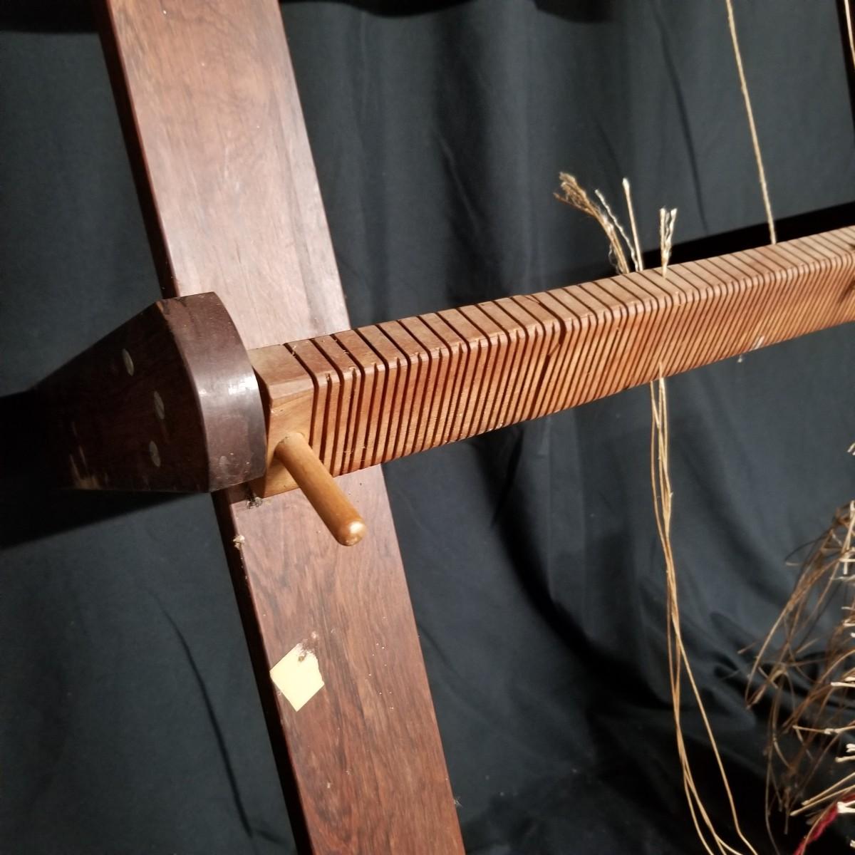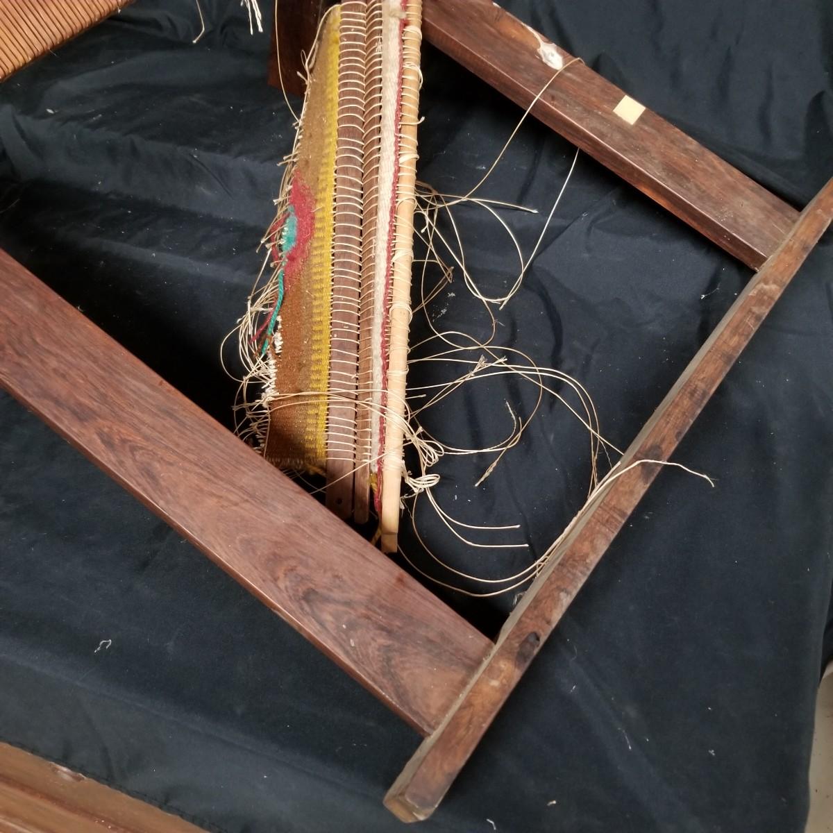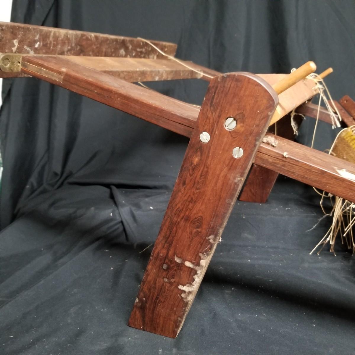 Table top weaving loom. Loom is made of dark wood, piece appears vintage. Item measures 35" x 23" x 13". Loom sits on flat surface, has angled legs for ease of use. Partial project and leash sticks included. Tension adjustment with brass hardware for warp.Local pickup only