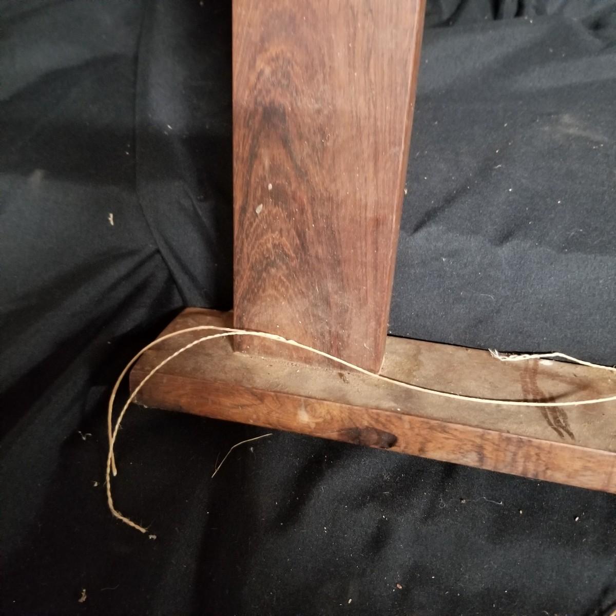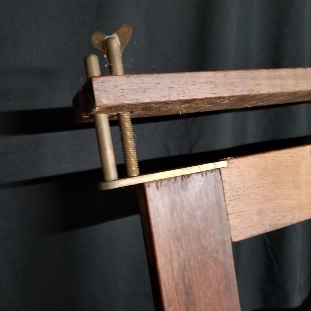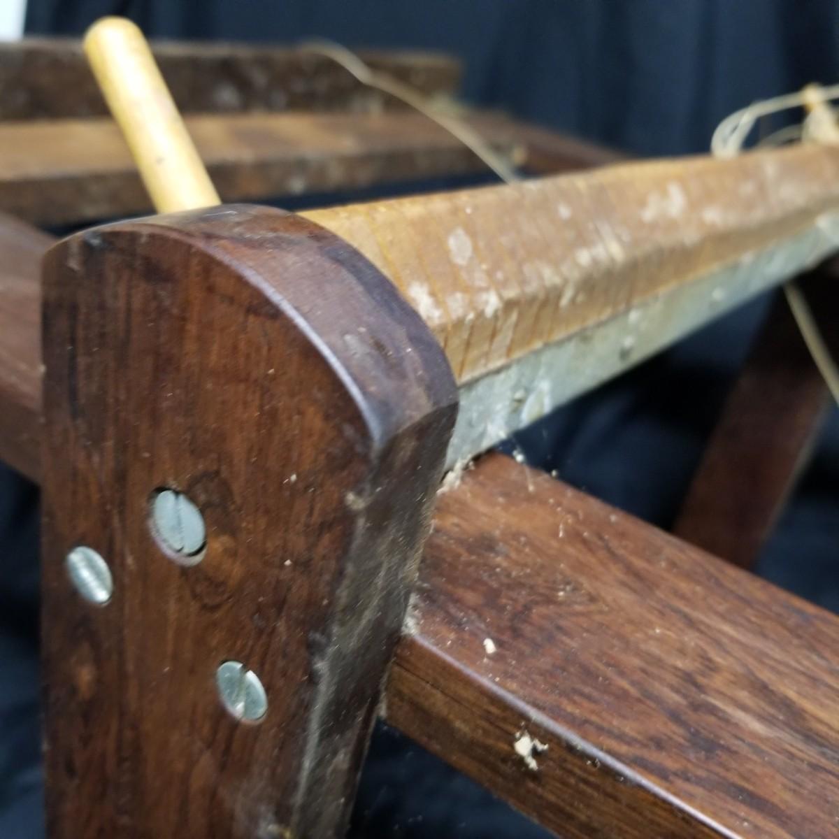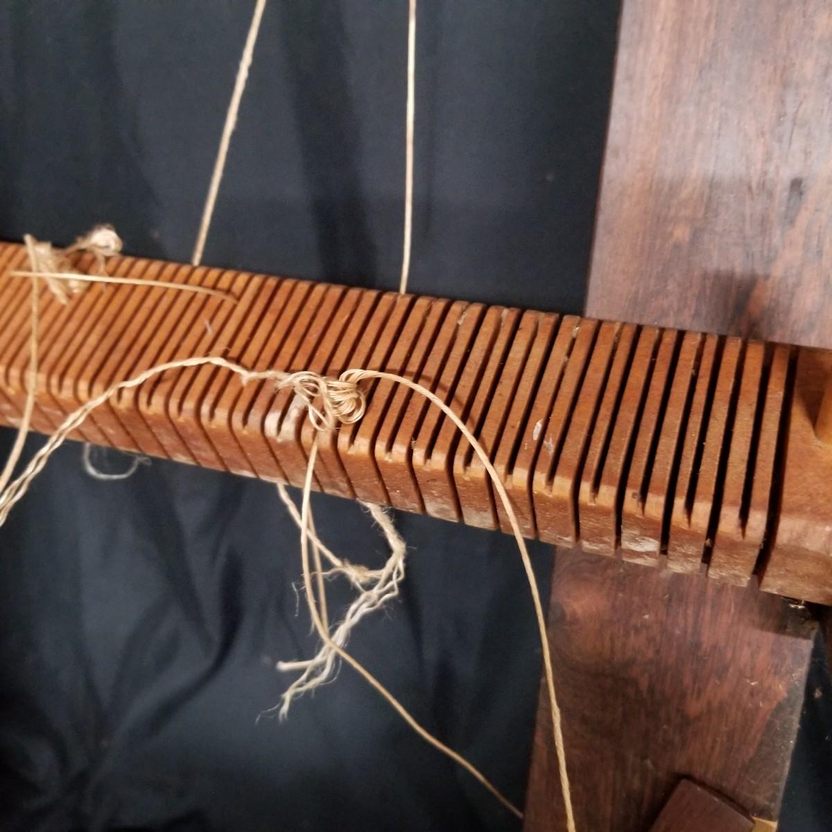 Table top weaving loom. Loom is made of dark wood, piece appears vintage. Item measures 35" x 23" x 13". Loom sits on flat surface, has angled legs for ease of use. Partial project and leash sticks included. Tension adjustment with brass hardware for warp.Local pickup only
