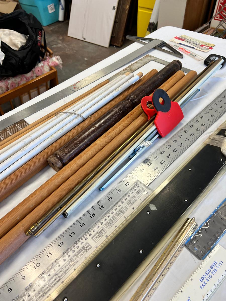 Dowel collection, T square framing square, Metal rulers rods and a postage scale.
