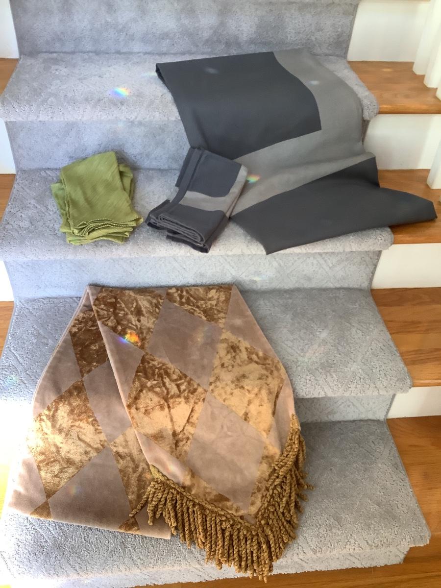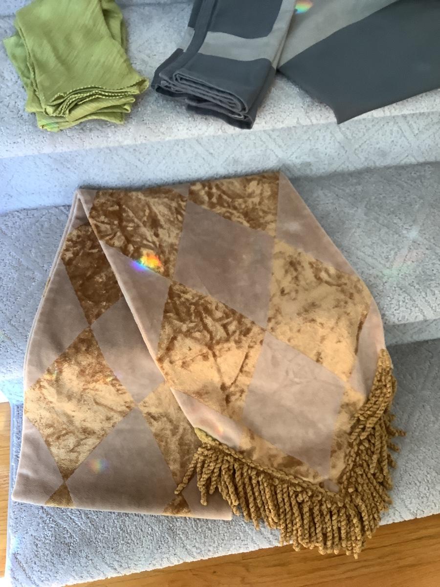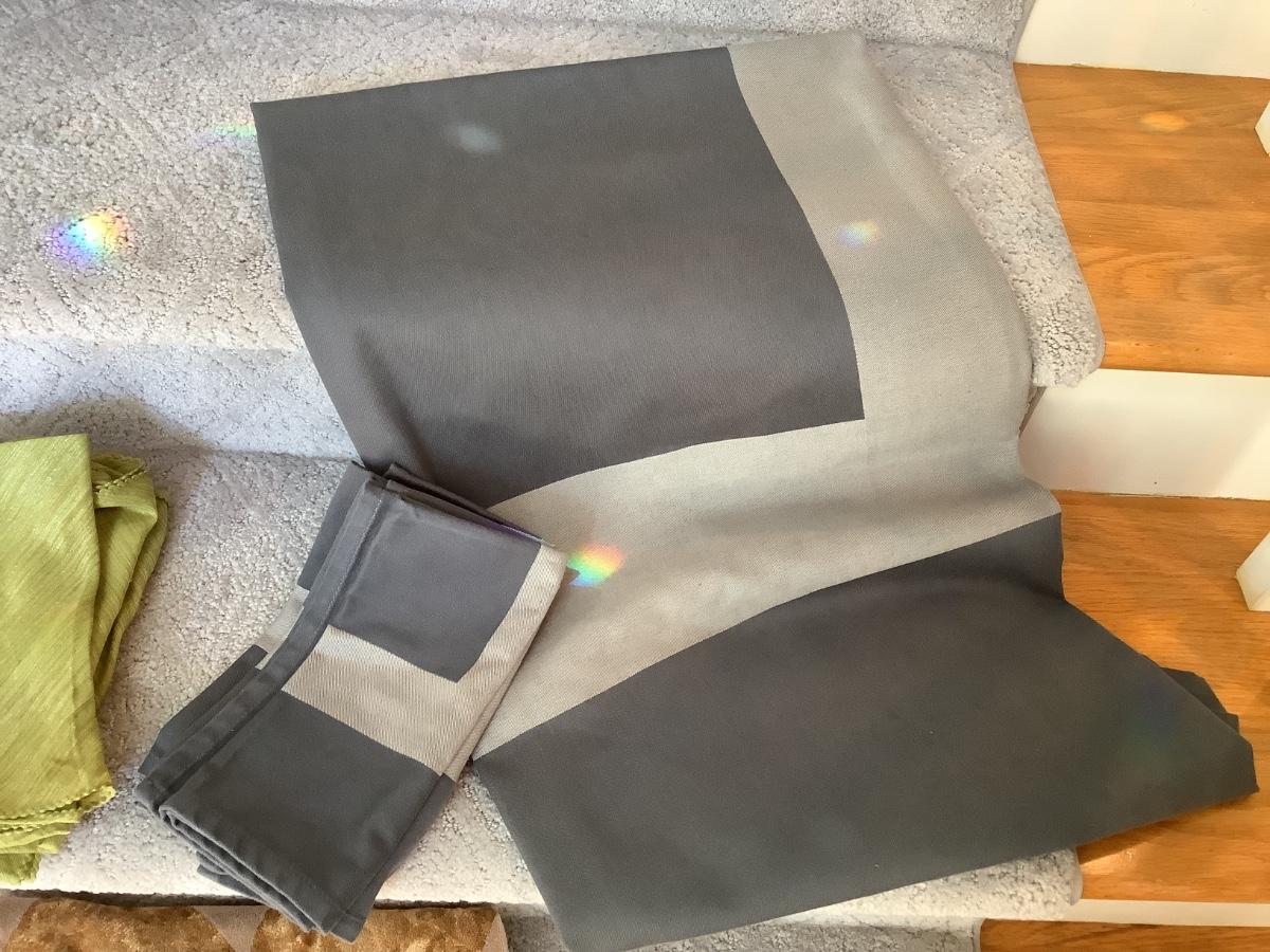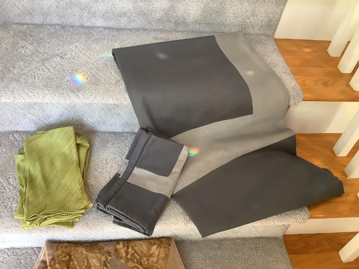 tablecloth 60"x60" freshly cleaned with 3 matching napkins, runner freshly cleaned, 3 green napkins