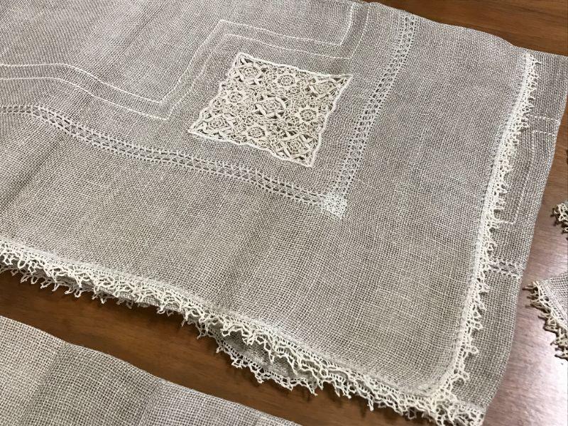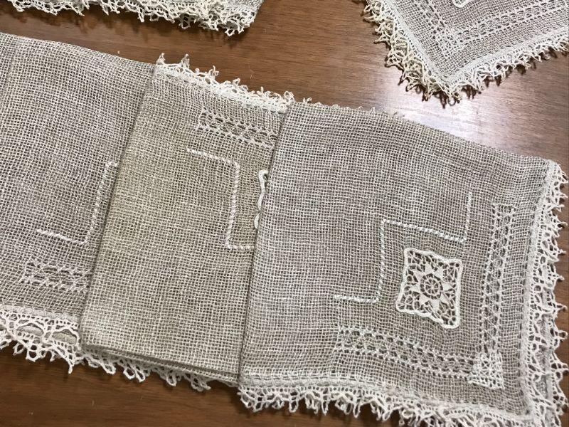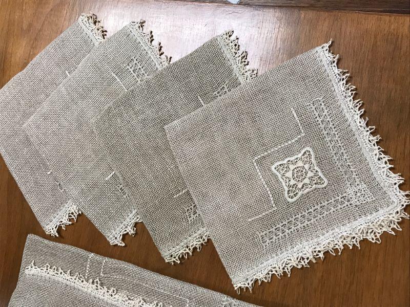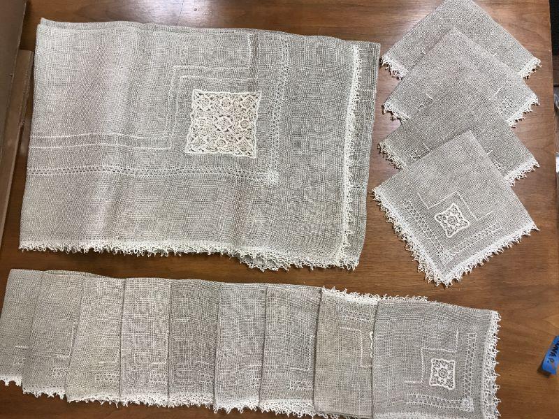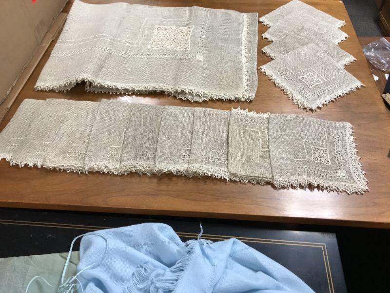 Rustic Burlap Tablecloth and 12 napkins vintage linen, light brown with cream lace trim