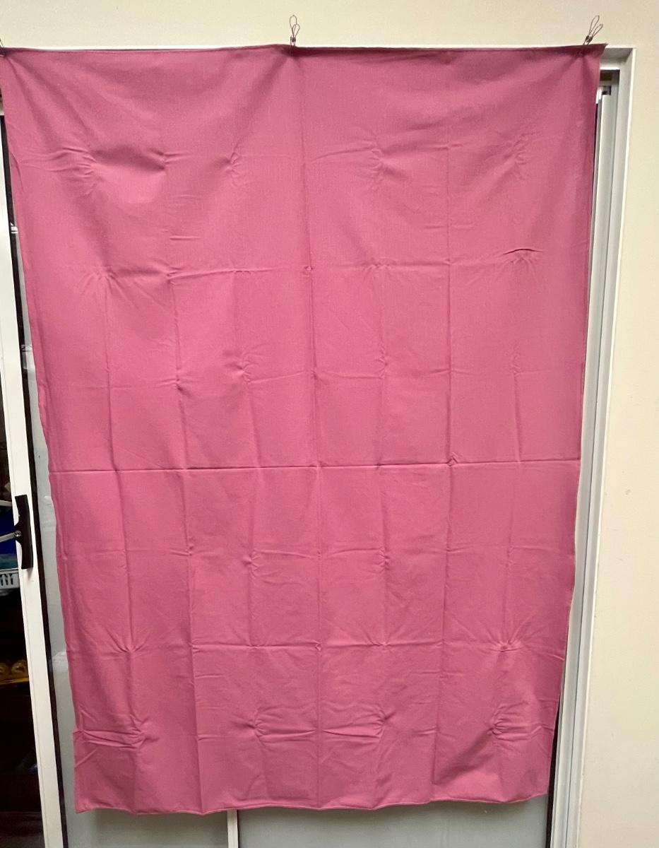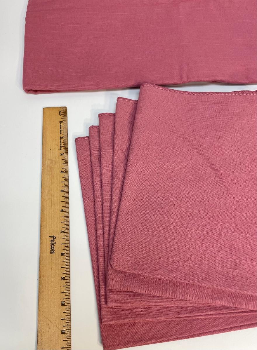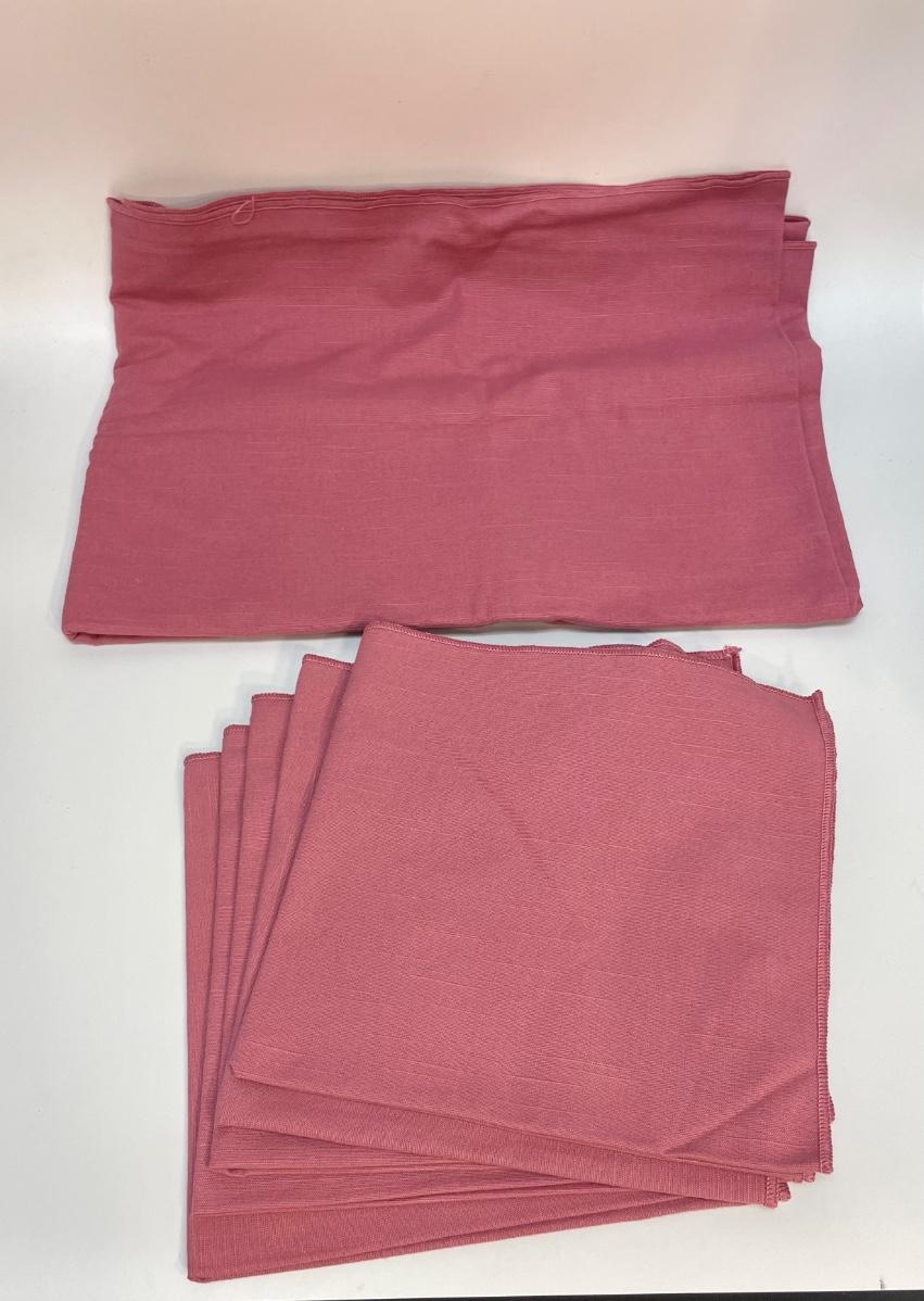Rectangular 50” x 68” tablecloth with 5 matching square napkins, each approx 18” x 18”. Color is mauve or dusty rose.