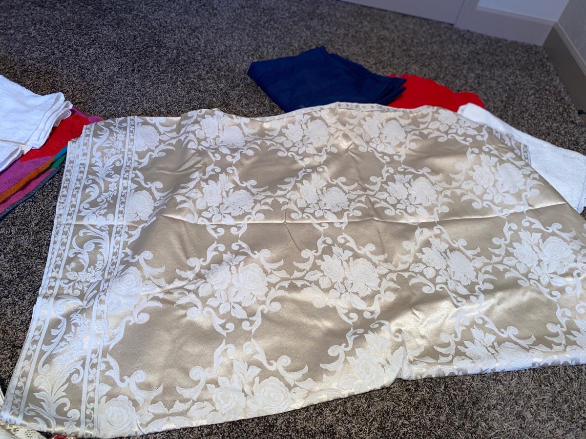 Tablecloths run about 58” X 128”..