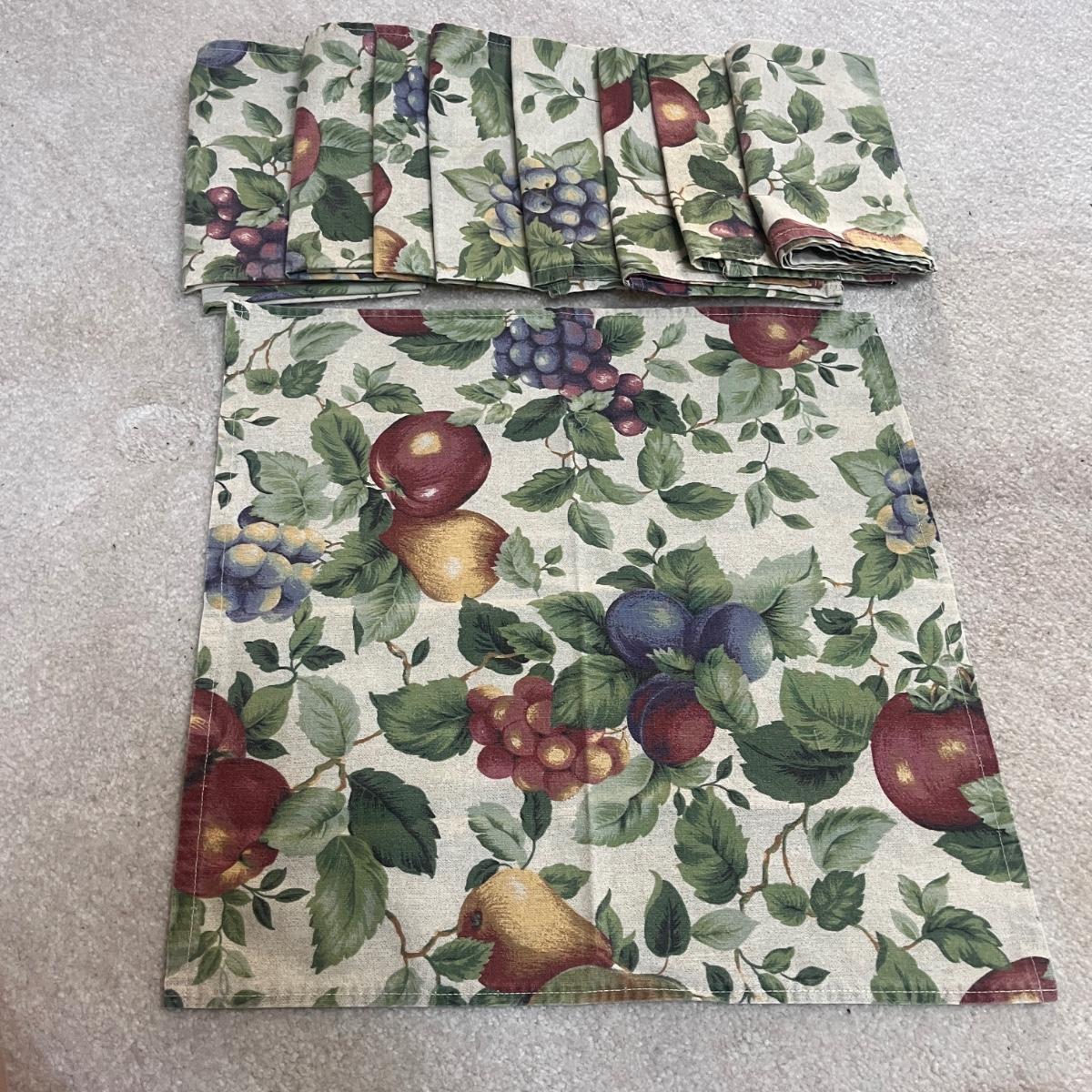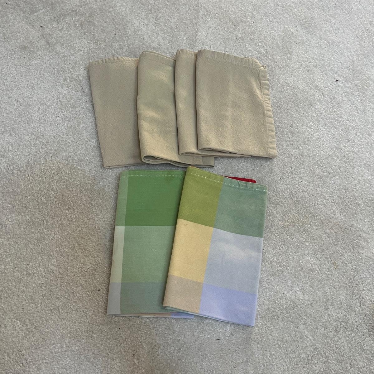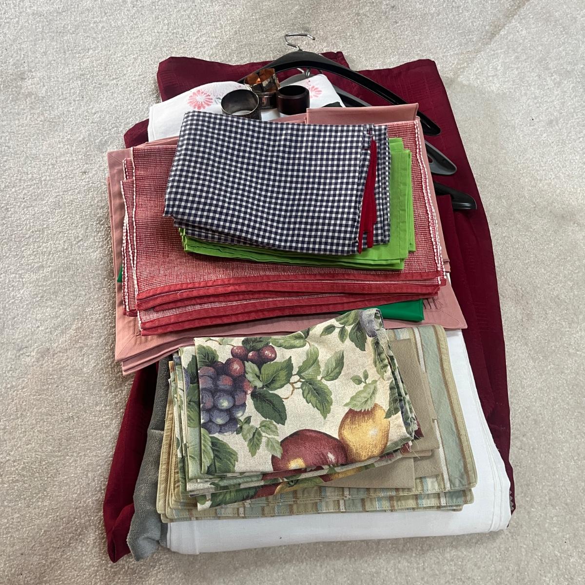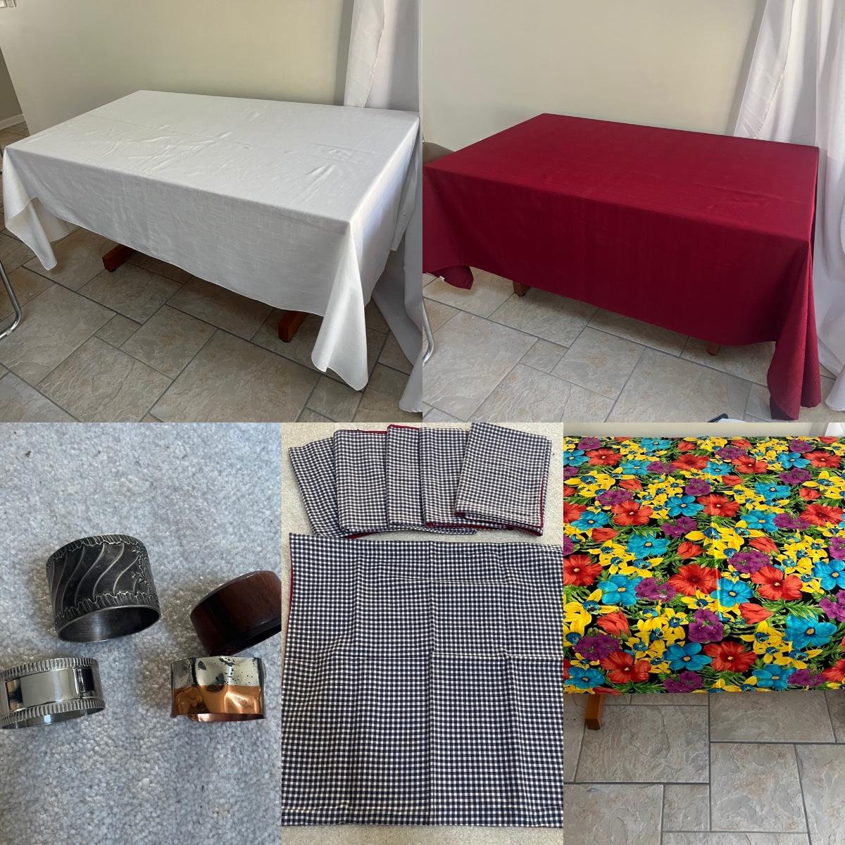 Lot includes five tablecloths with all tablecloths shown on a 60” x 36” table, four napkin rings in metal and plastic, five varieties of napkins and four different styles of tablecloths. Largest tablecloth measures 100” x 58”.