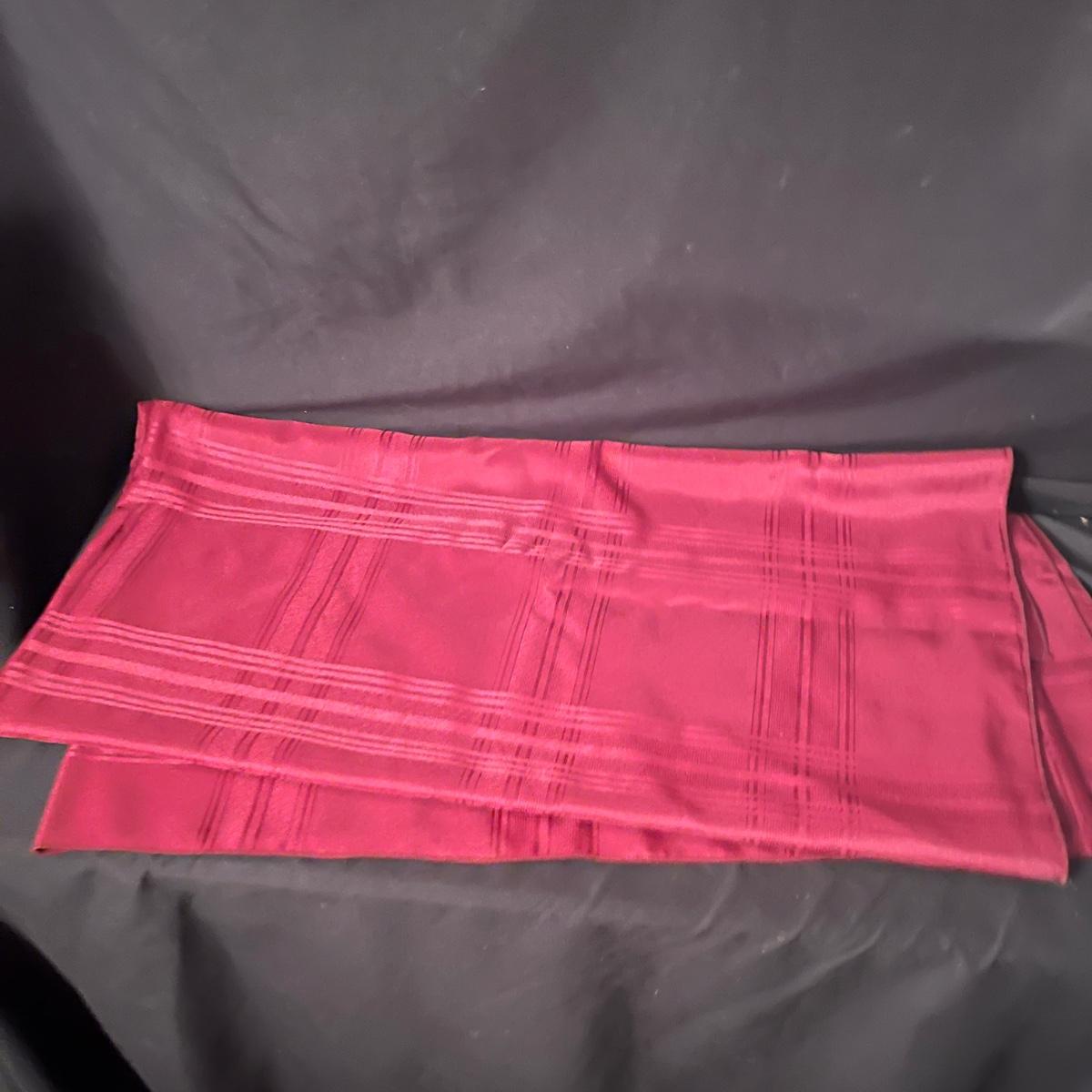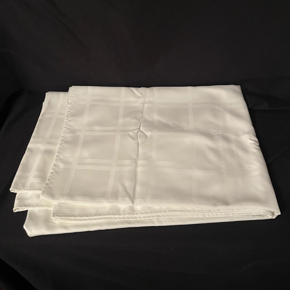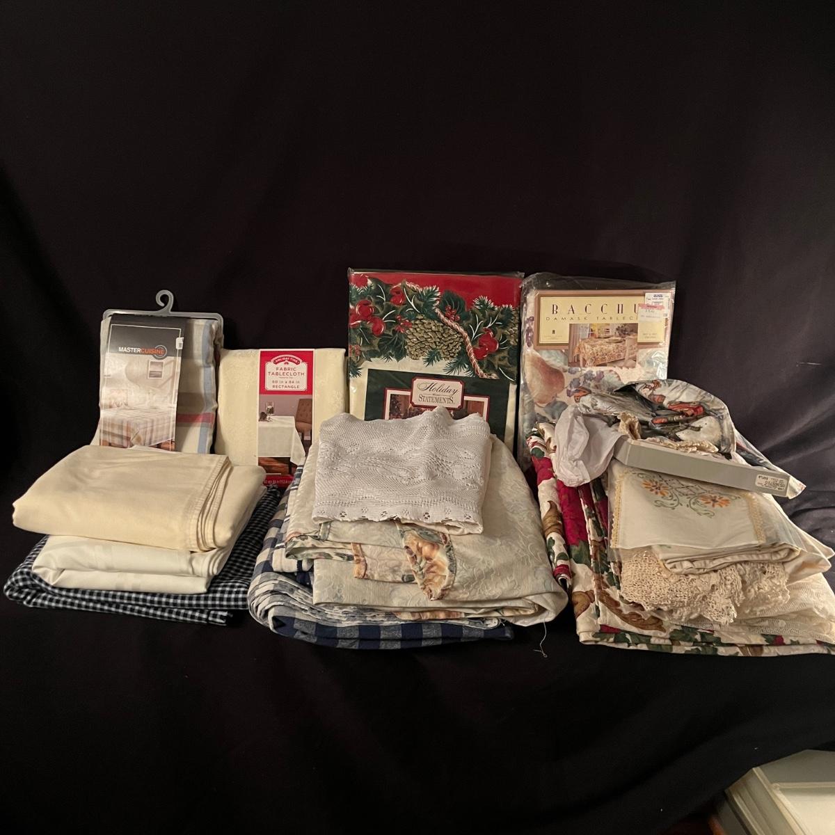 Lot includes an assortment of tablecloths and table runners. Four are still in packaging with the largest 60” x 120”. The others are a variety of sizes with the largest measuring 54” x 90”. Most tablecloths are rectangular.