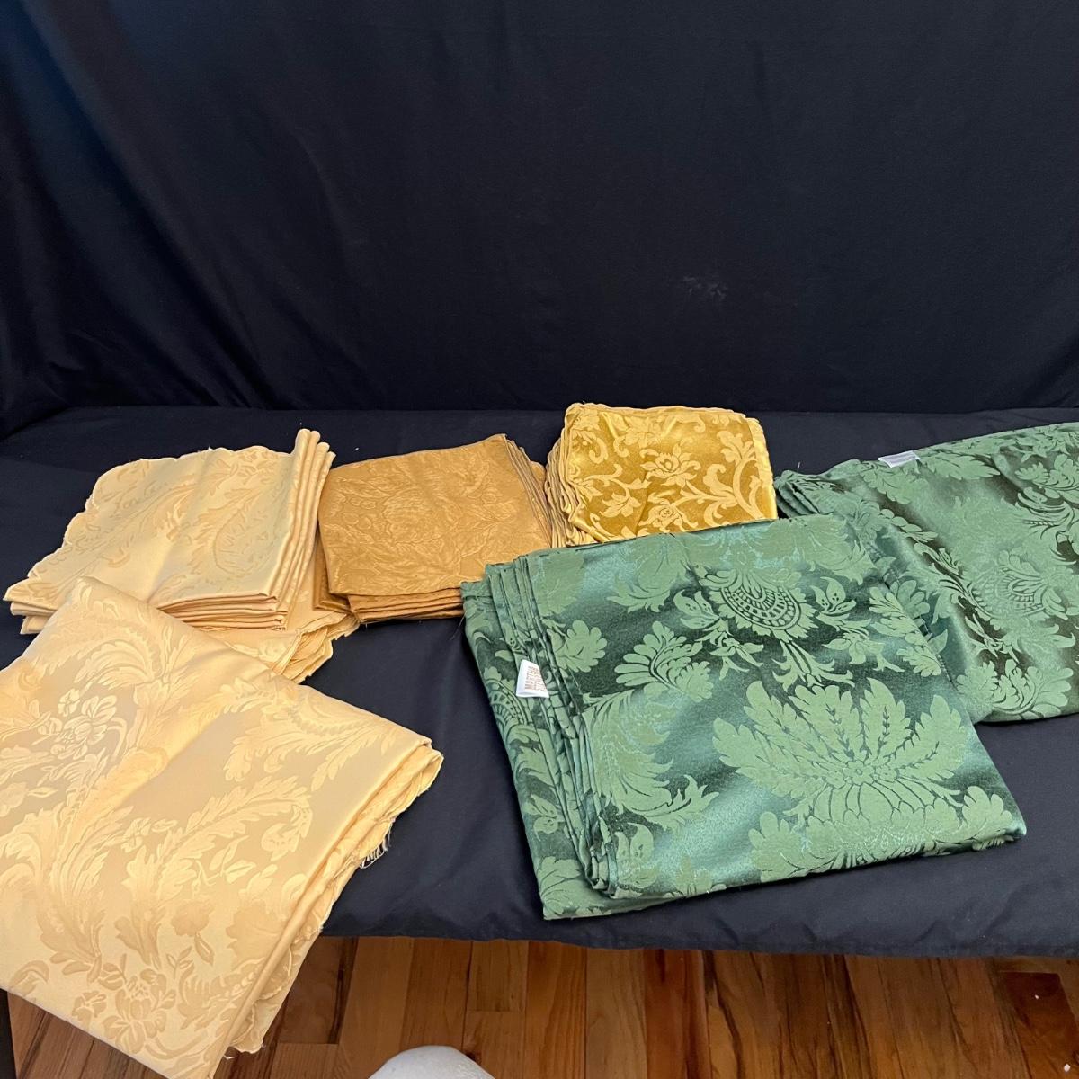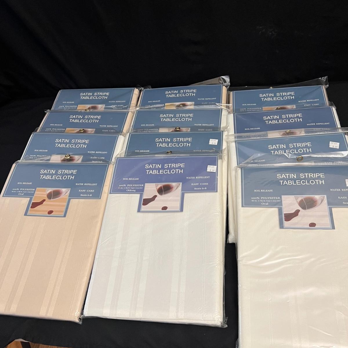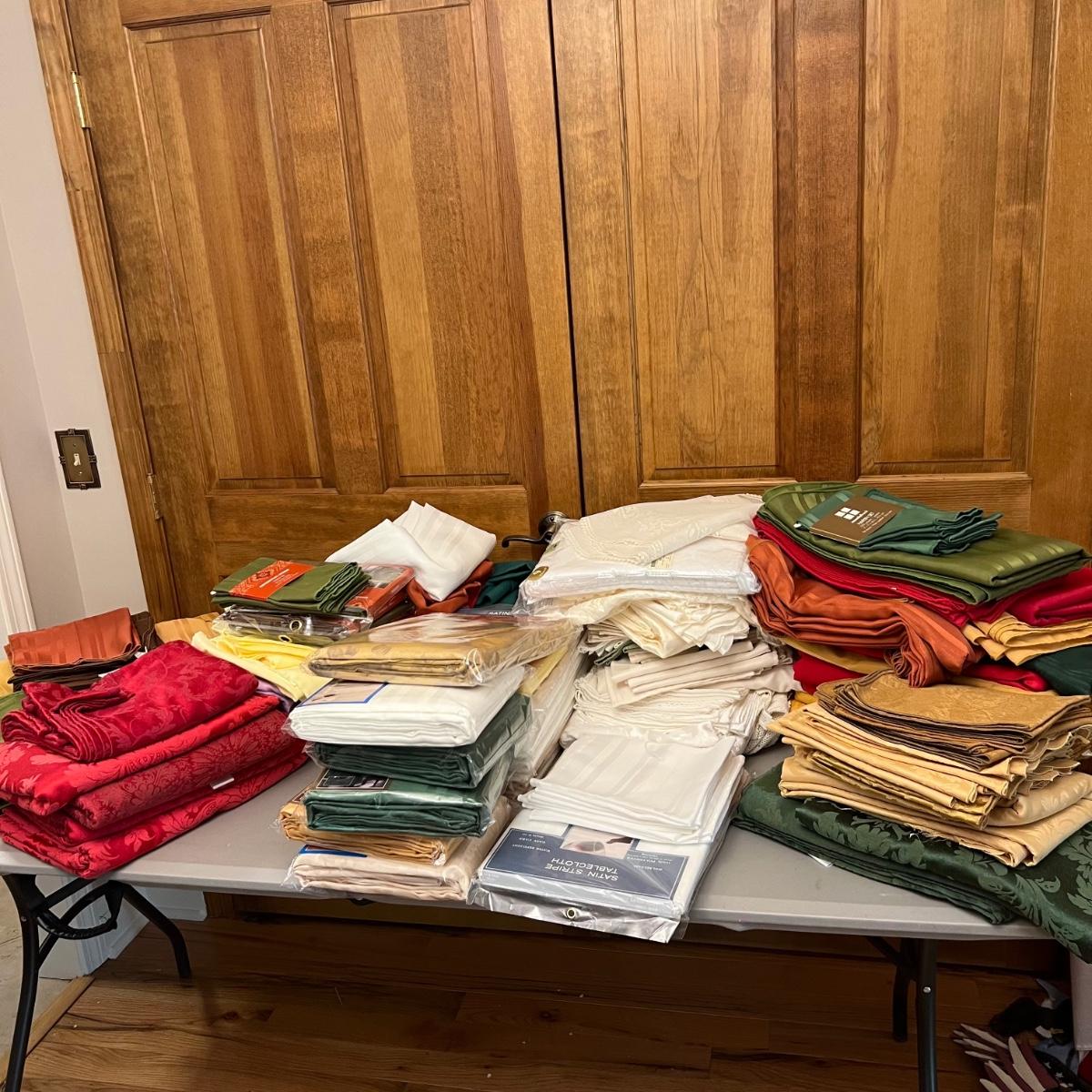 Over 50 tablecloths includes approximately 20 new in packaging; mostly the larger size at 60” x 84” with approximately 10 that are 50” x 70”, these are the ones photographed with a mauve tablecloth placed on a 3’ x 6’ table. Plenty of sets of napkins included, see images for full inventory.