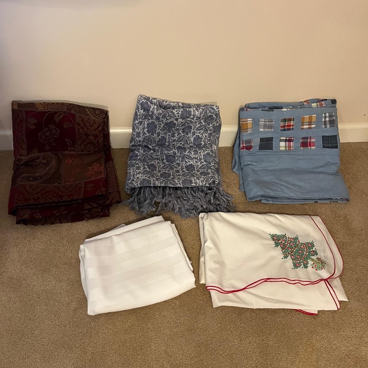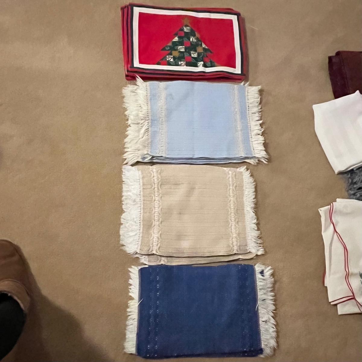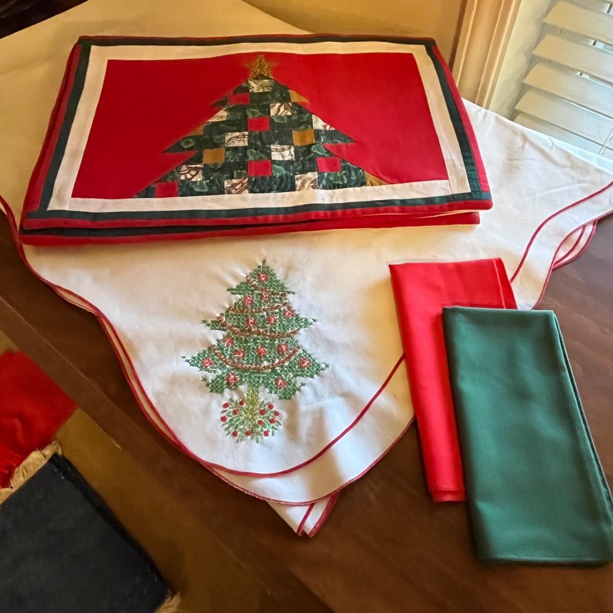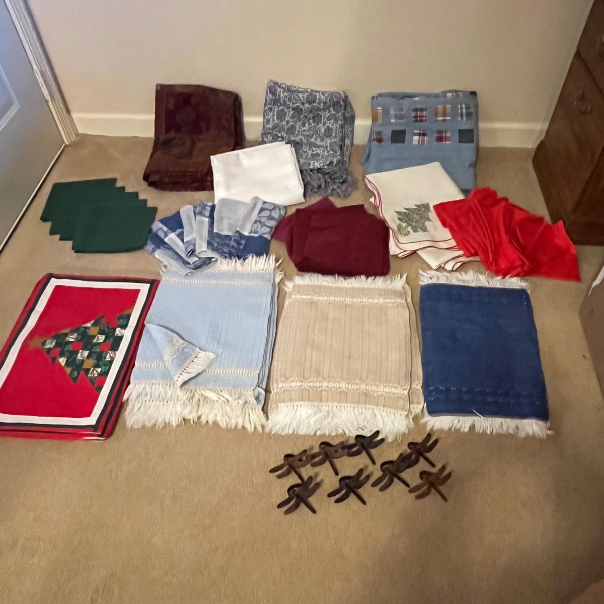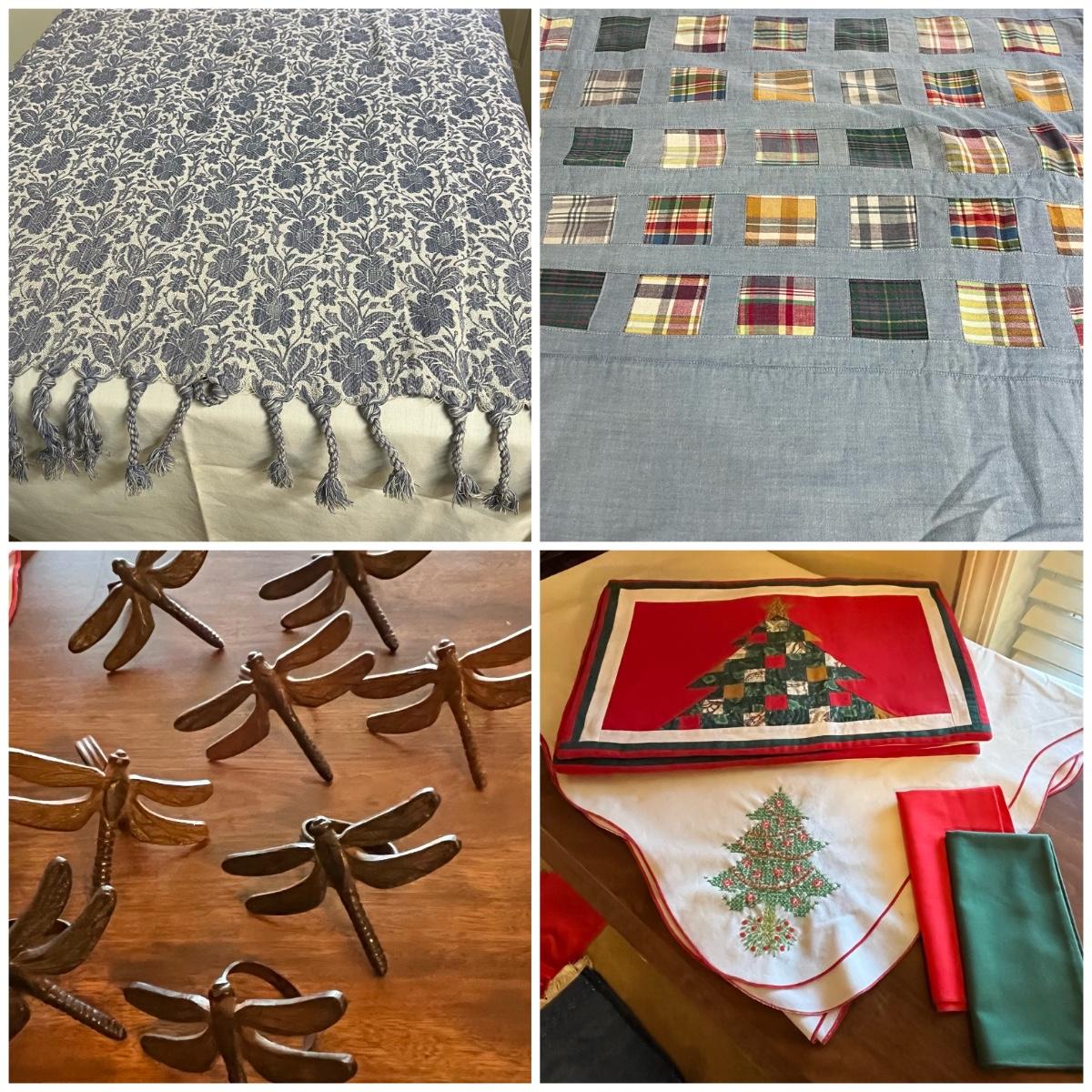 This grouping includes five tablecloths in various sizes, four sets of placemats, four sets of napkins and metal dragonfly napkin rings. Christmas tablecloth measures 59” x 84”. Blue/plaid tablecloth measures 56” x 56”. Some pieces show signs of wear. Some napkin rings have rust. See pictures.