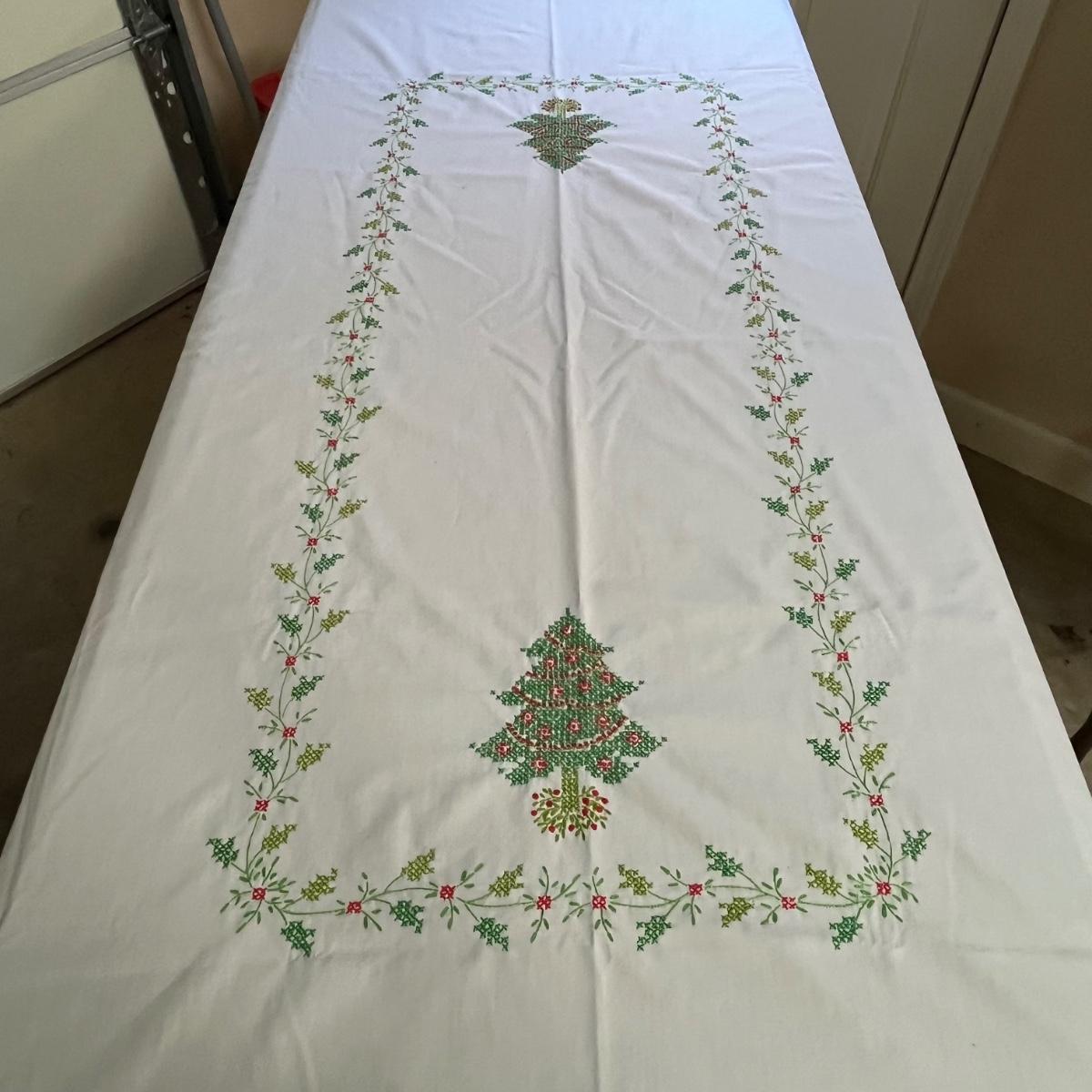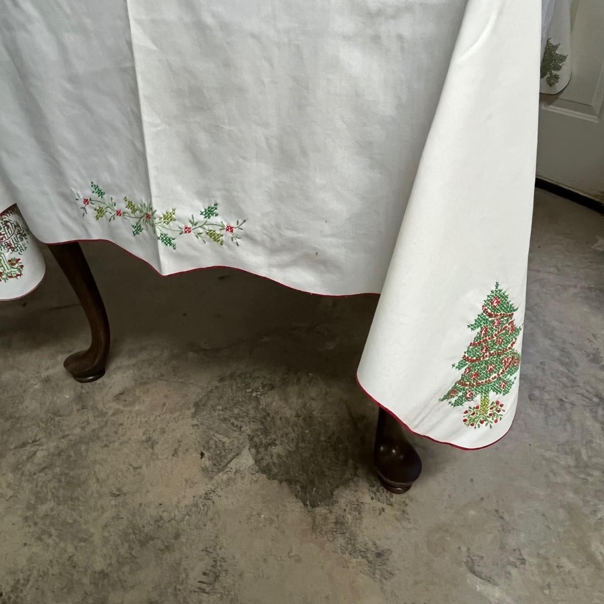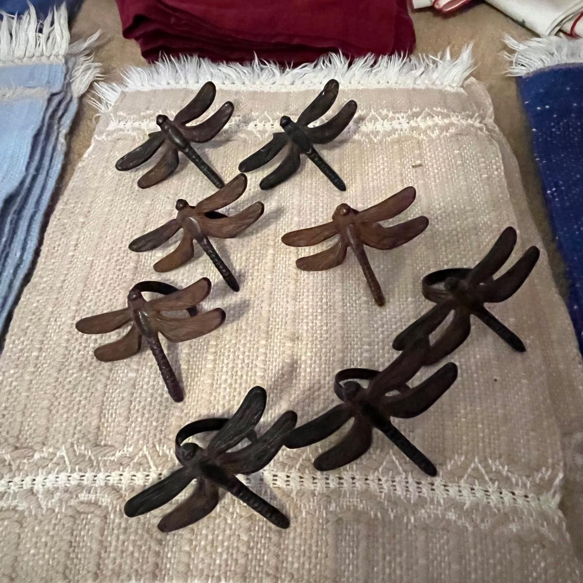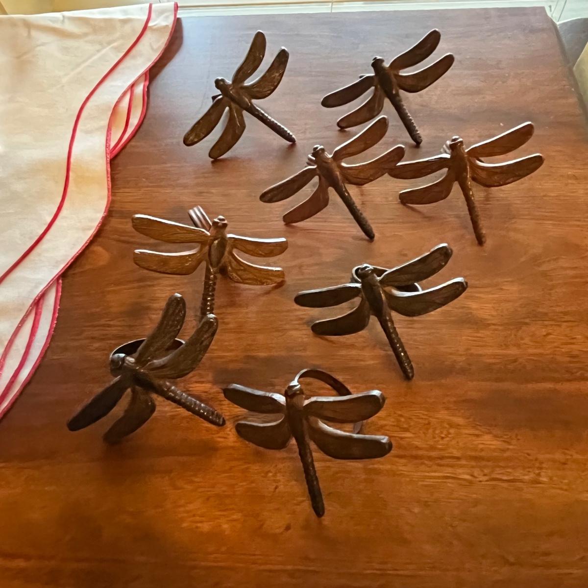 This grouping includes five tablecloths in various sizes, four sets of placemats, four sets of napkins and metal dragonfly napkin rings. Christmas tablecloth measures 59” x 84”. Blue/plaid tablecloth measures 56” x 56”. Some pieces show signs of wear. Some napkin rings have rust. See pictures.