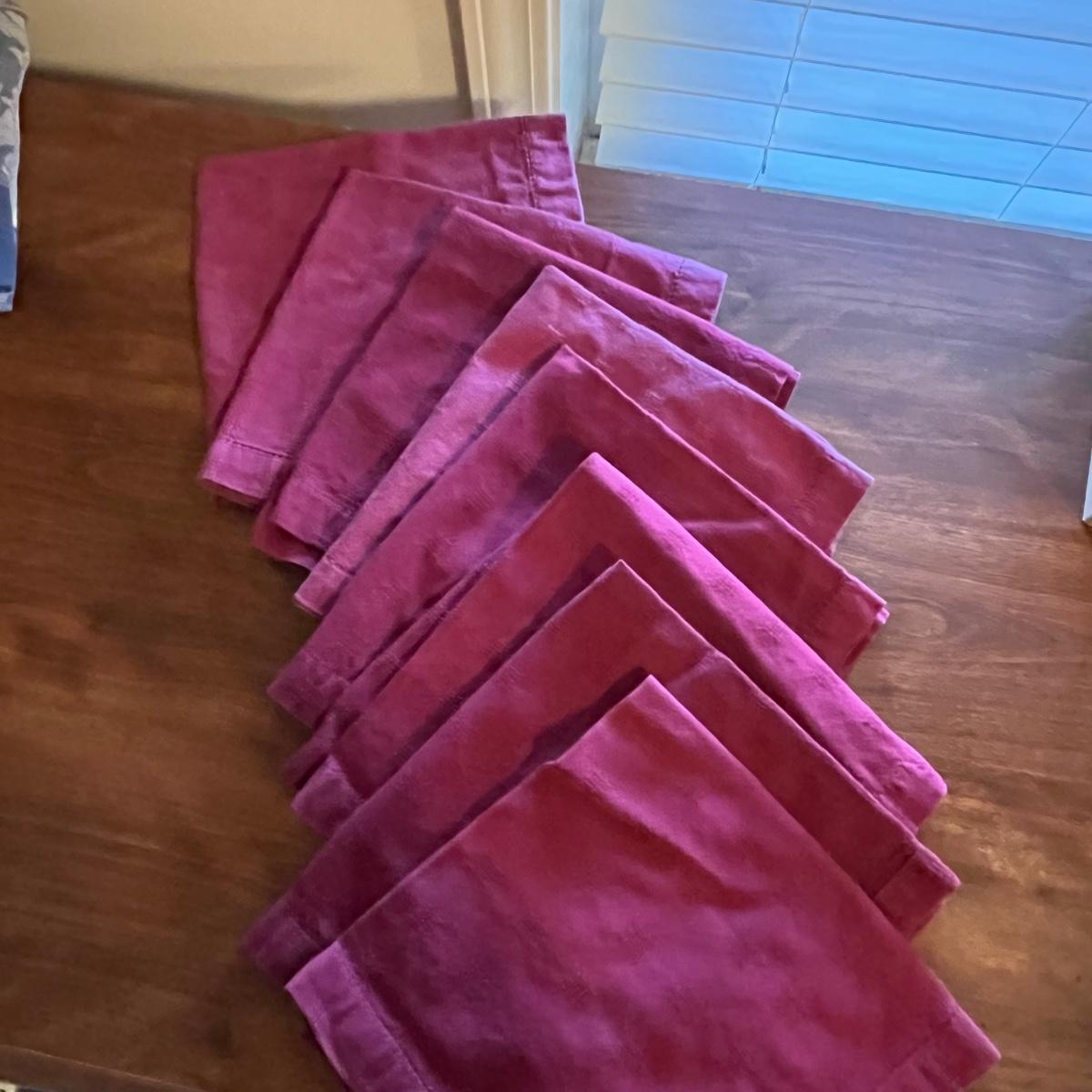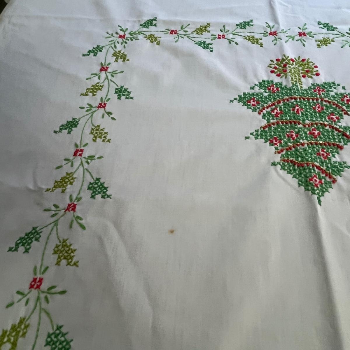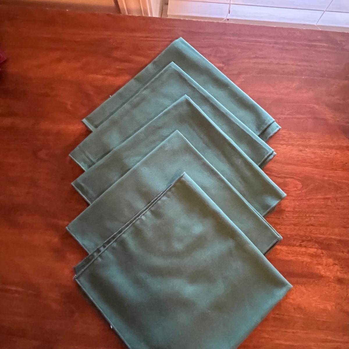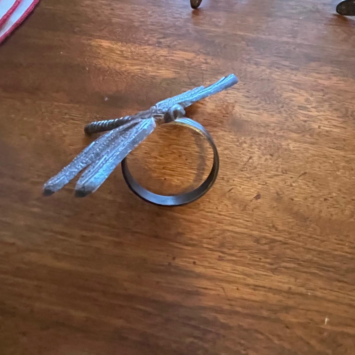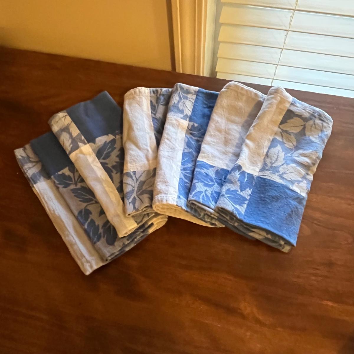 This grouping includes five tablecloths in various sizes, four sets of placemats, four sets of napkins and metal dragonfly napkin rings. Christmas tablecloth measures 59” x 84”. Blue/plaid tablecloth measures 56” x 56”. Some pieces show signs of wear. Some napkin rings have rust. See pictures.