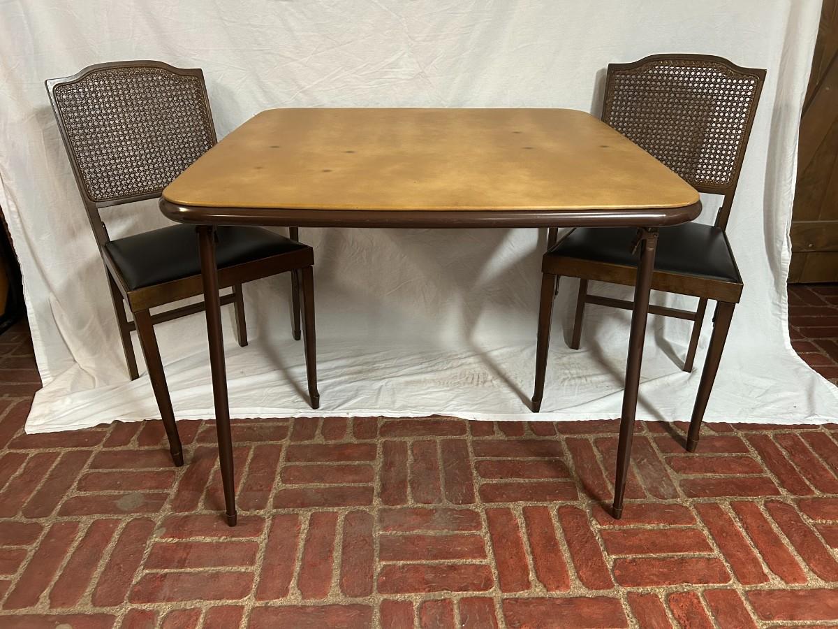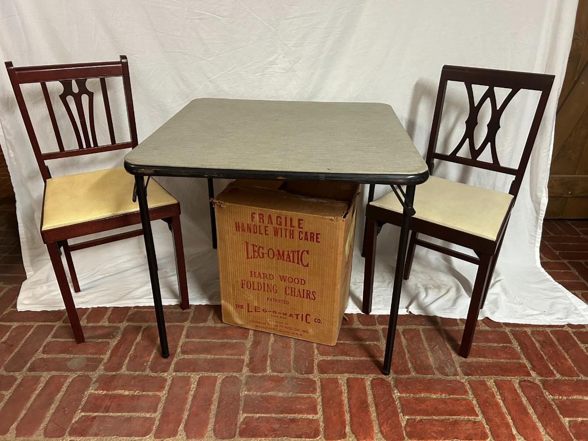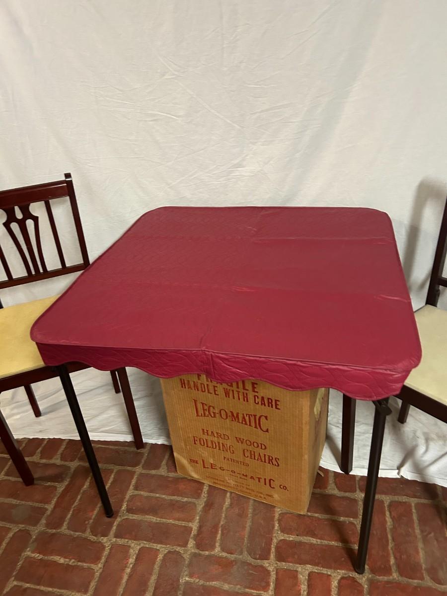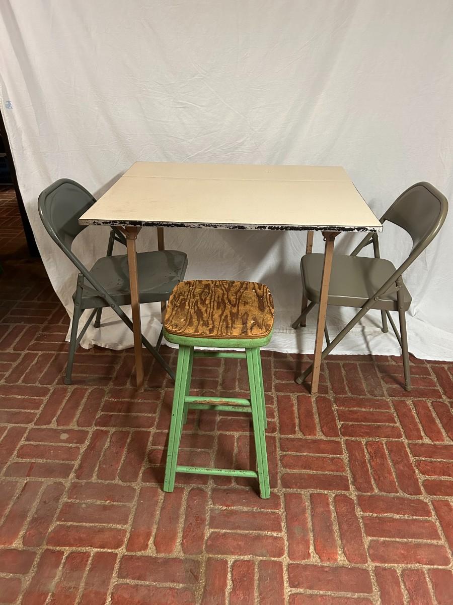 This lot is a must bid for those who are always hosting for the holidays and throwing parties. Included are three card tables, two metal folding chairs, one cool green stool, 8 wood folding chairs and one red fitted table cloth.