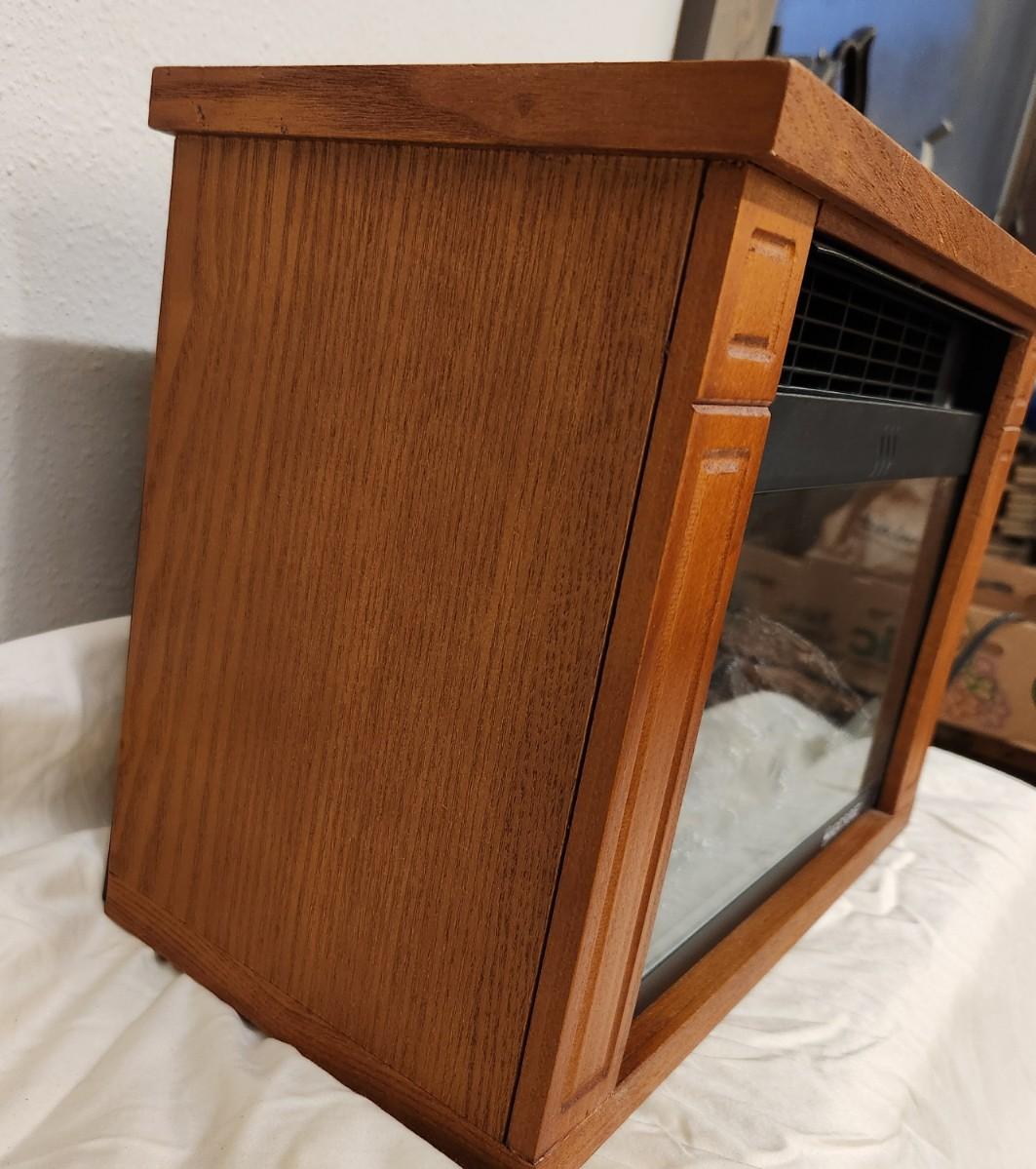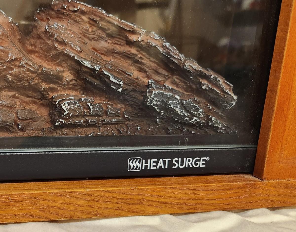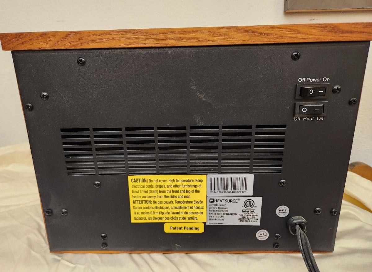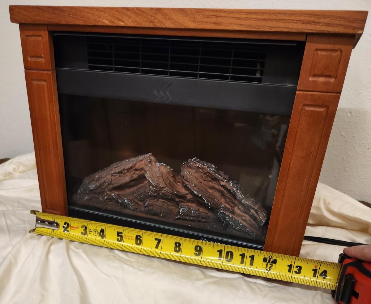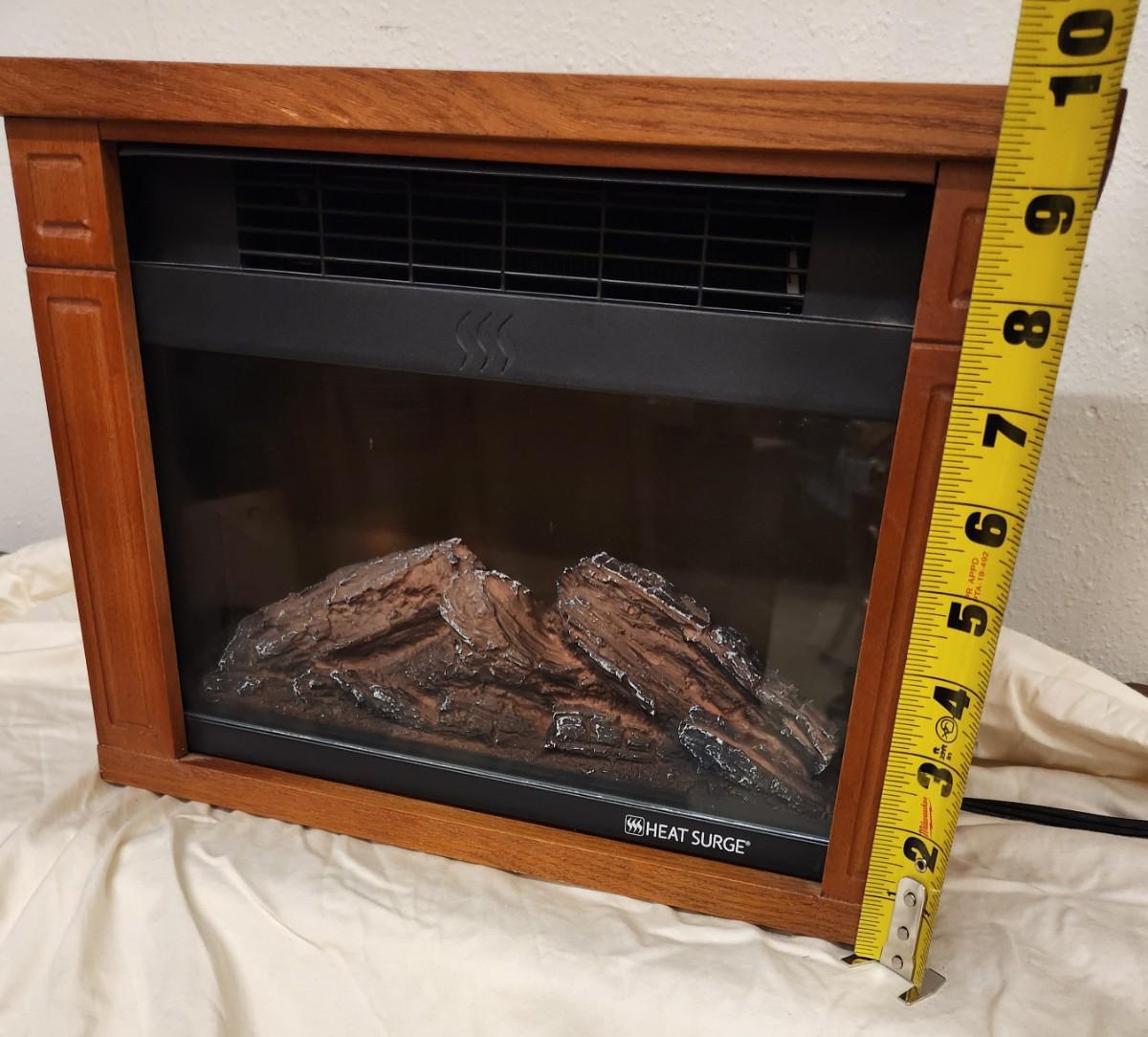 Cute little fireplace heater...perfect for a desk or cubicle. Dimensions in photos
