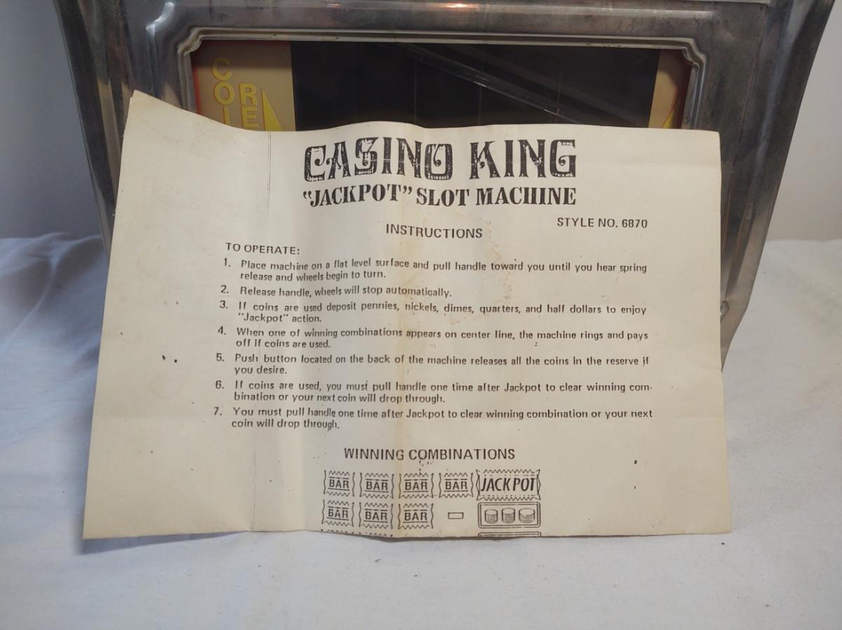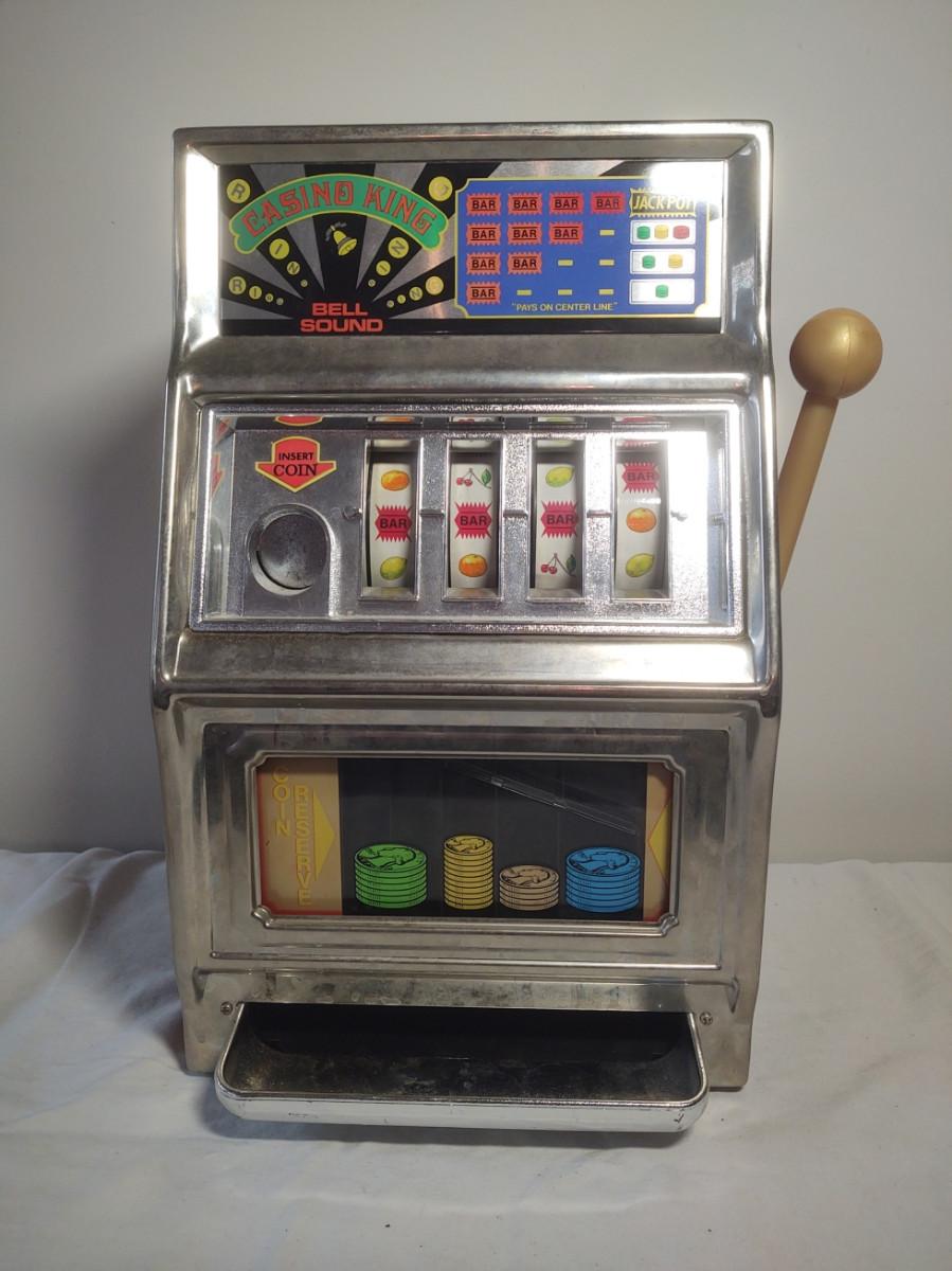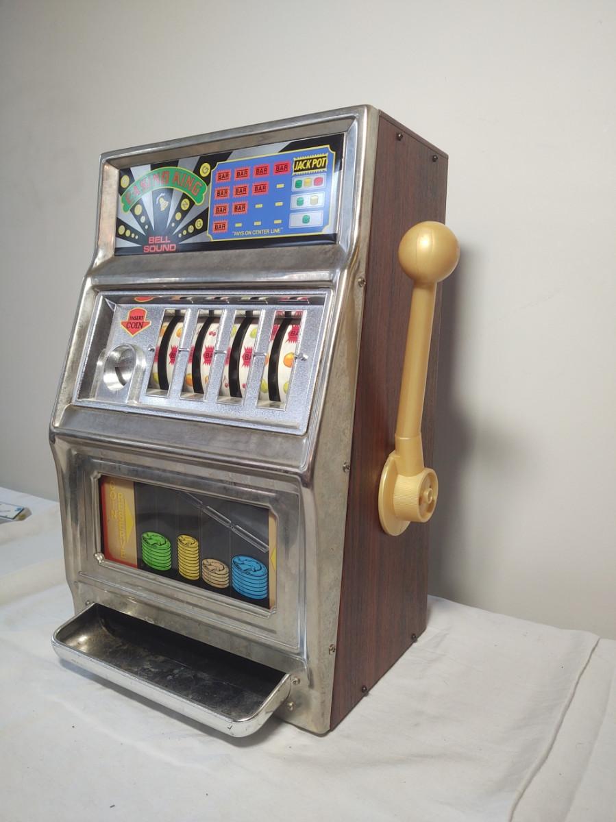 Slot machine functions normally. This is a tabletop version that is not intended for actual gaming. Manual included.