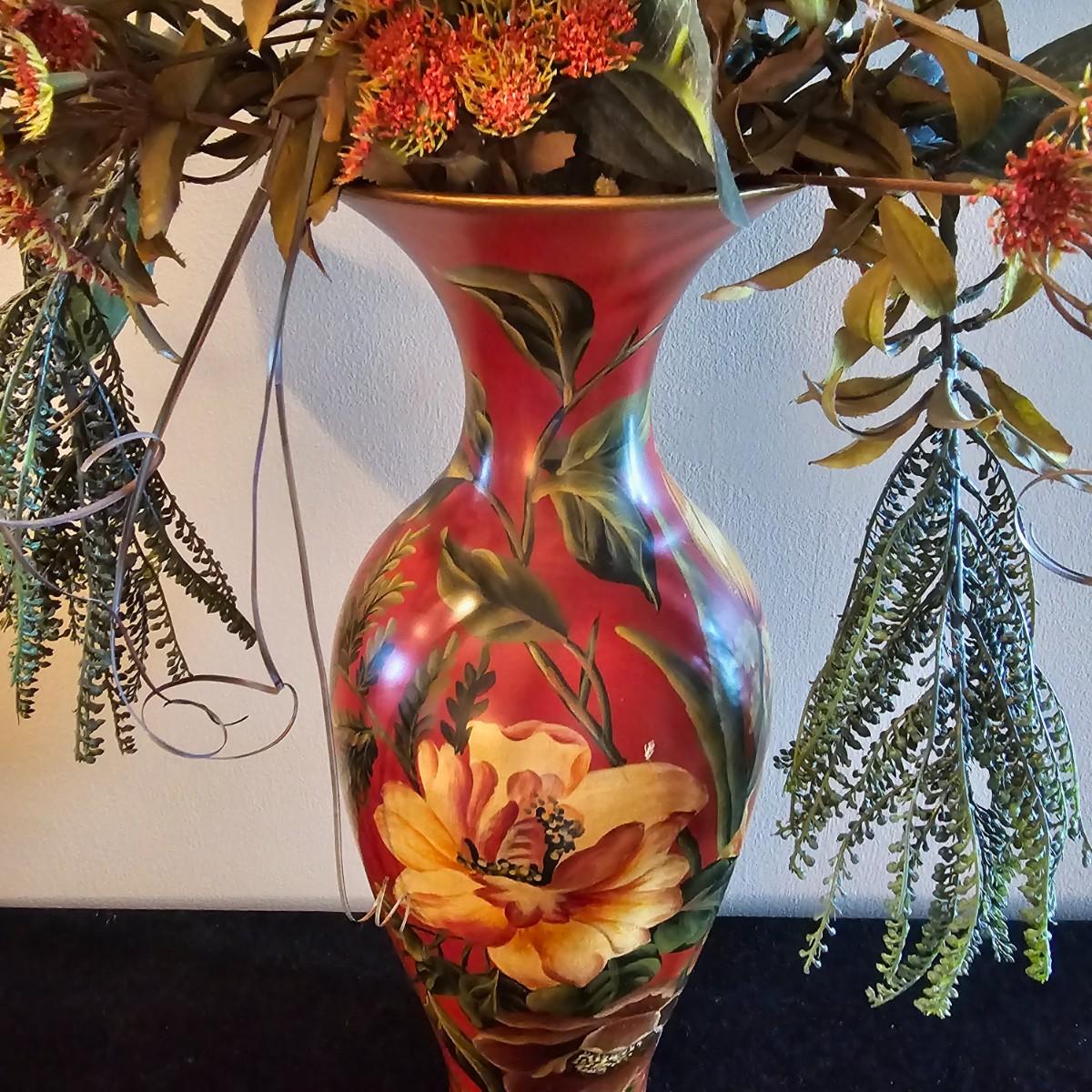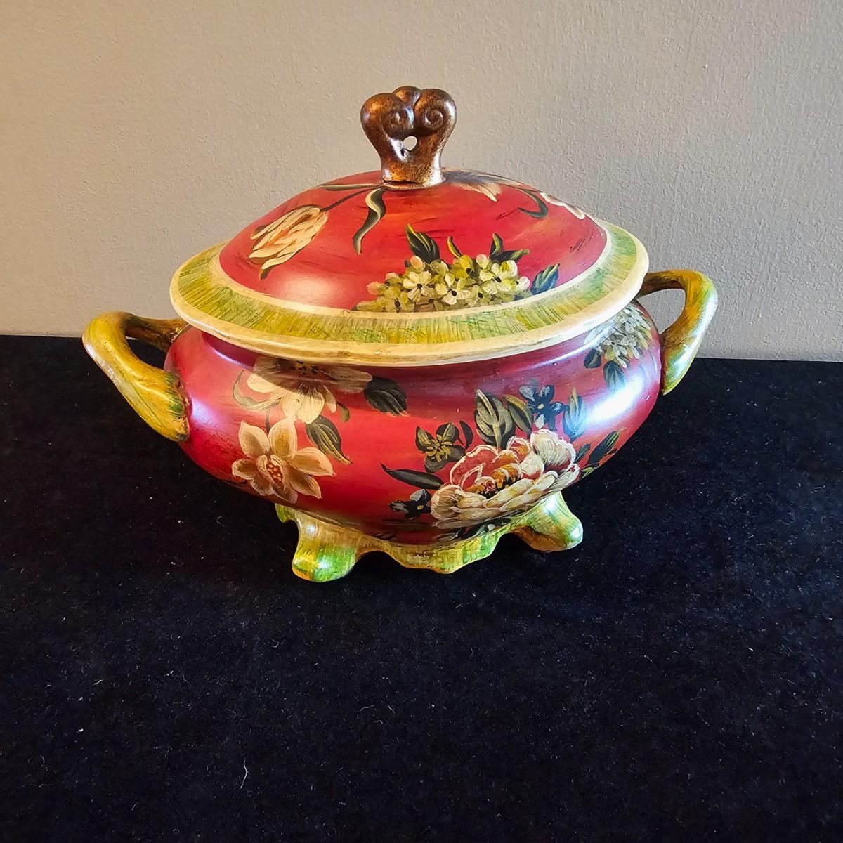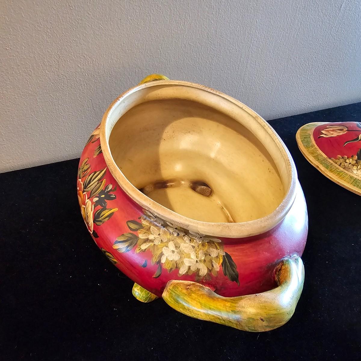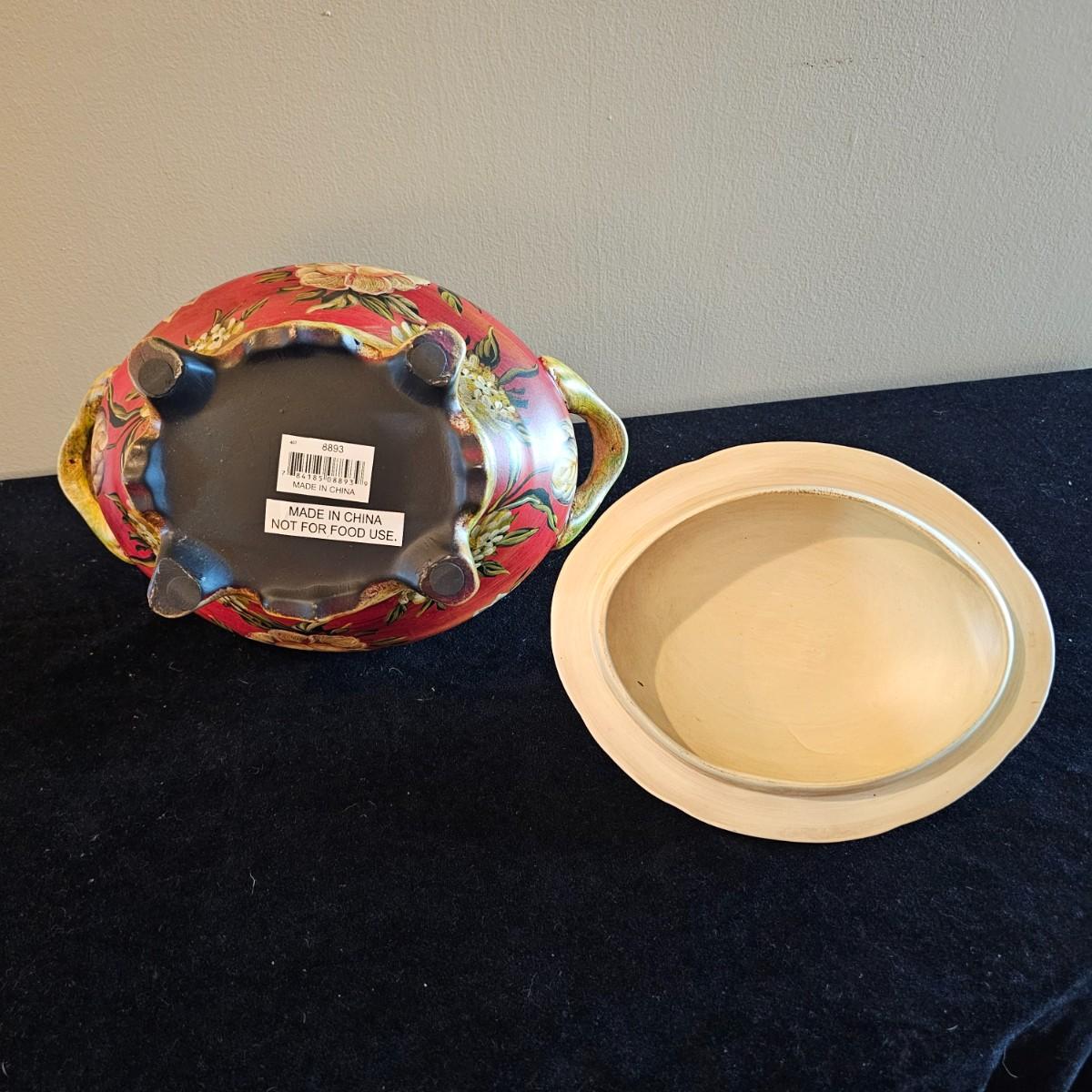 Tall vase with floral design is 6" x 17"H. With the floral piece included it is 24" x 34"H. Has dark maroon background with floral overlay. Scalloped edge bowl has matching pattern, is 12"D x 6"H. Covered dish has handles and lid, is 12" x 8" x 9"H. Pair of mosaic candleholders with metal bases, 6.5" D x 8"H. See photos for details. Local pickup only.