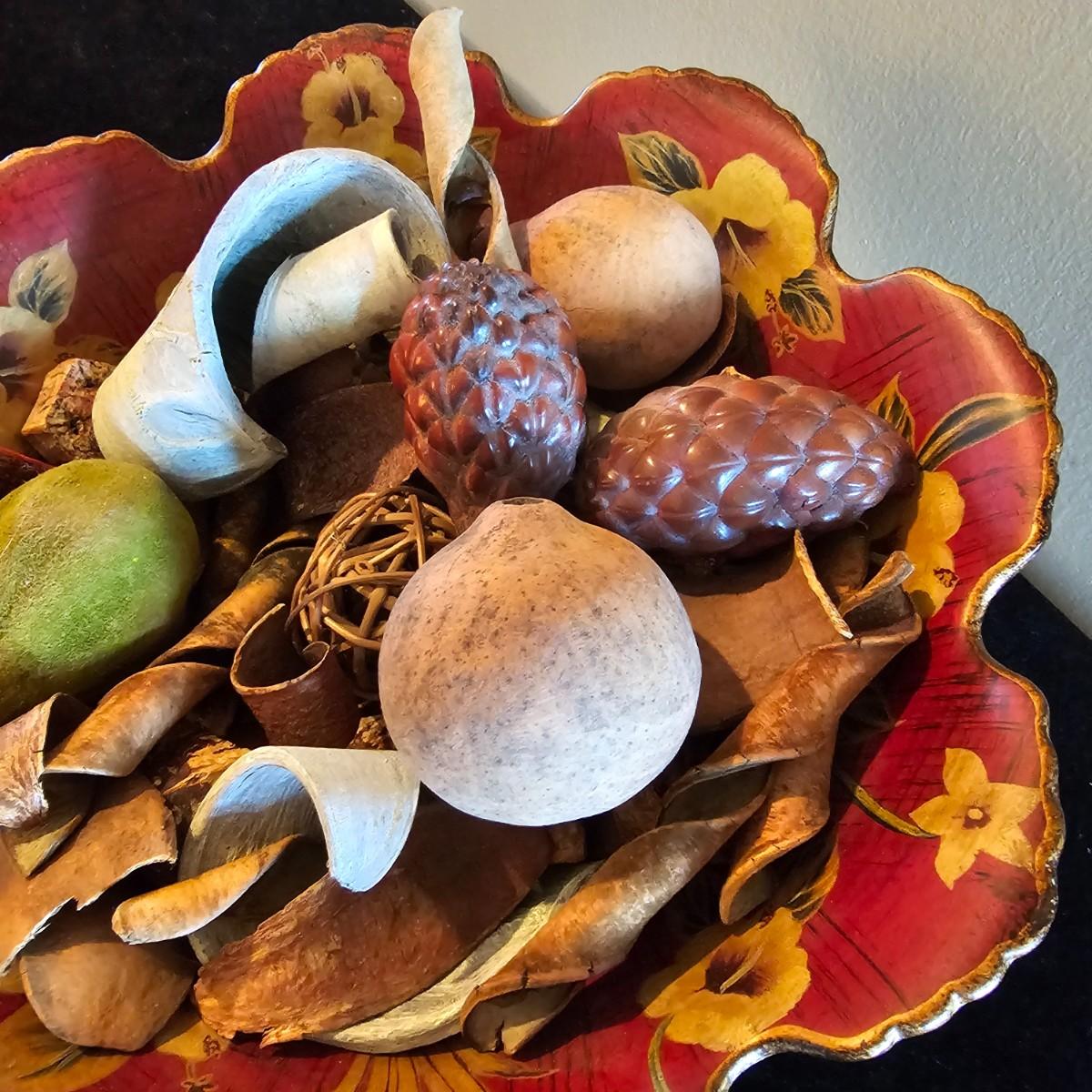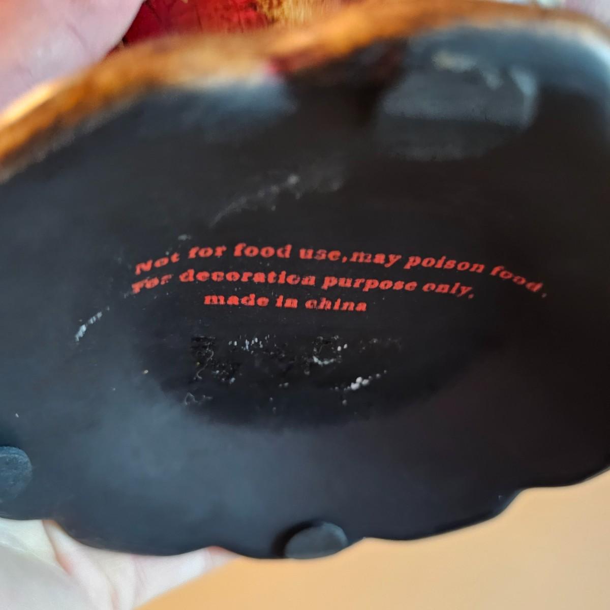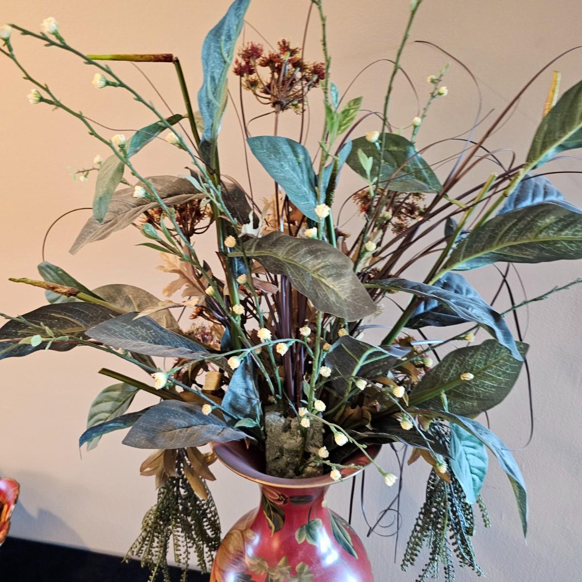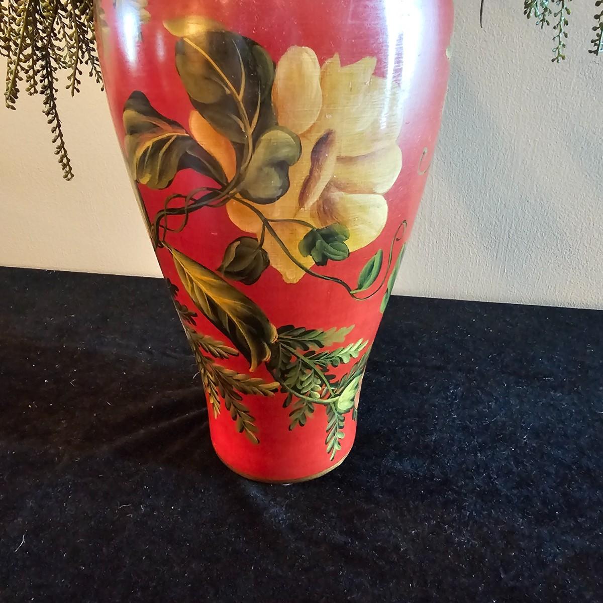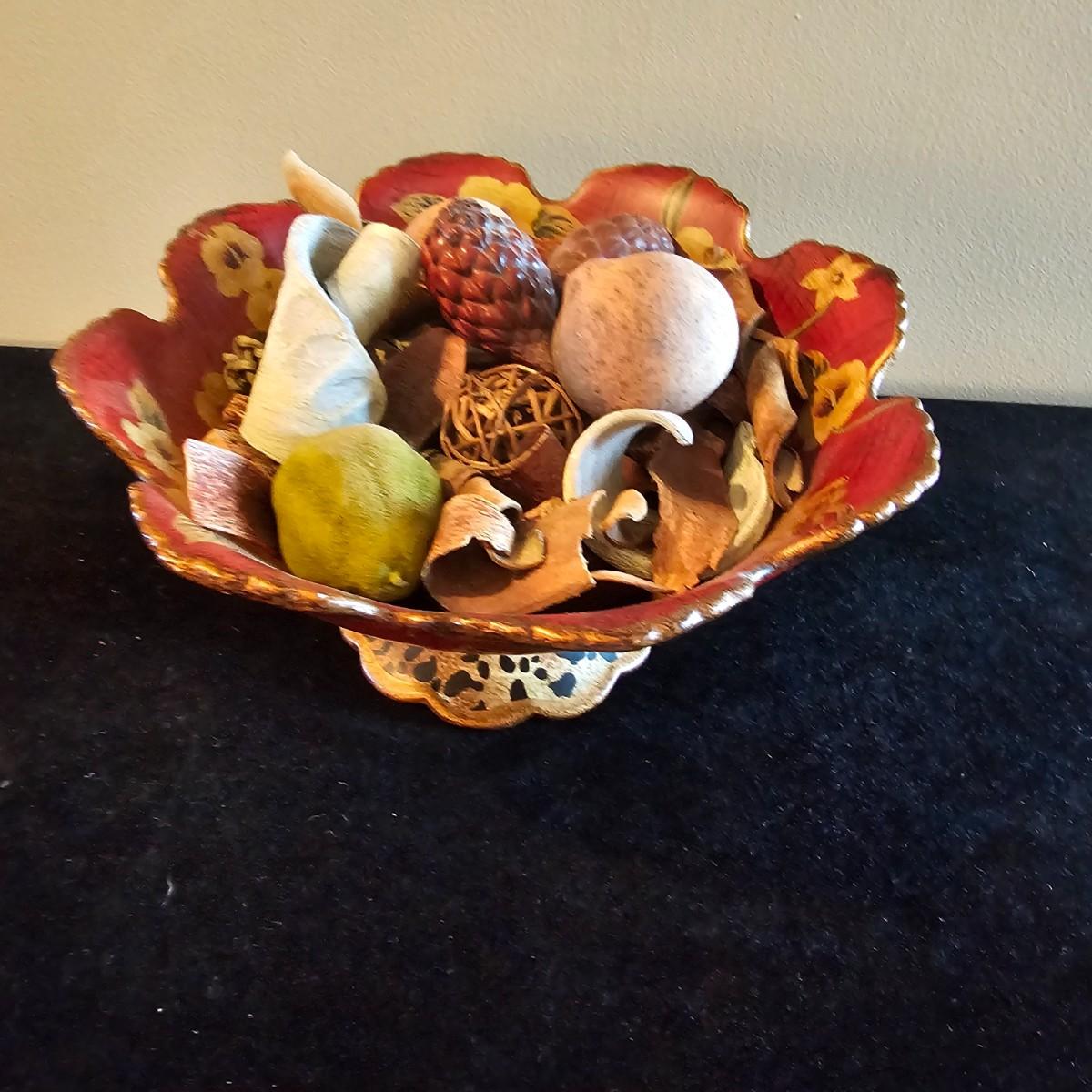 Tall vase with floral design is 6" x 17"H. With the floral piece included it is 24" x 34"H. Has dark maroon background with floral overlay. Scalloped edge bowl has matching pattern, is 12"D x 6"H. Covered dish has handles and lid, is 12" x 8" x 9"H. Pair of mosaic candleholders with metal bases, 6.5" D x 8"H. See photos for details. Local pickup only.