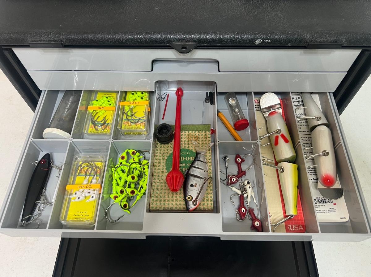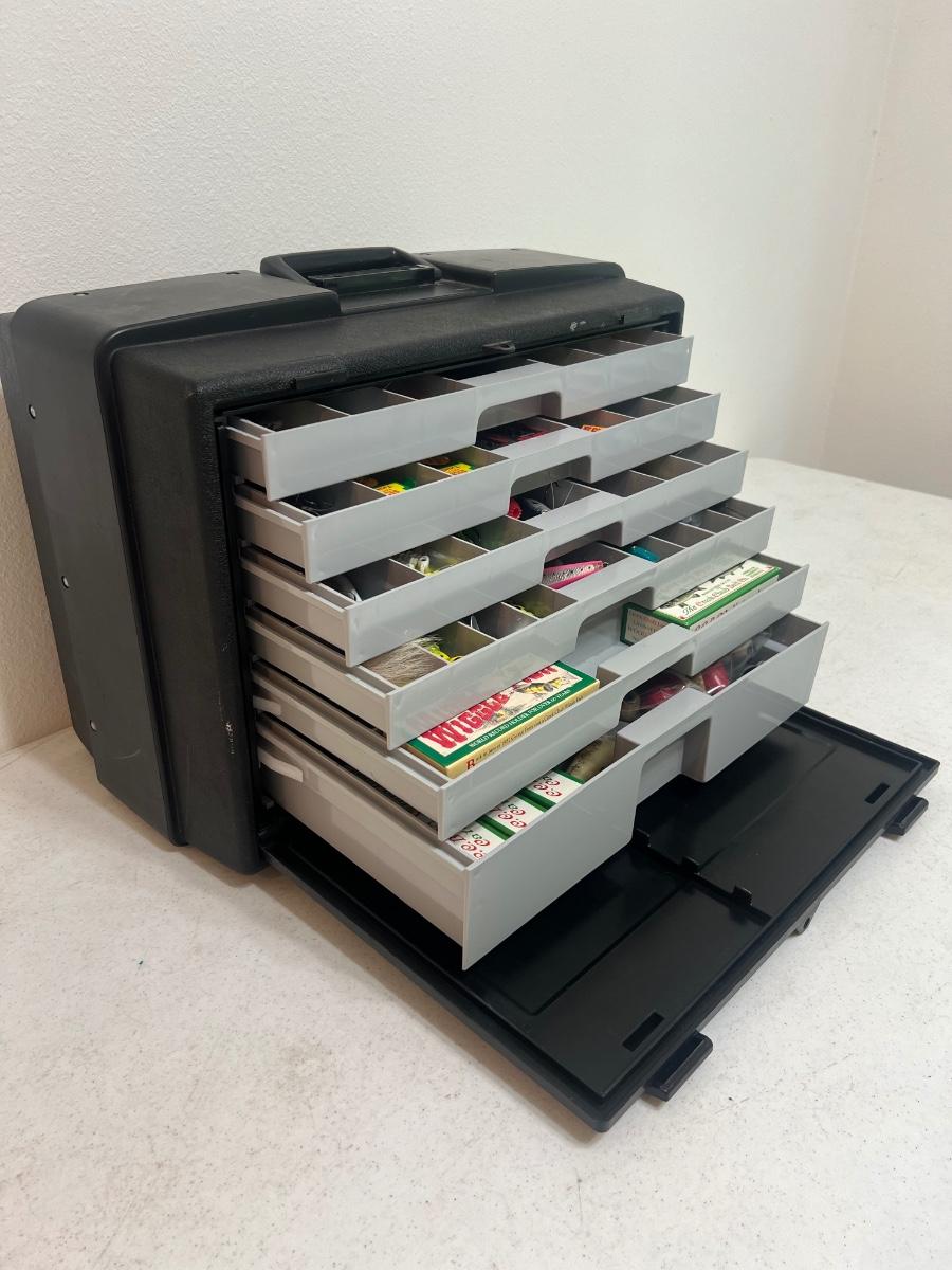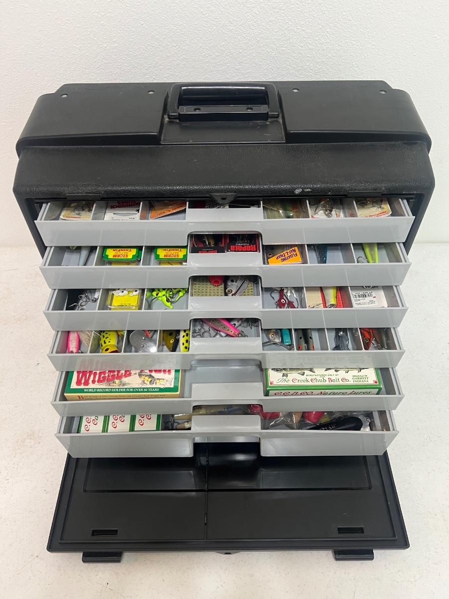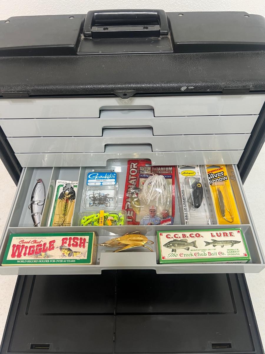 What you see is what you get. Tackle box full of a variety of tackle. Table not included.