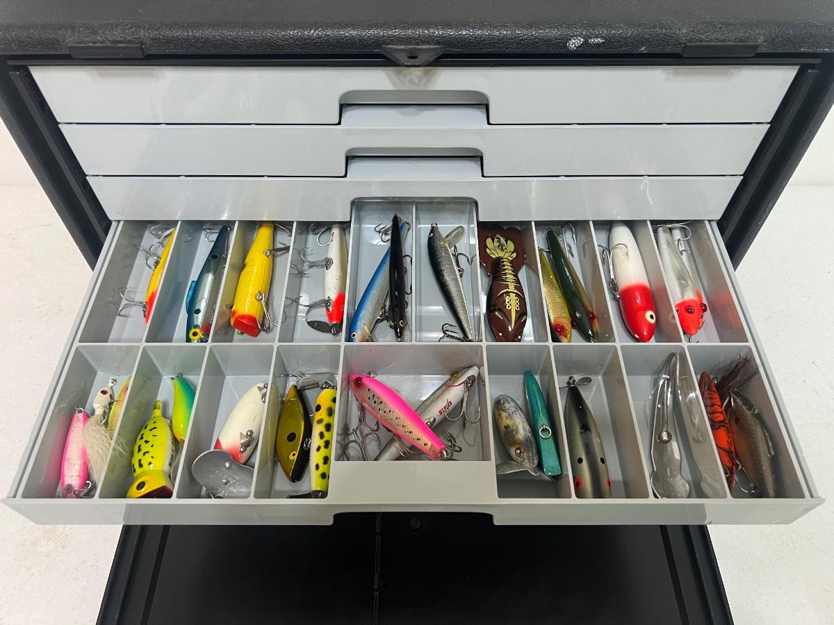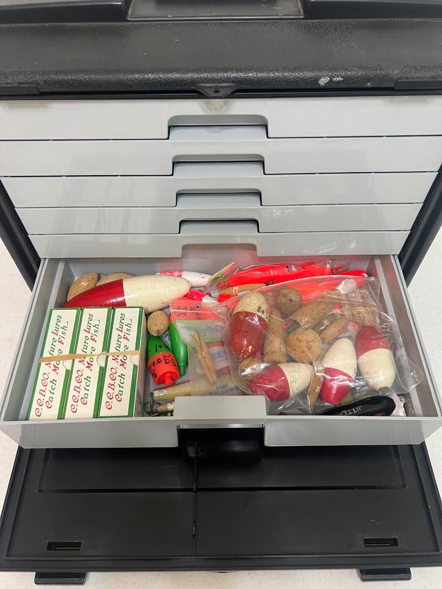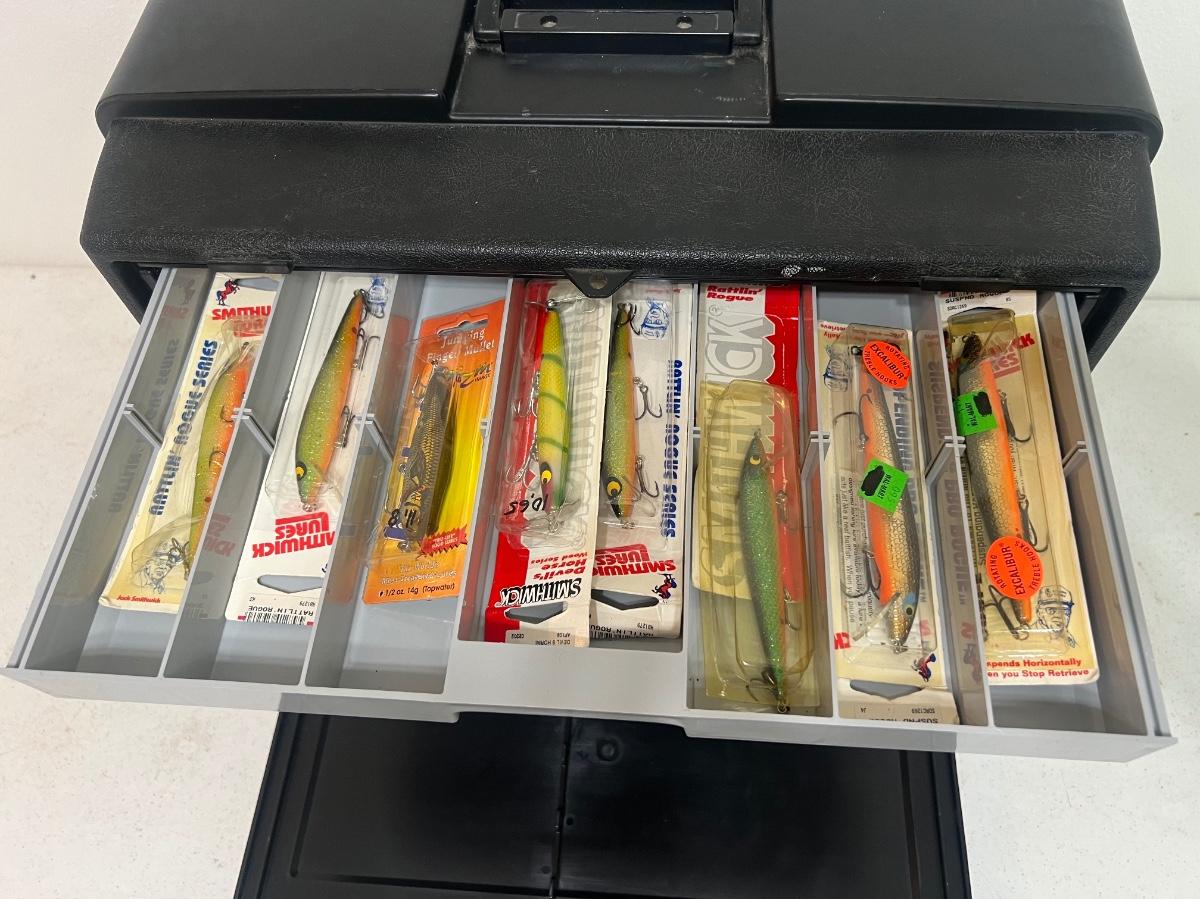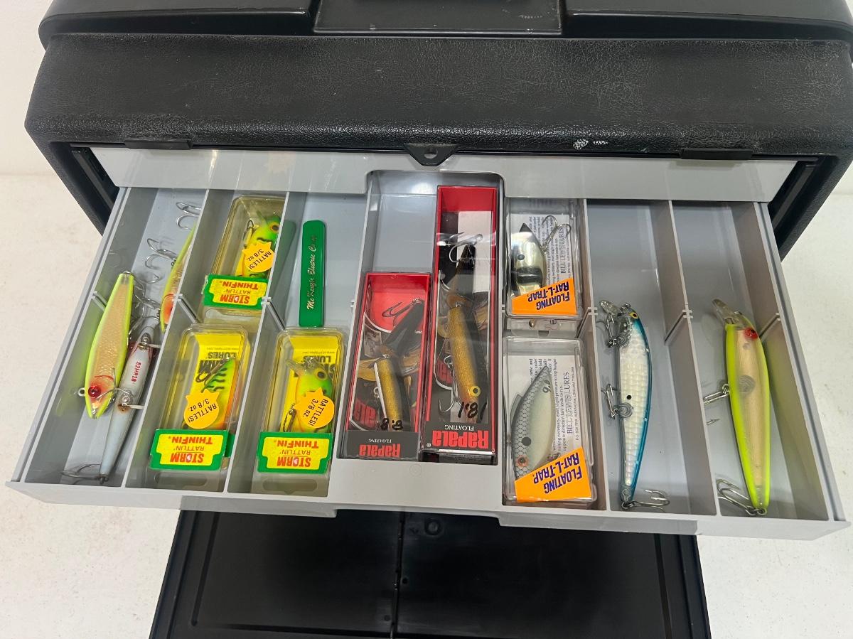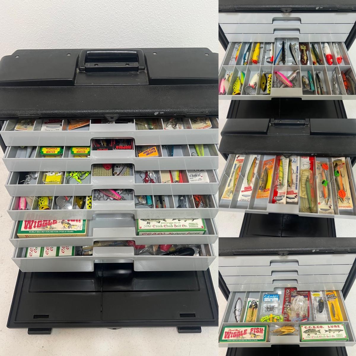 What you see is what you get. Tackle box full of a variety of tackle. Table not included.