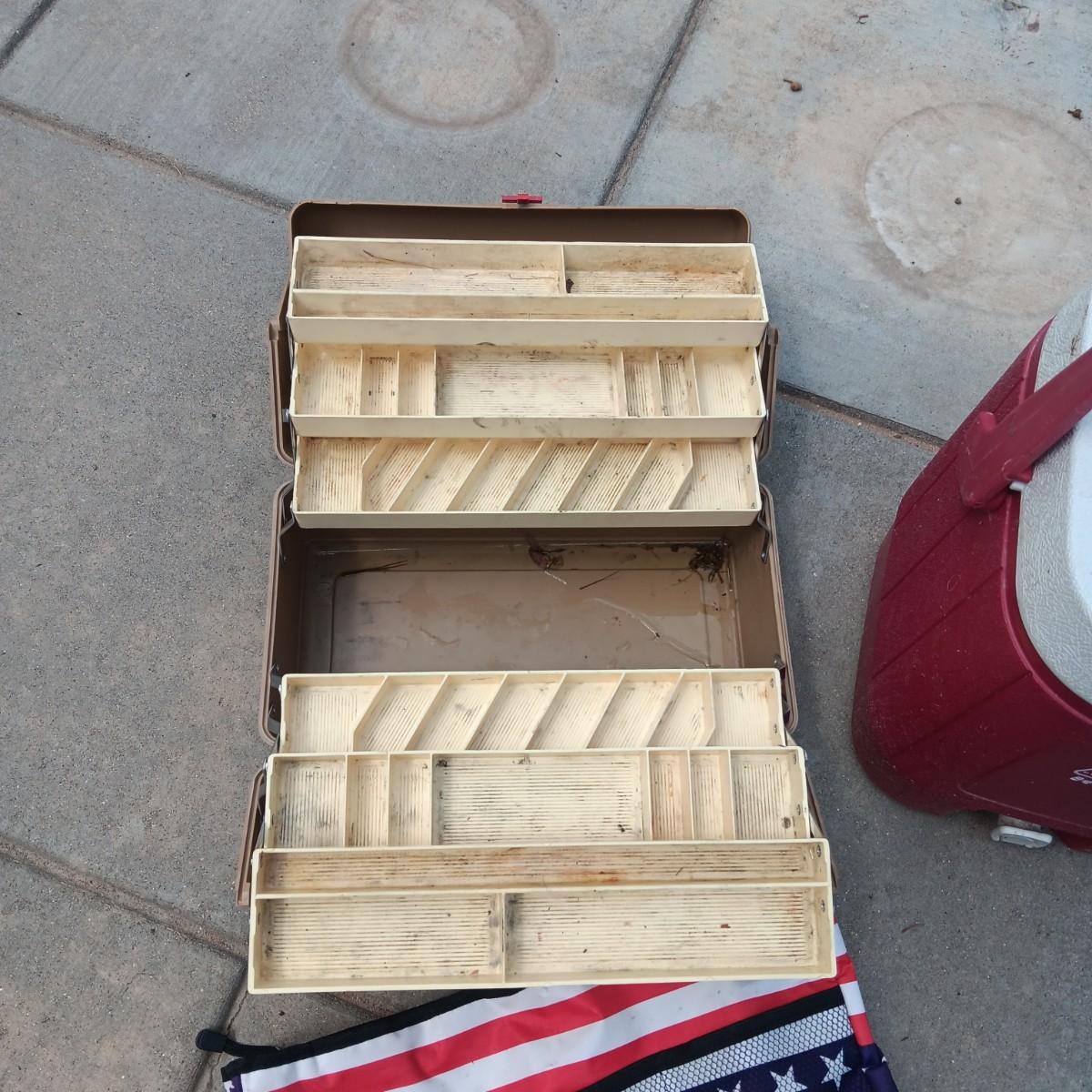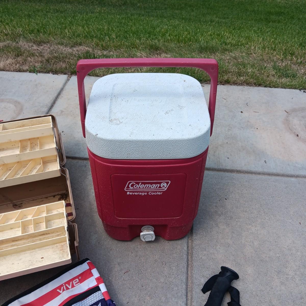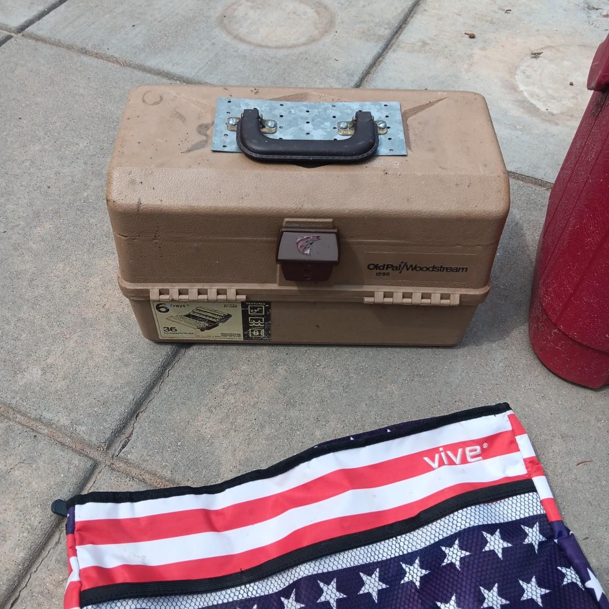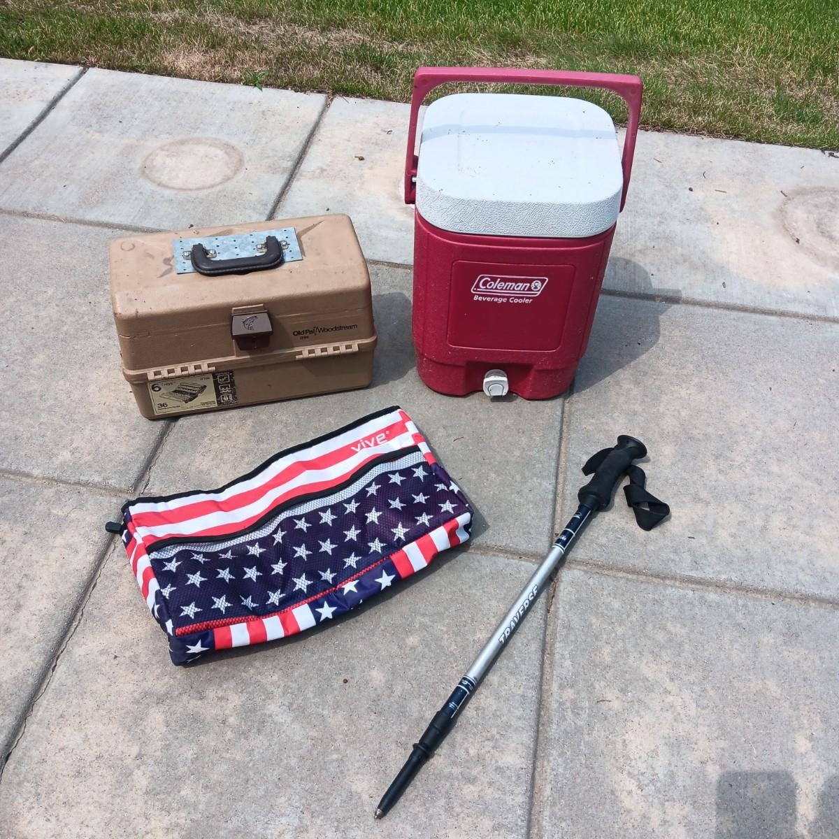 TACKLE BOX, BEVERAGE COOLER, TRAVERSE WALKING STICK AND BAG