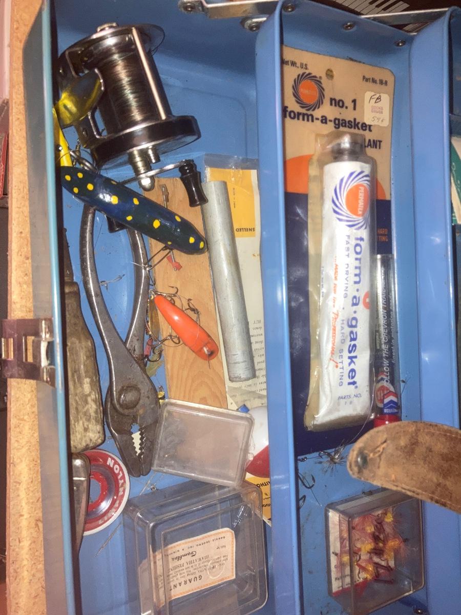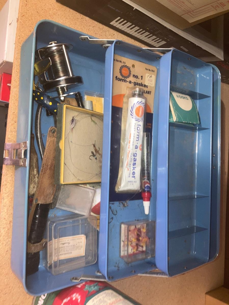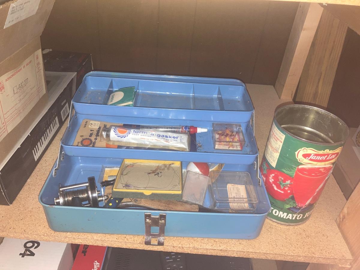 TACKLE BOX WITH SOME FISHING ITEMS AND SOME HARDWARE