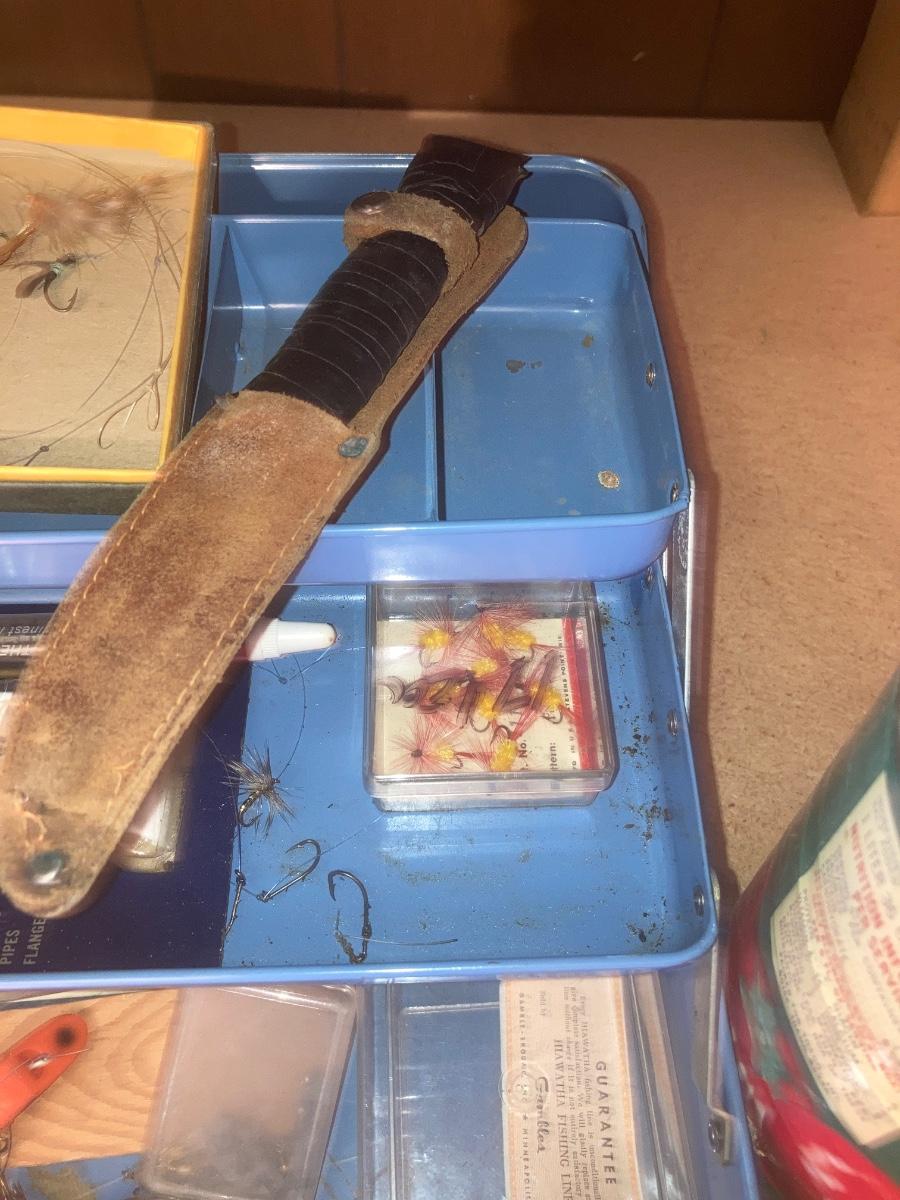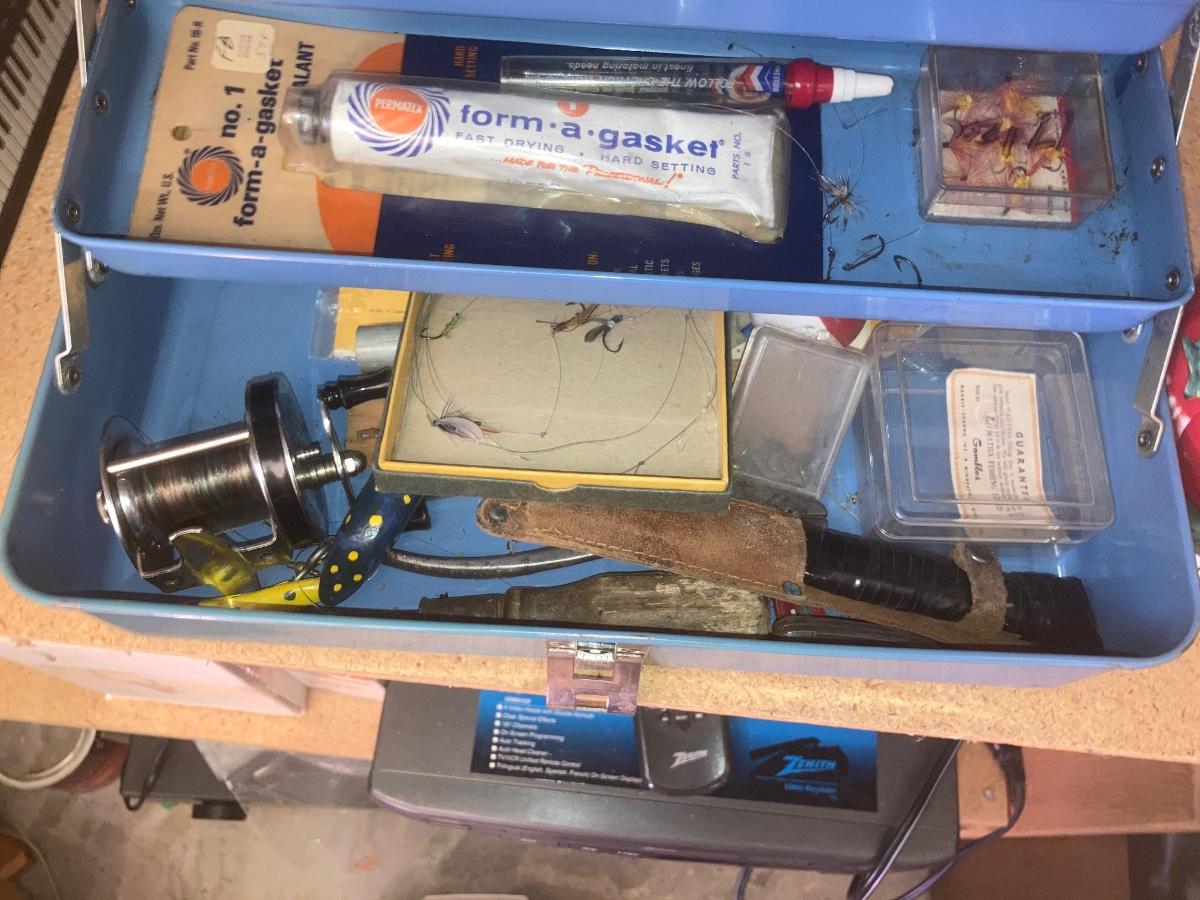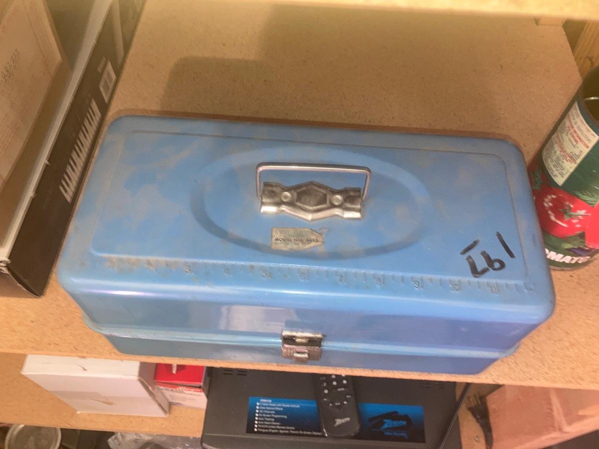 TACKLE BOX WITH SOME FISHING ITEMS AND SOME HARDWARE